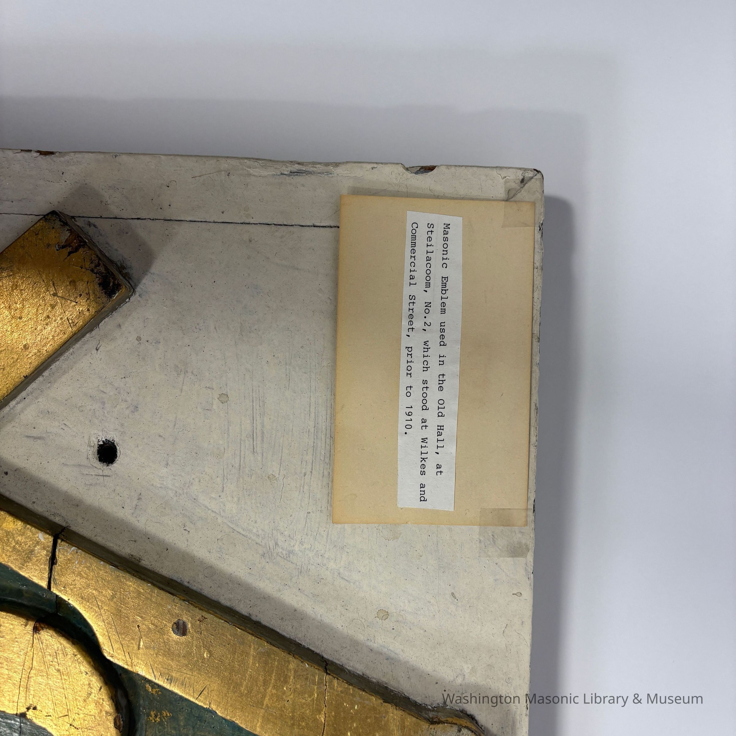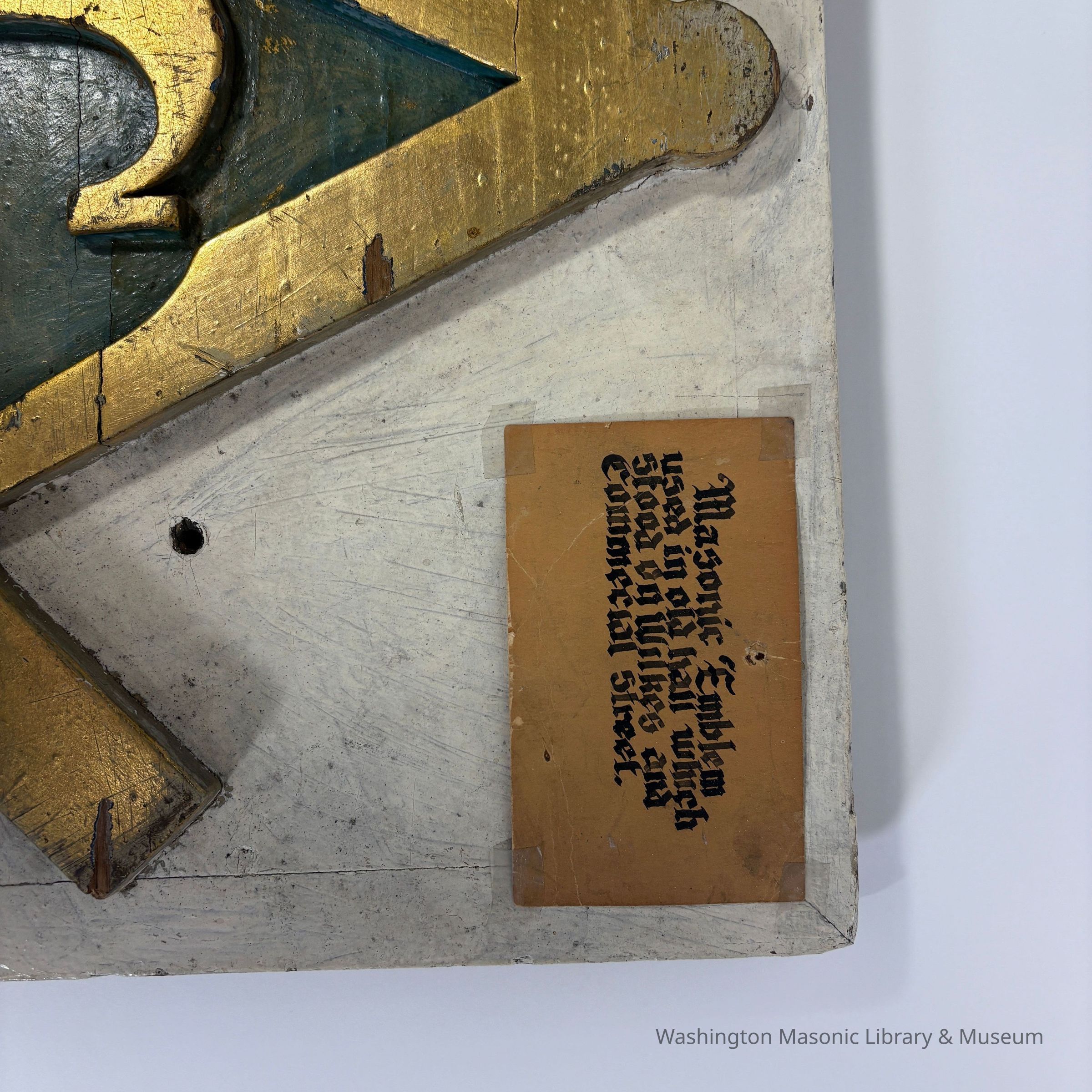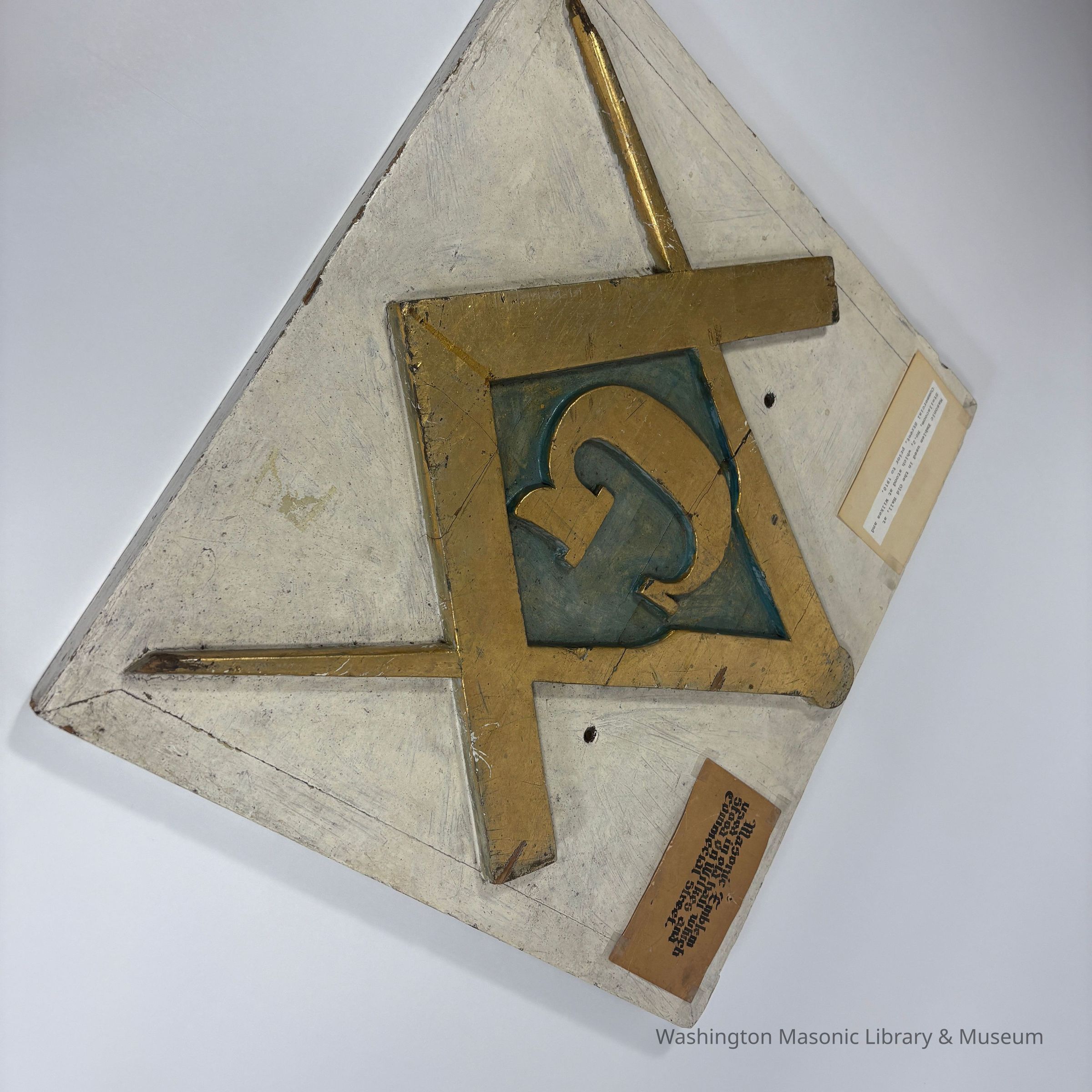 Plaque: Masonic Emblem. Square and Compass used in the old hall at Steilacoom No.2 , which stood at Wilkes and Commercial Street, prior to 1910. Puyallup, Washington. Likeliest timeframe: 1872-1910 (based on historical notes in accession folder)Made/Created