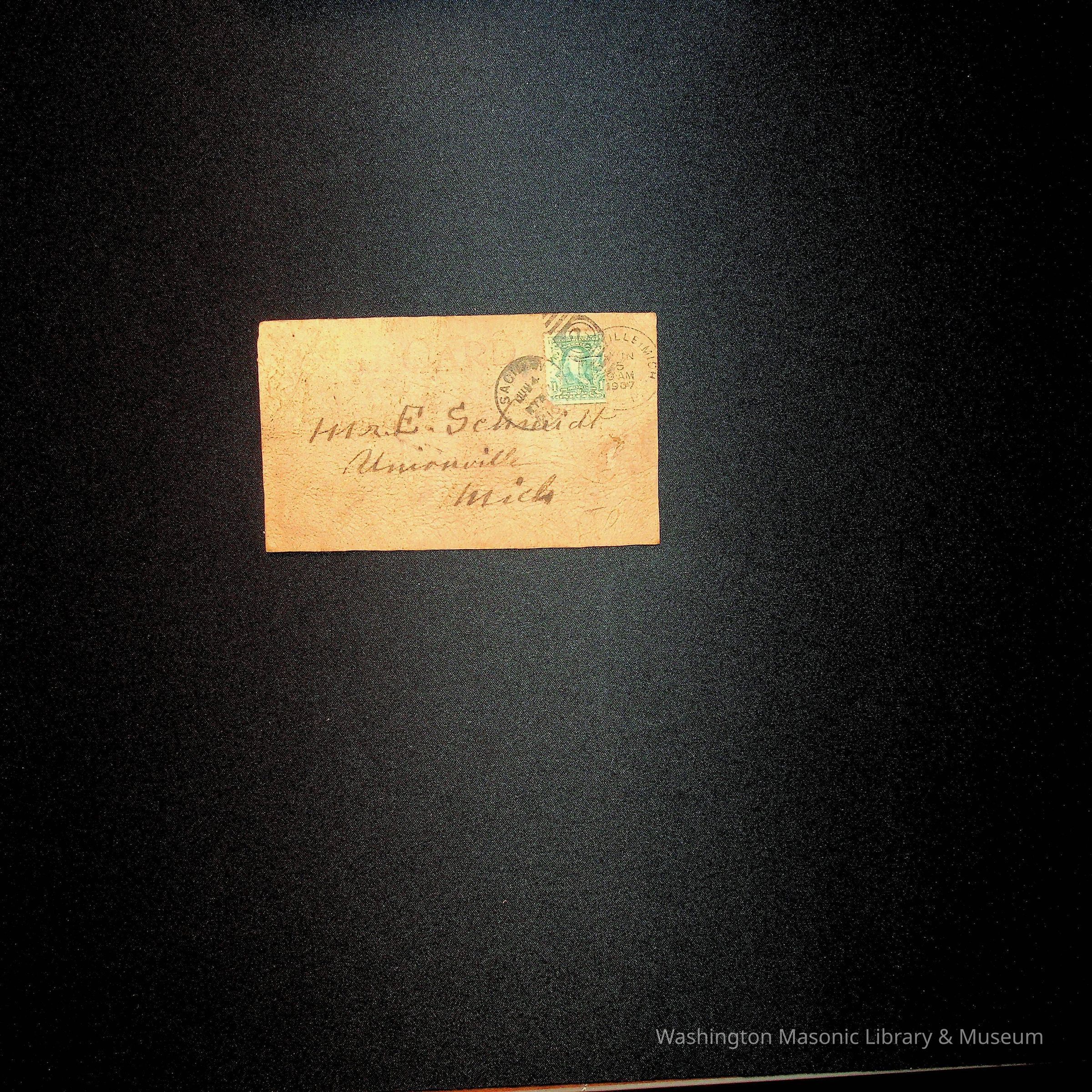 Post Card: Leather "May Every Brother Learn to Live Within the Square and Compass" 1907. Addressed to "Mr. E. Schmidt, Unionville, Michigan. One cent stamp on the backside featuring Ben FranklinCollection