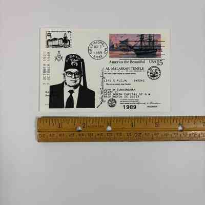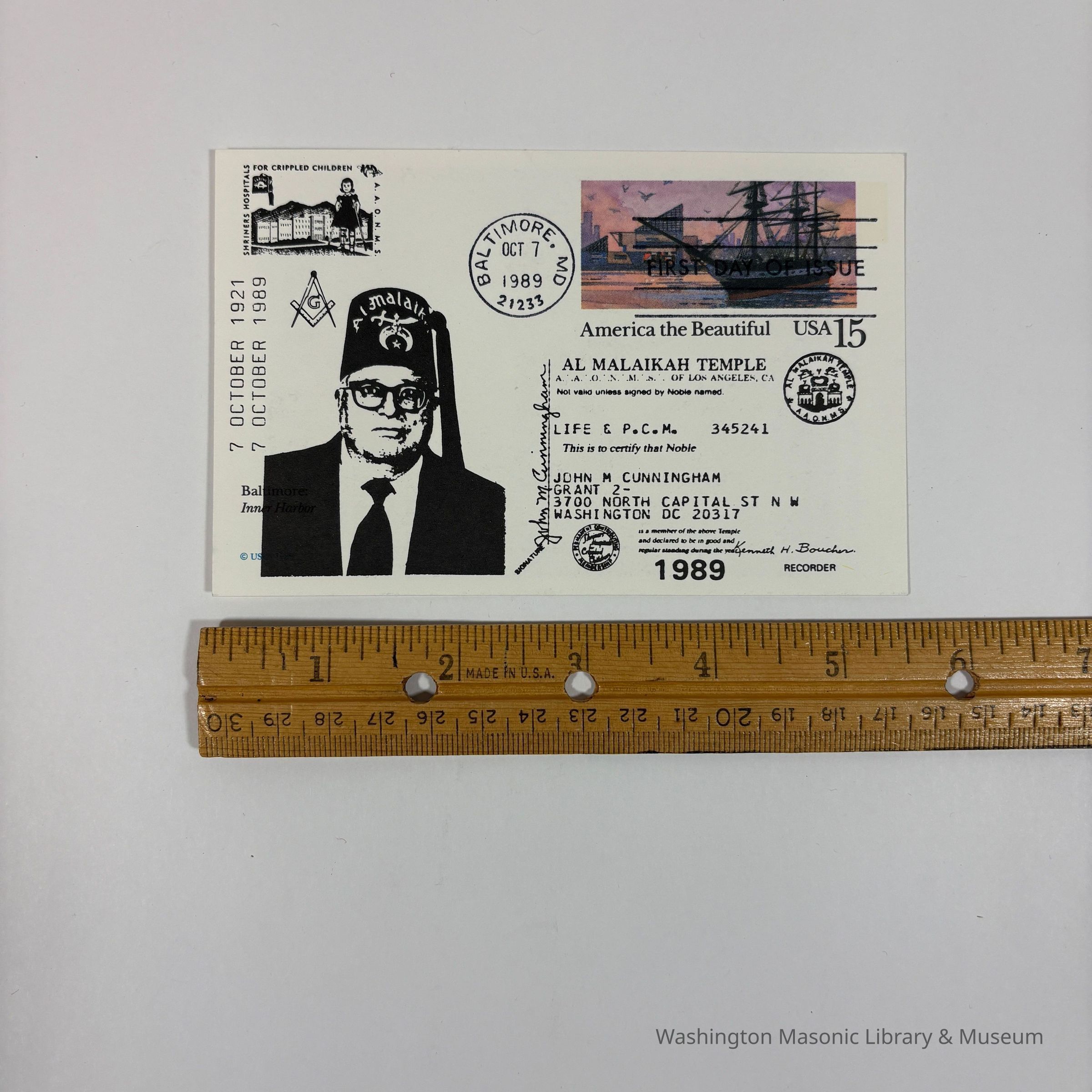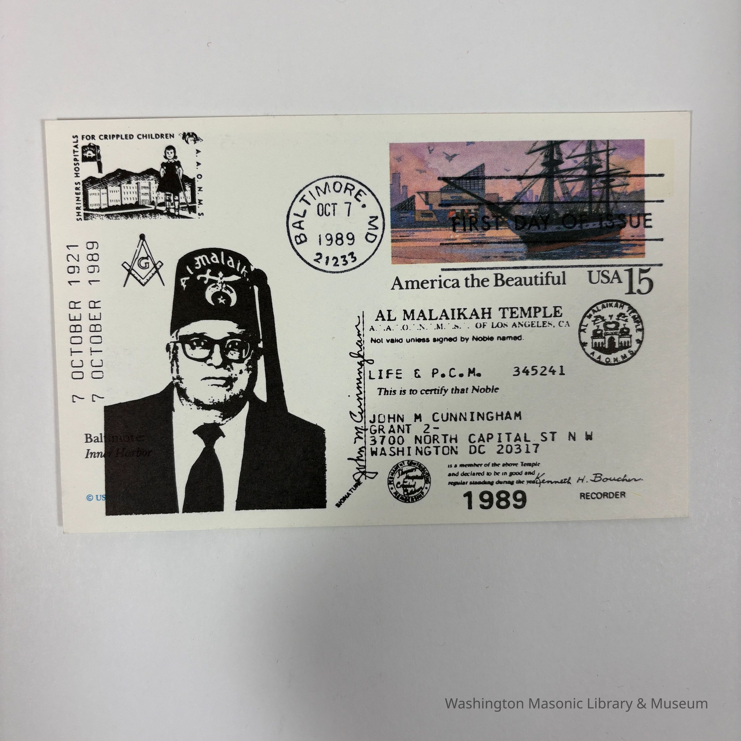Postcard: Created for centennial of Al Malaikah Shrine formation in Lost Angeles, California (1888-1898). Displaying information on Al Malaikah Temple No.40 "First Day of Issue" October 7, 1989.