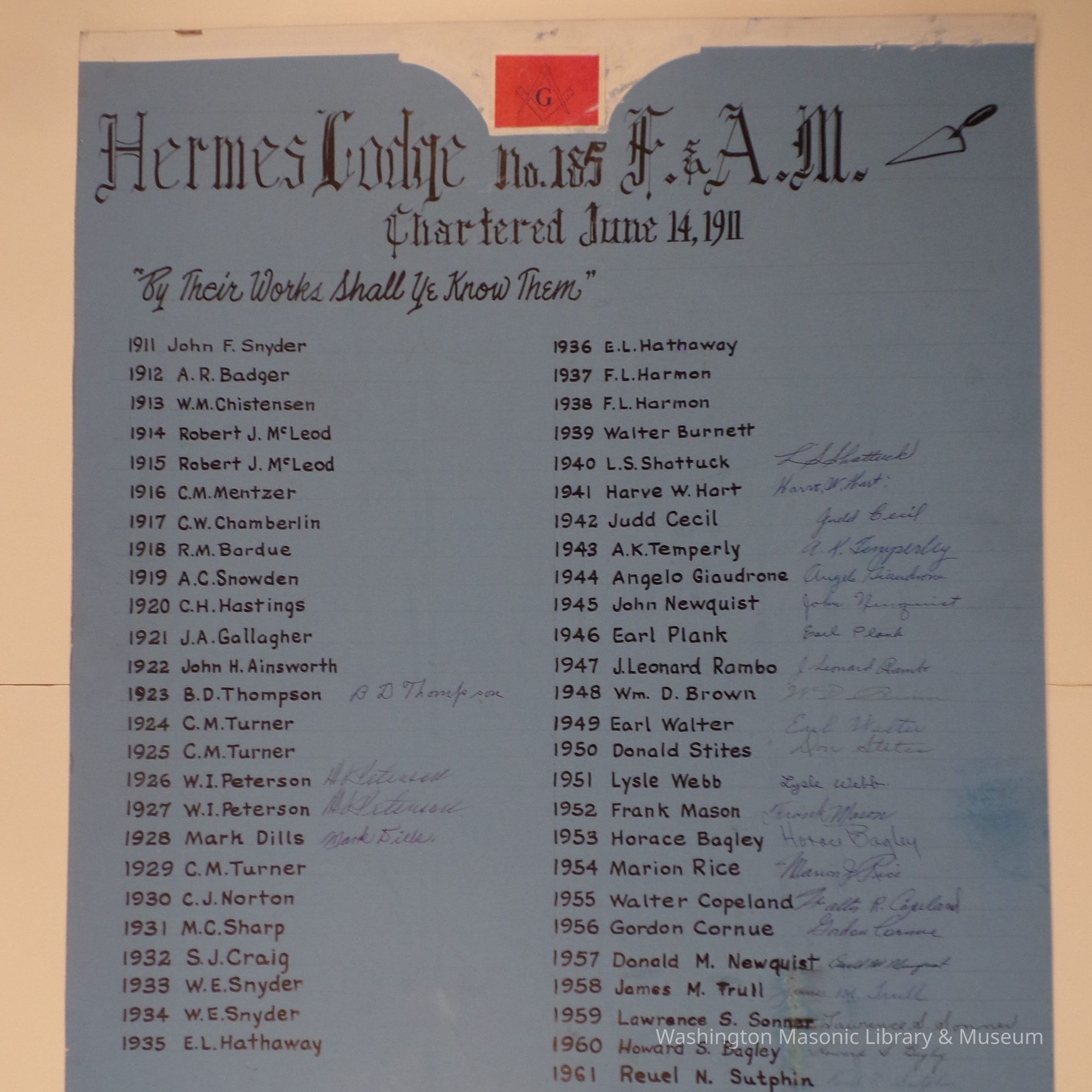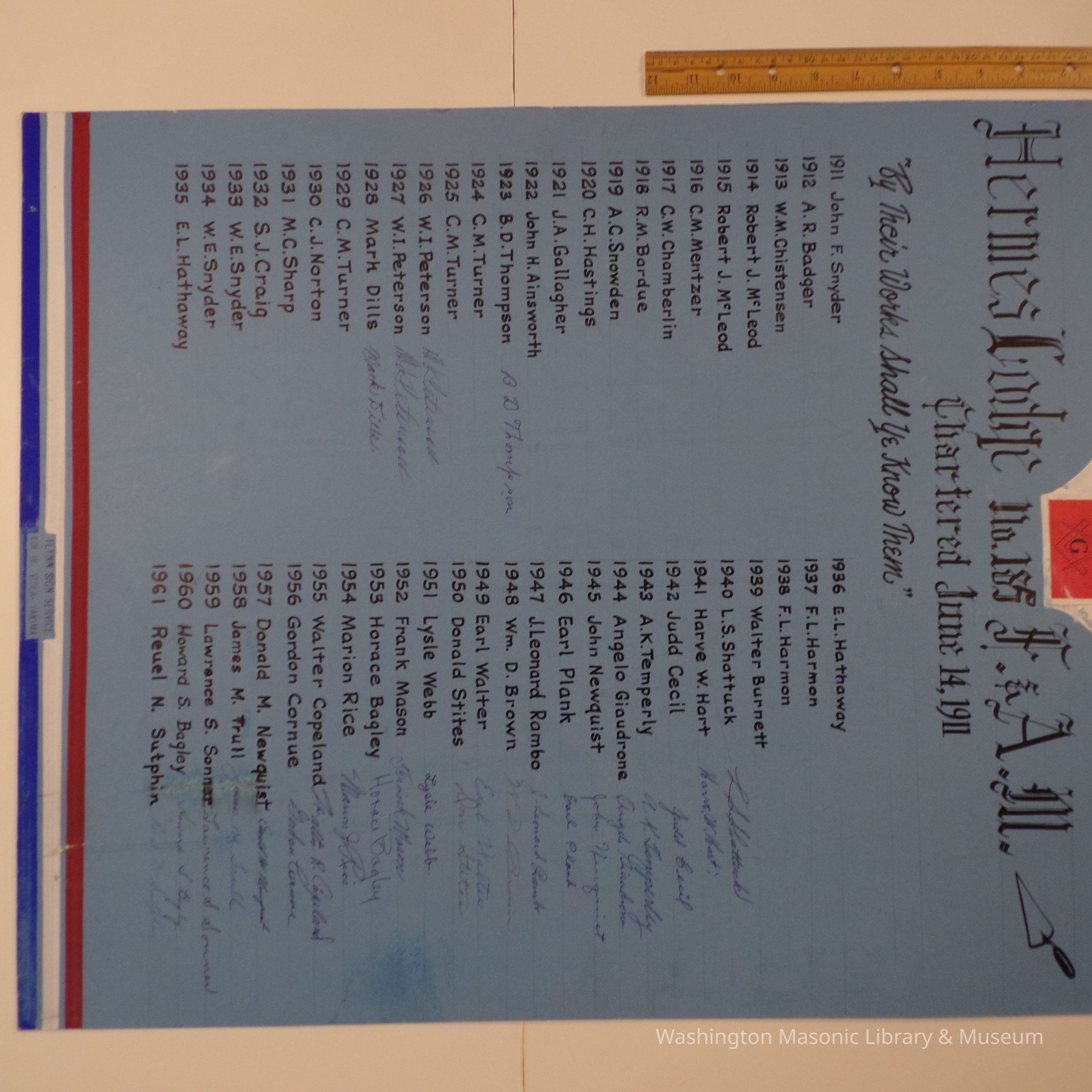 Poster: Cardboard. "Hermes Lodge No. 185 Chartered June 14, 1911." contains a list of names, (presumably masters?) dating 1911-1961. half of which have signatures.Collection