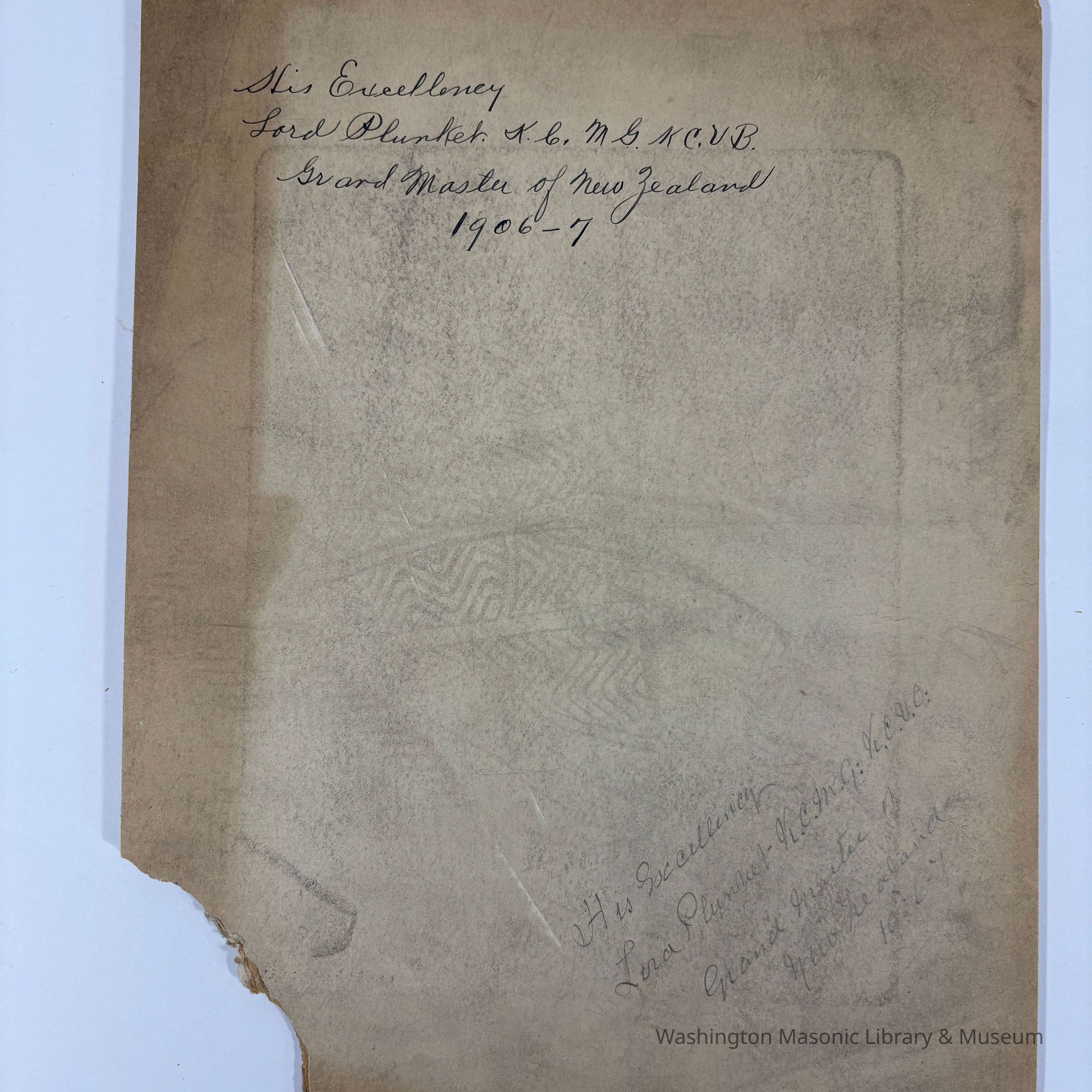 Print: On matboard. "His Excellency Lord Plunket. K.C. M.G. K.C. V.B., Grand Master of New Zealand (1906-1907).Collection