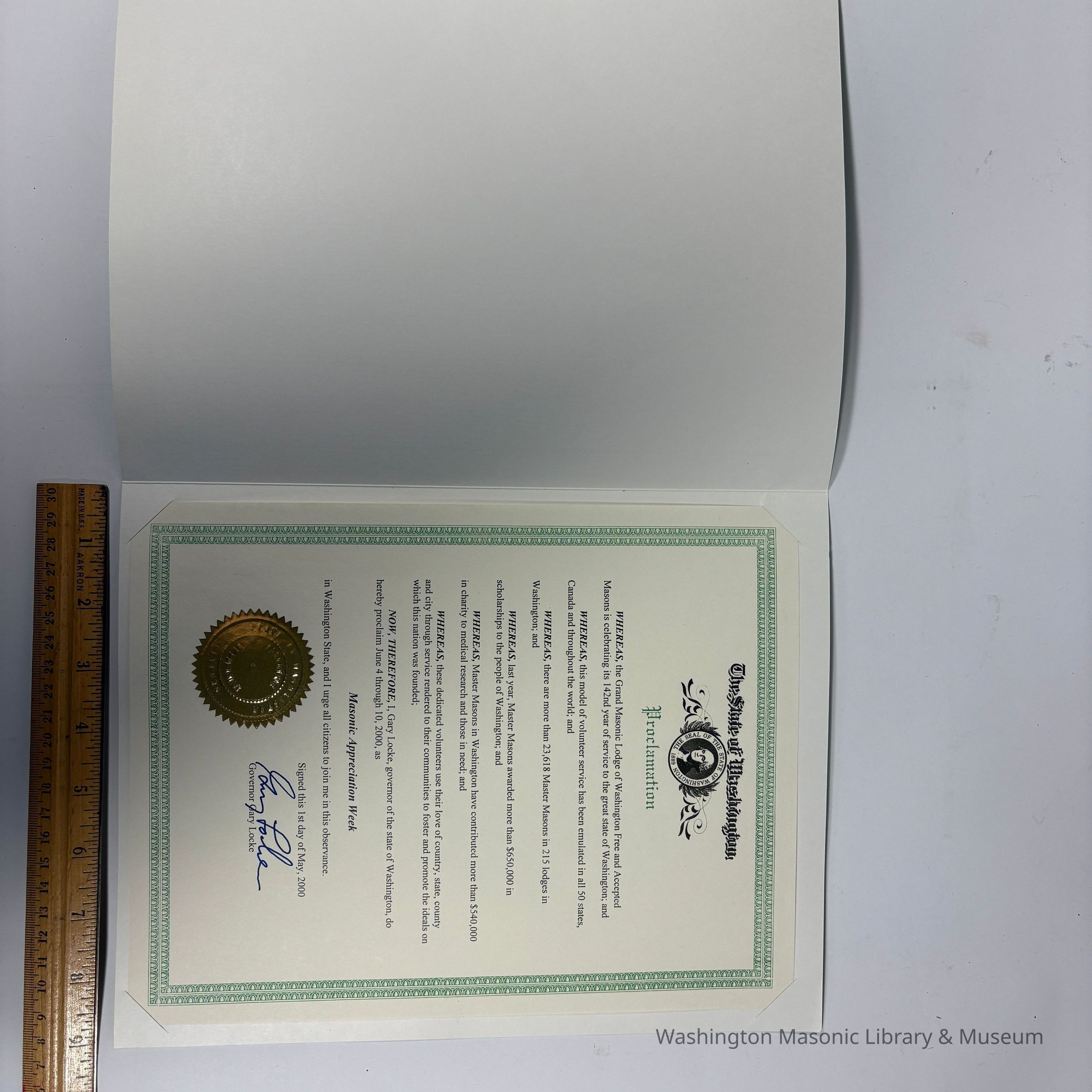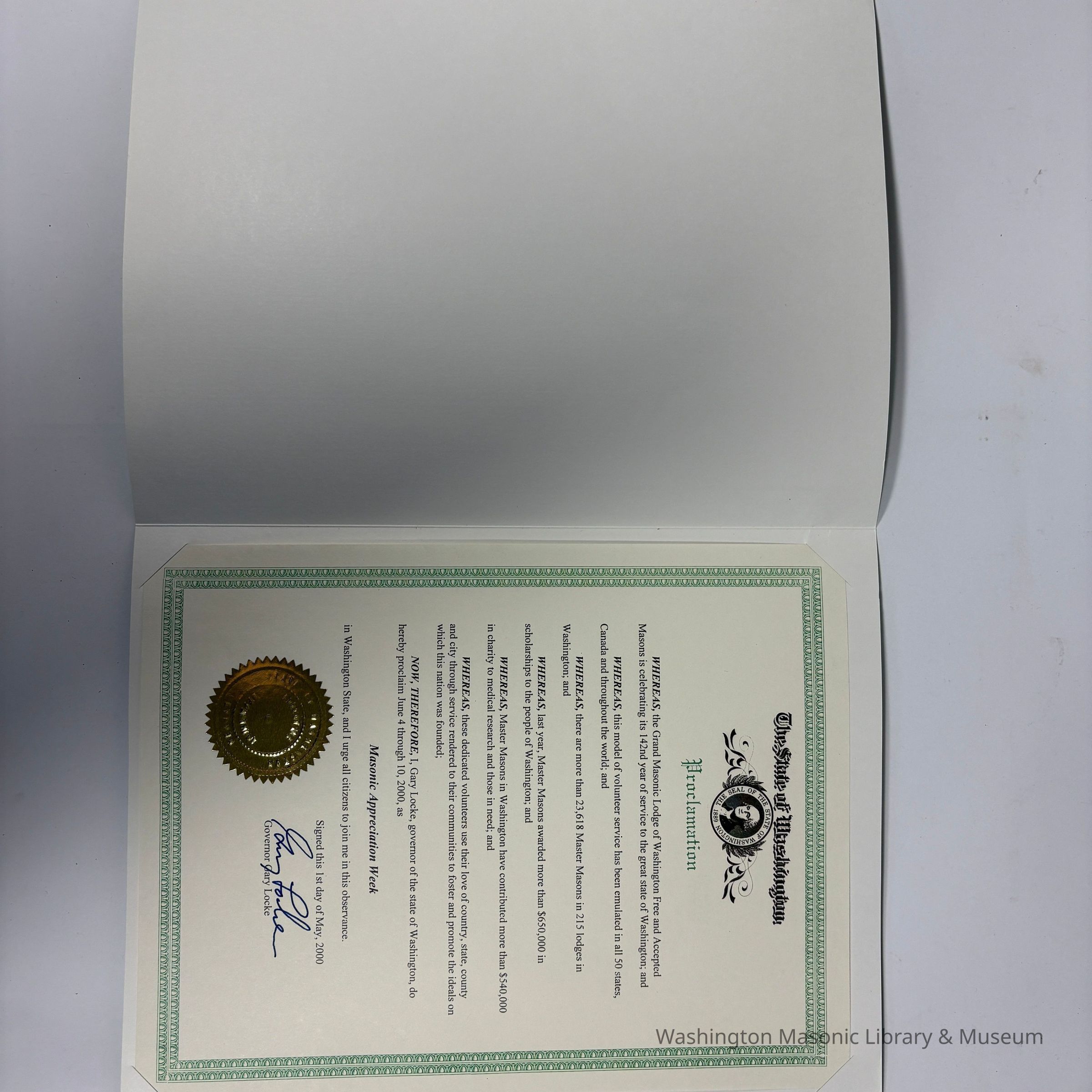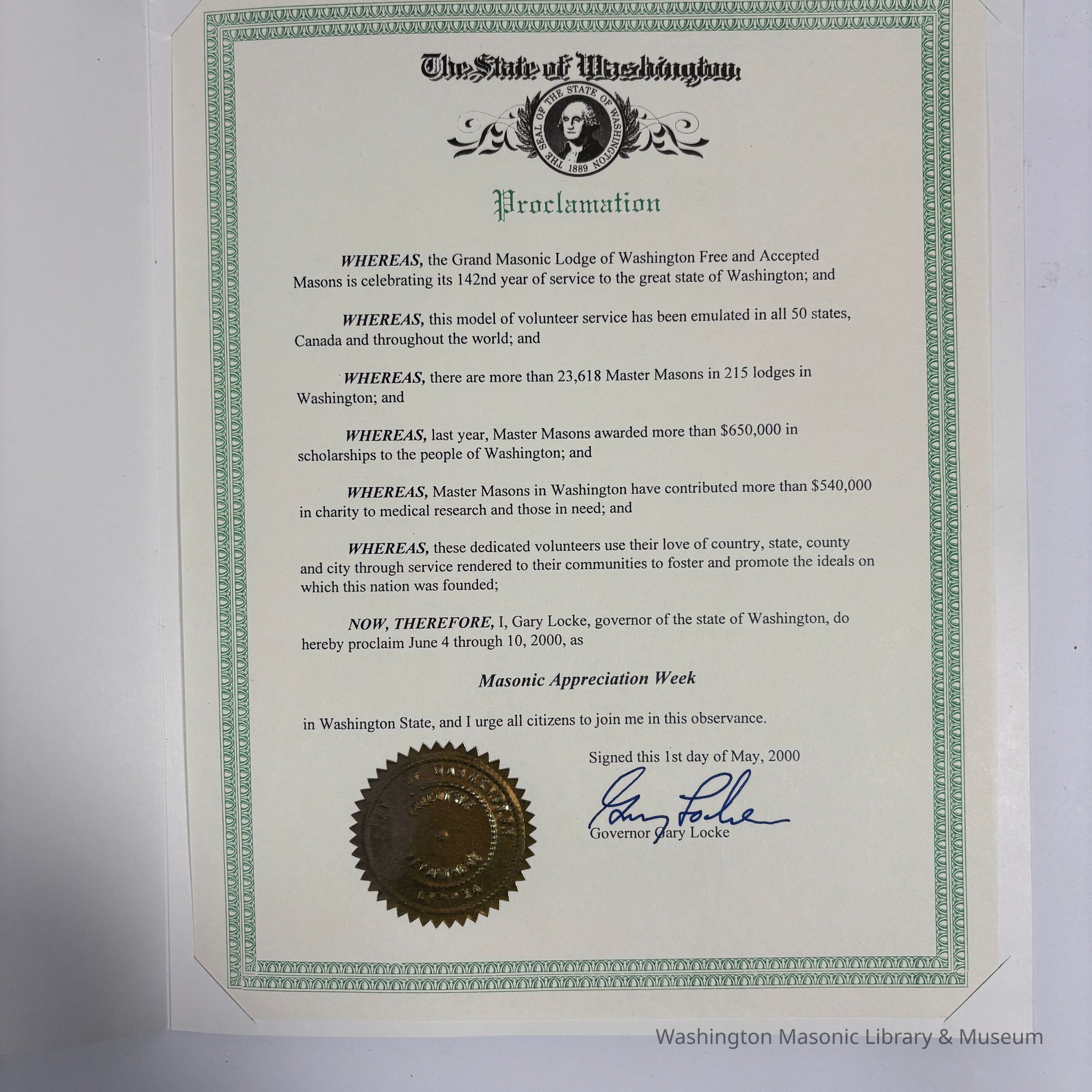 "Now, Therefore, I, Gary Locke, governor of the state of Washington, do hereby proclaim June 4 through 10, 2000, as Masonic Appreciation Week in Washington State, and I urge all citizens to join me in this observance. Signed this 1st day of May, 2000."Collection