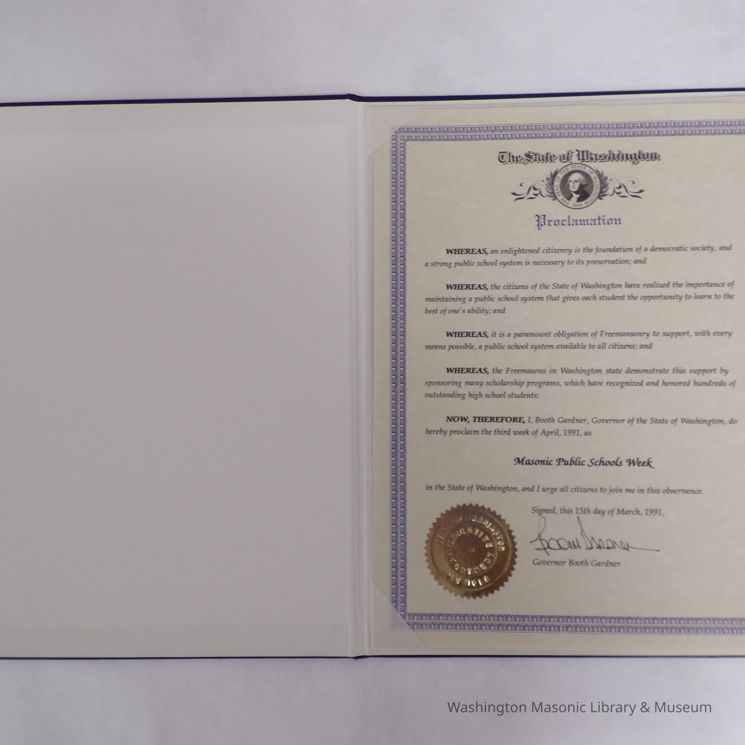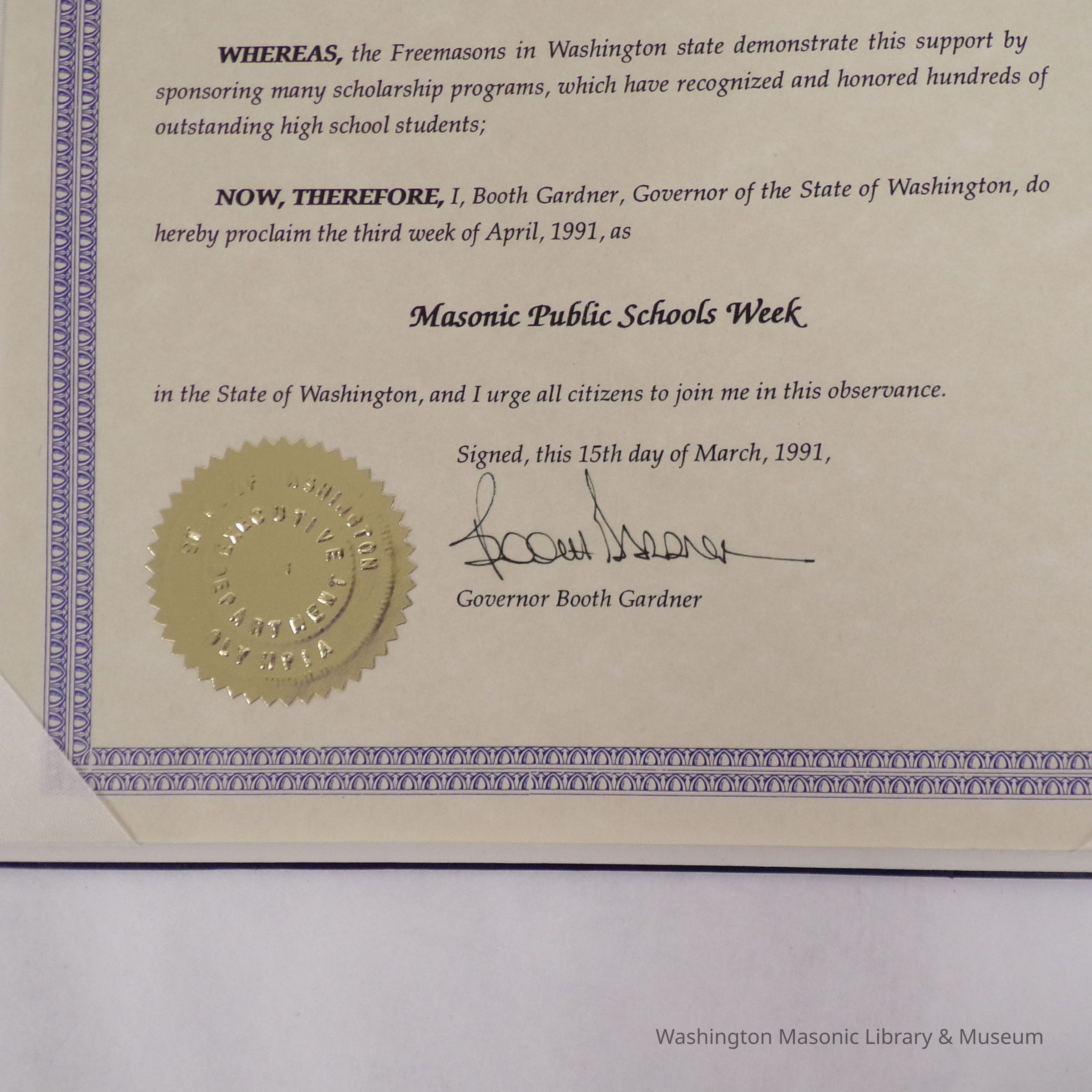 Proclamation: Governor Booth Gardner of the State of Washington proclaims the third week of April 1991 as Masonic Public School's Week.
