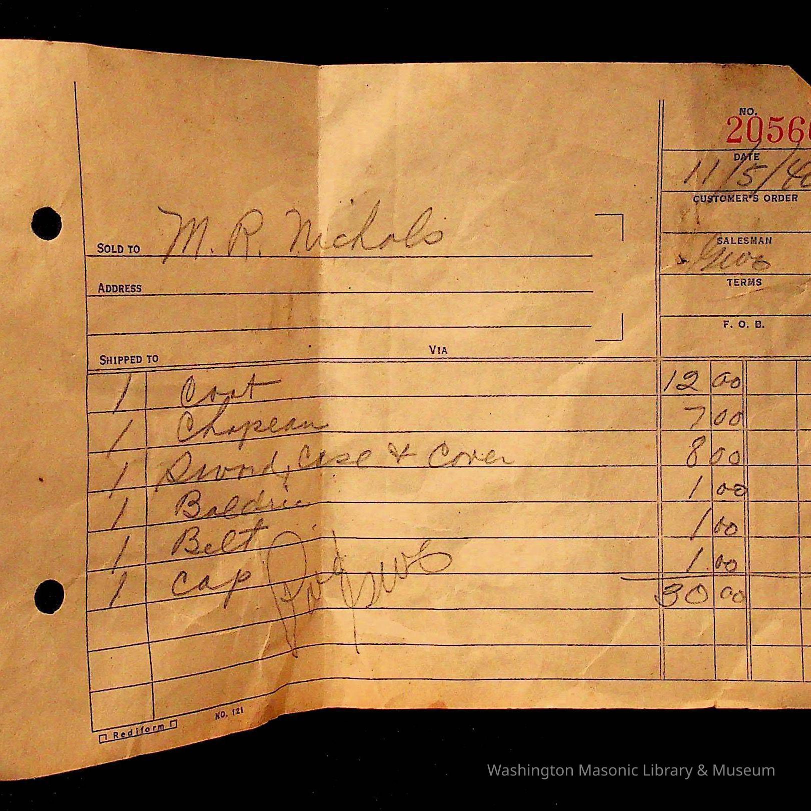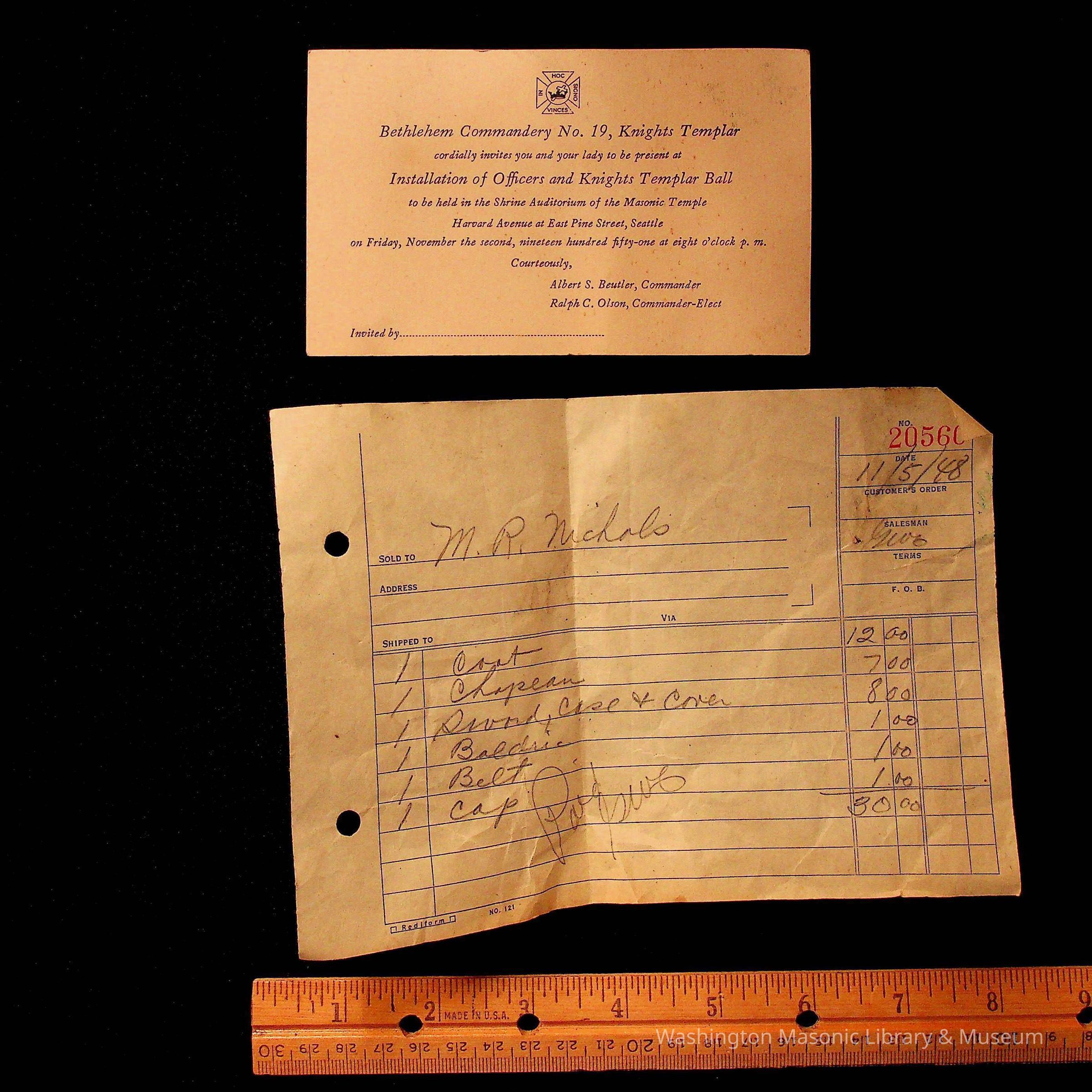 Receipt: "M.R. Nichols" For one Knights Templar Uniform (1948)Entry/Object ID
