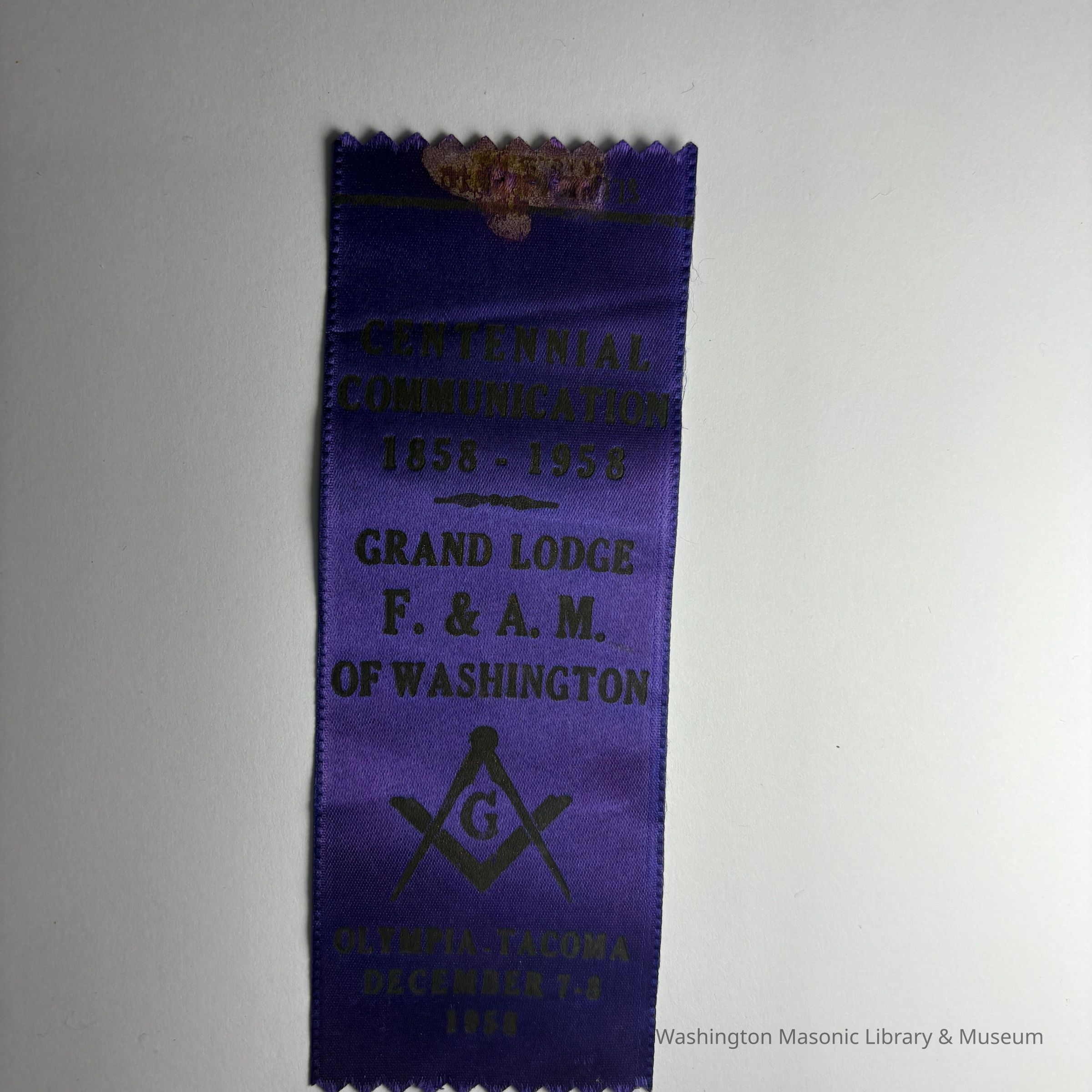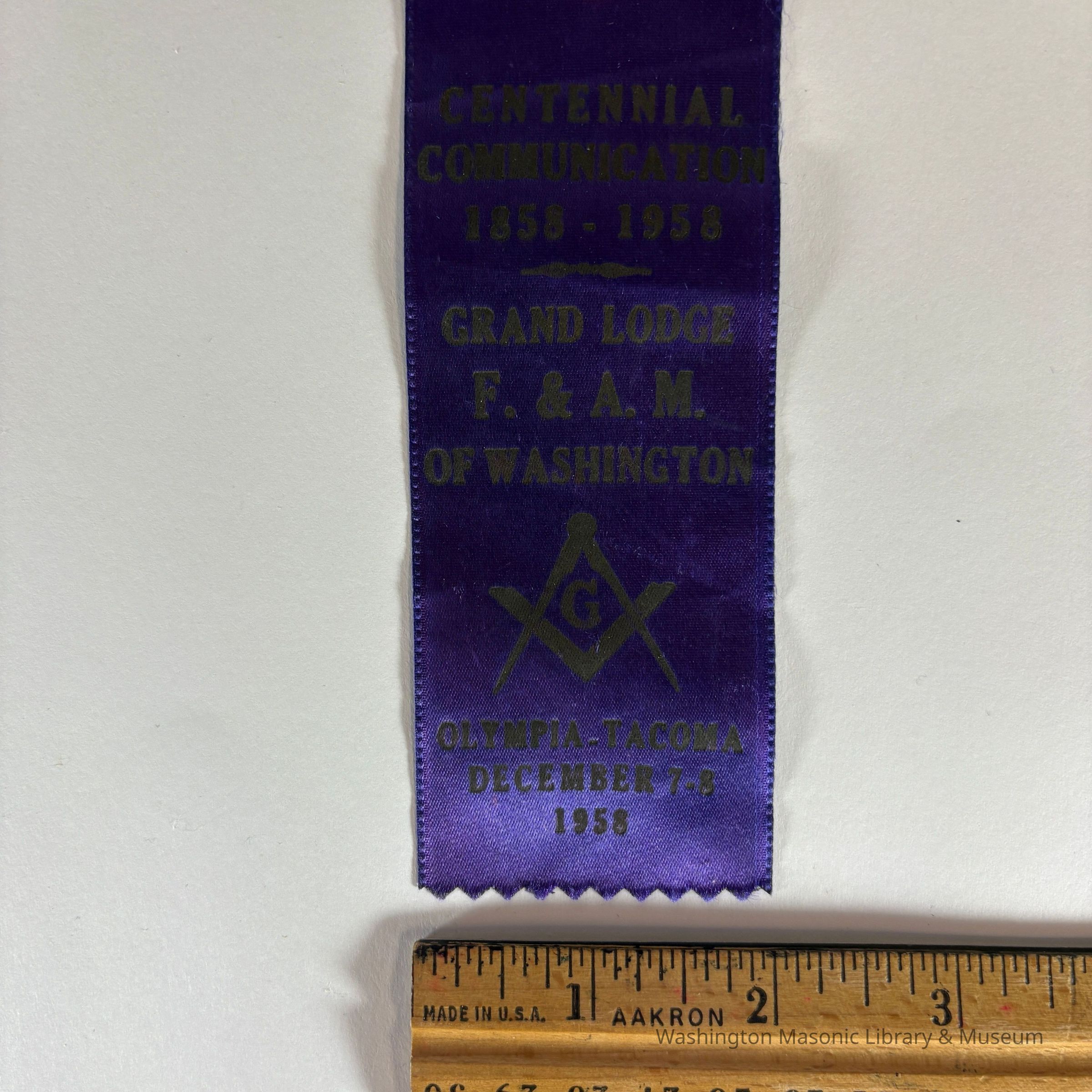 Ribbon: Purple with brown lettering. "Centennial Communication 1858-1958/Grand Lodge F.&A.M. of Washington/Olympia-Tacoma, December 7-8, 1958"Dimensions