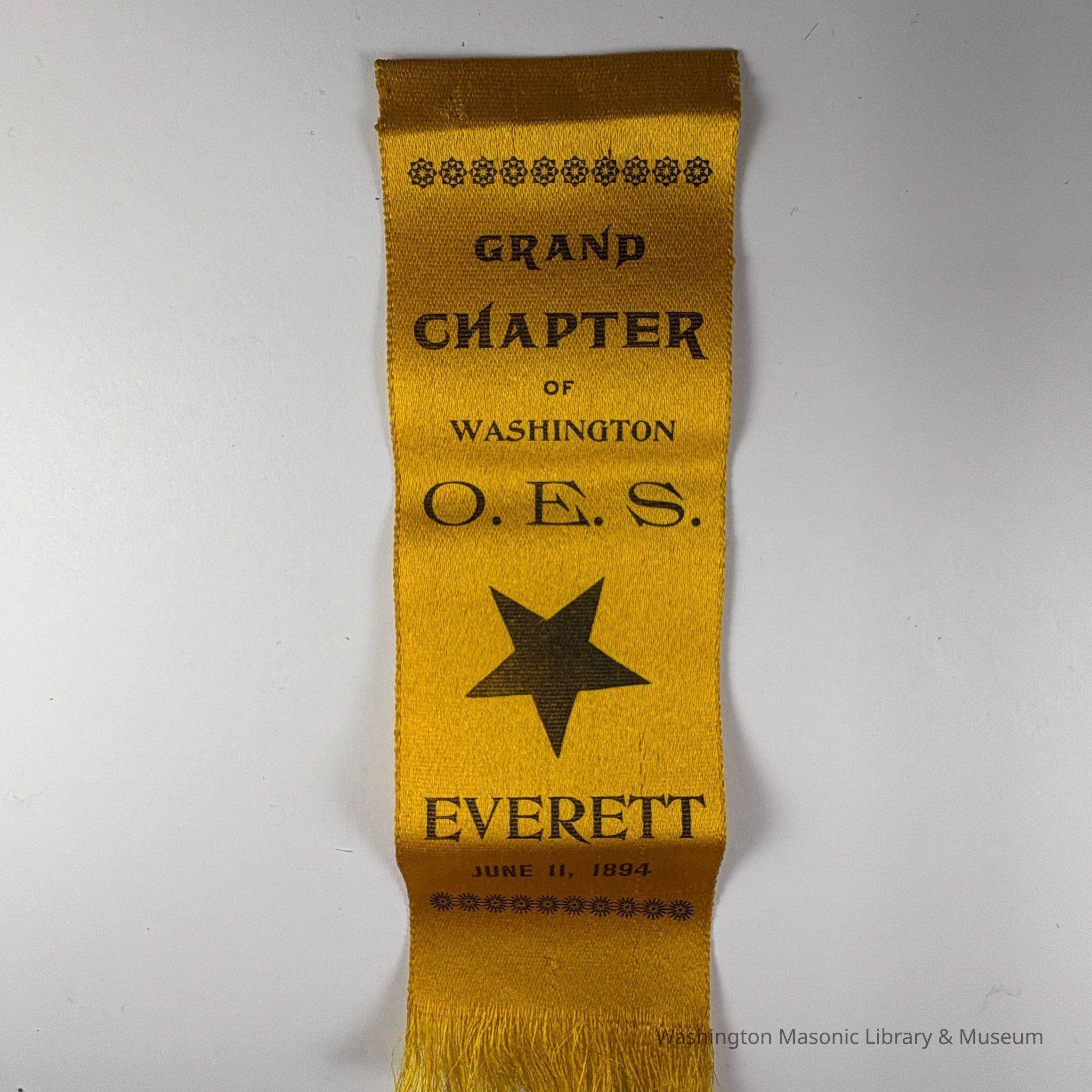 Ribbon: Yellow with Brown lettering. "Grand Chapter of Washington O.E.S./ Everett/ June 11, 1894" (1916)Collection