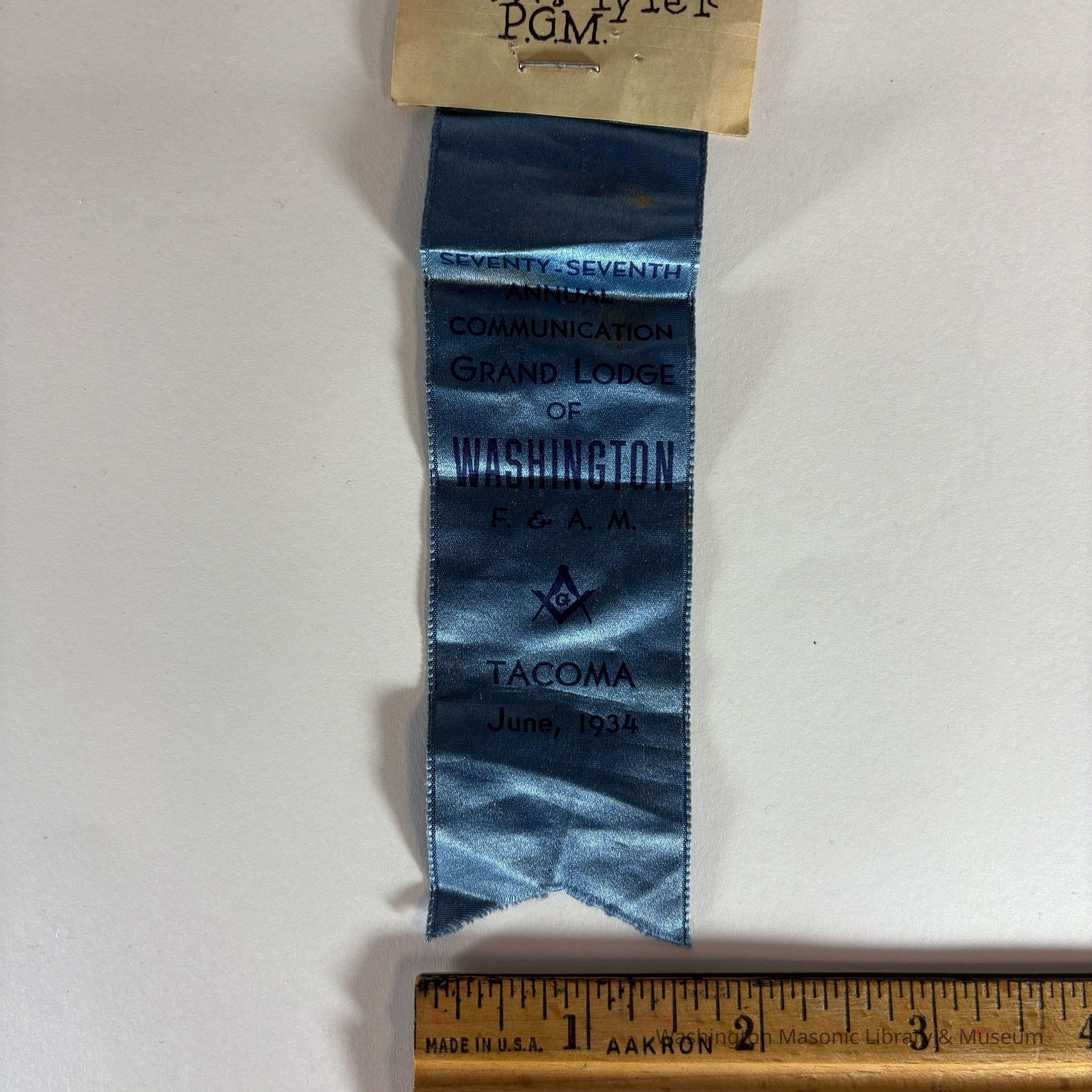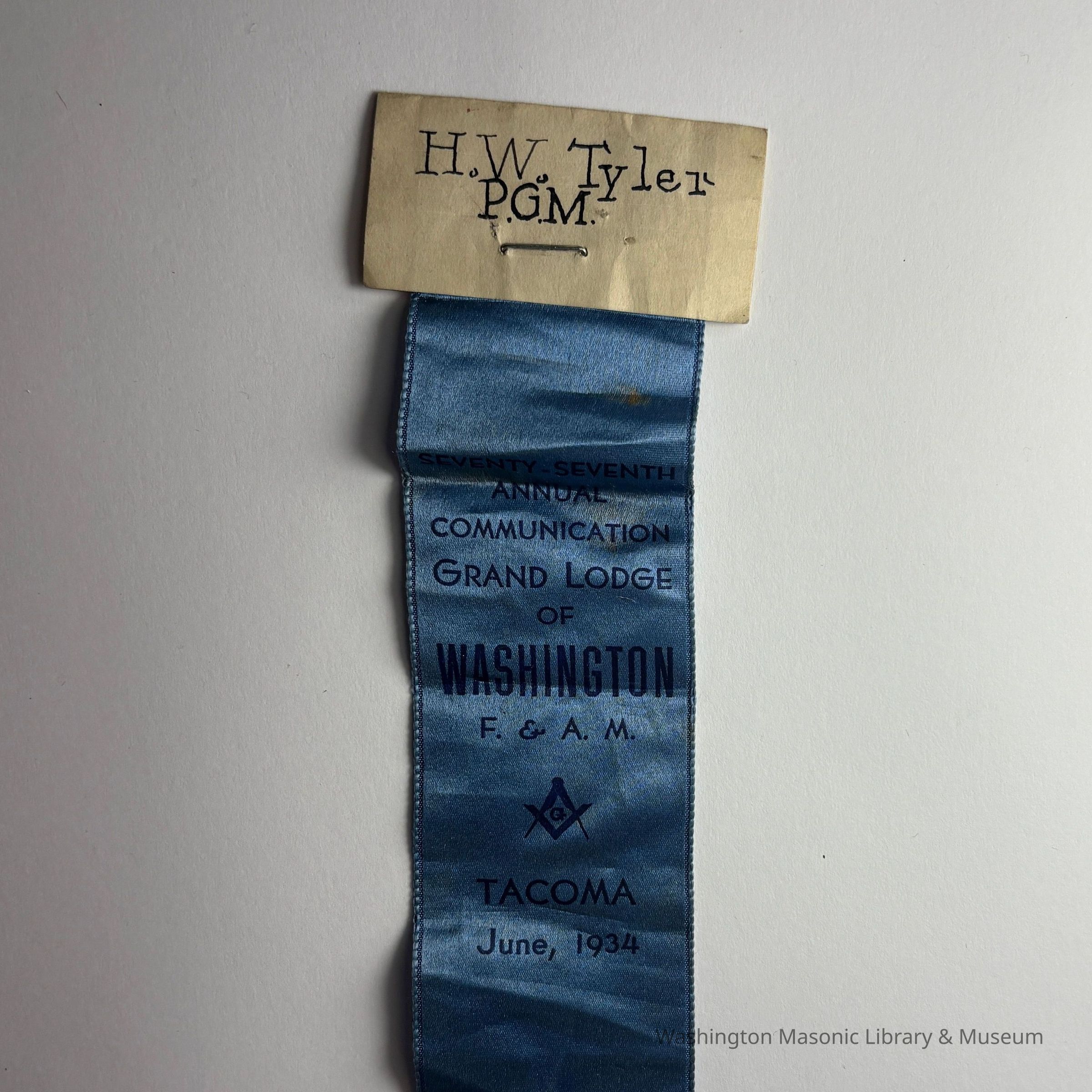 Ribbon: Blue with dark blue lettering, and paper name plate. "H.W. Tyler/P.G.M./ Seventy-Seventh Annual Communication Grand Lodge of Washington F.&A.M./ Tacoma/ June, 1934"Collection
