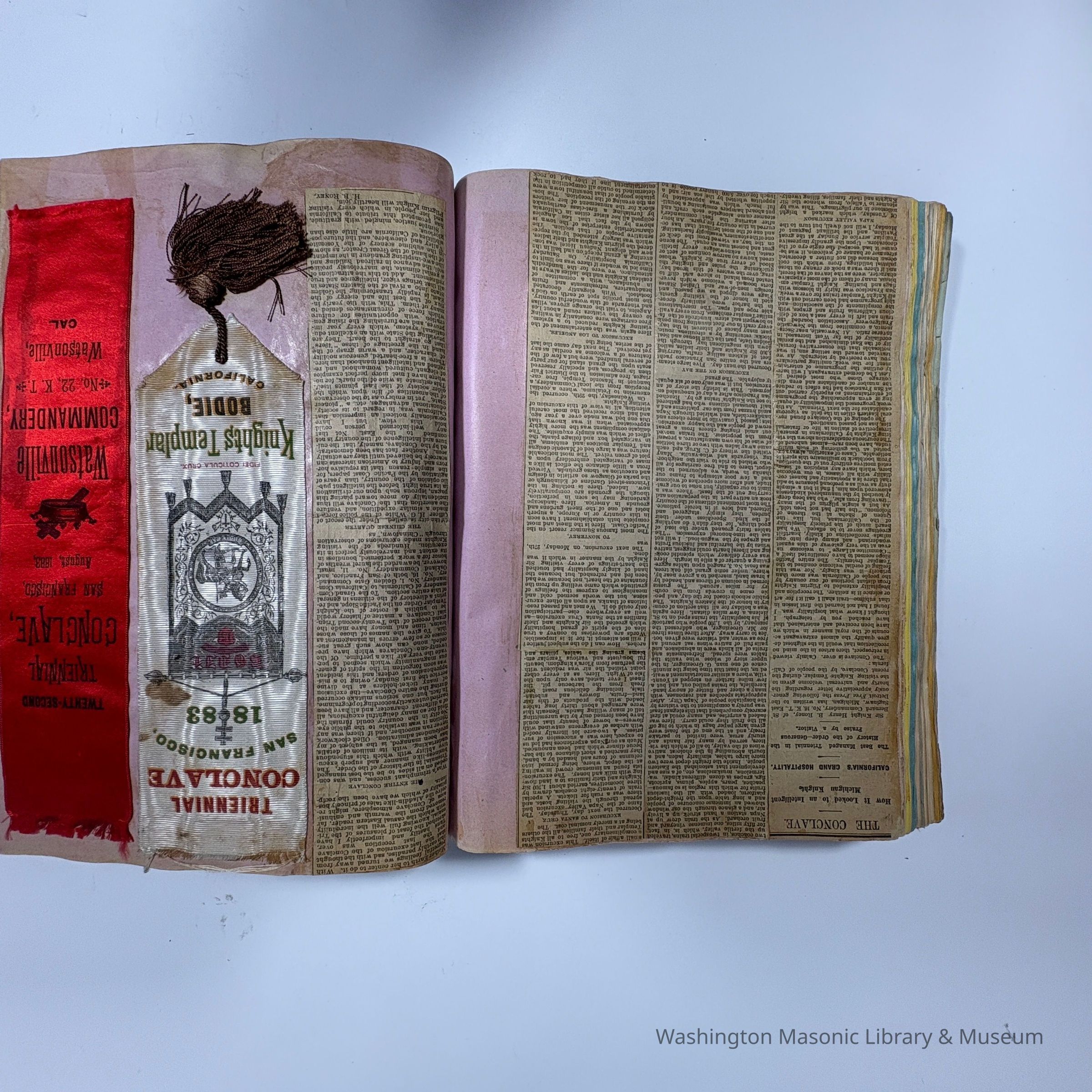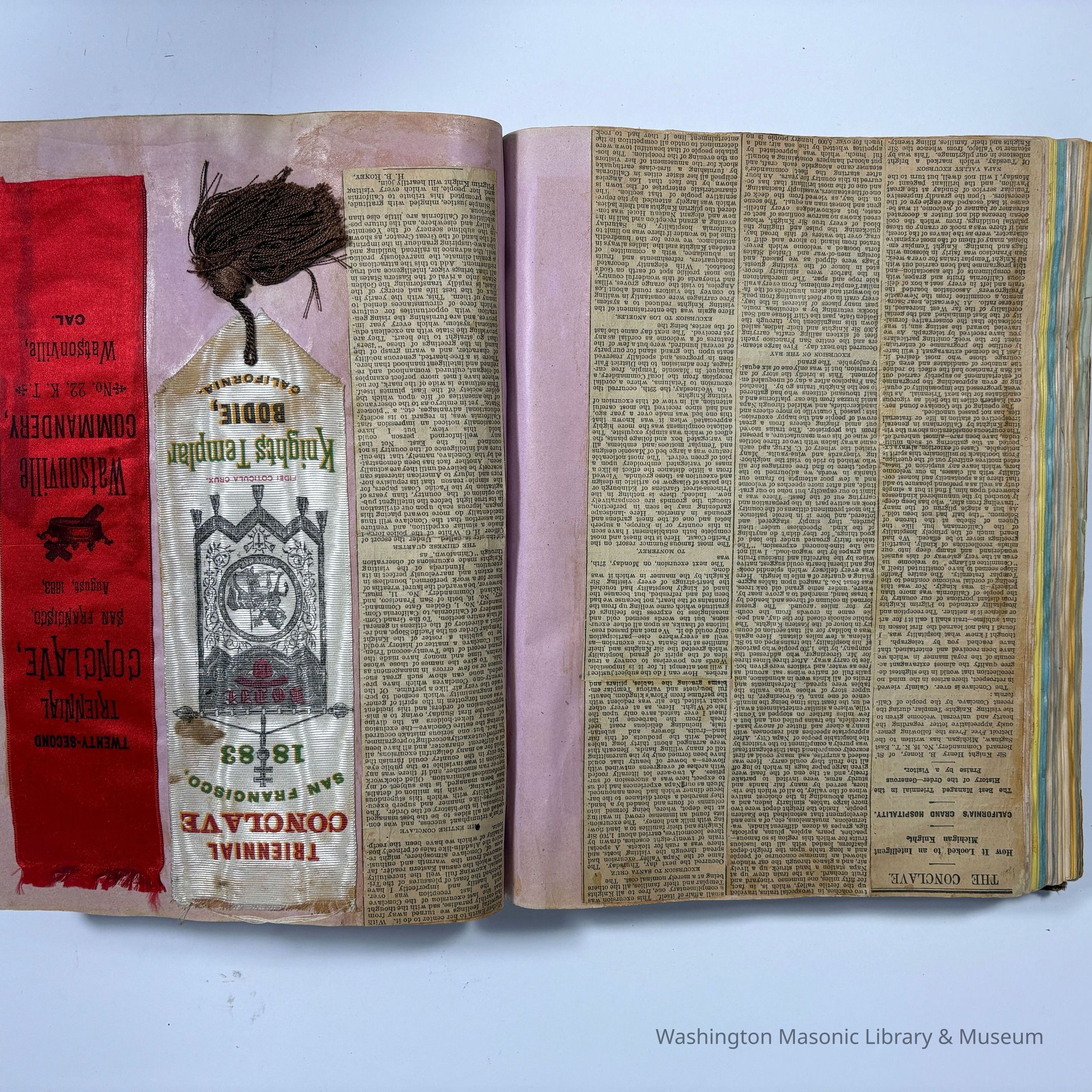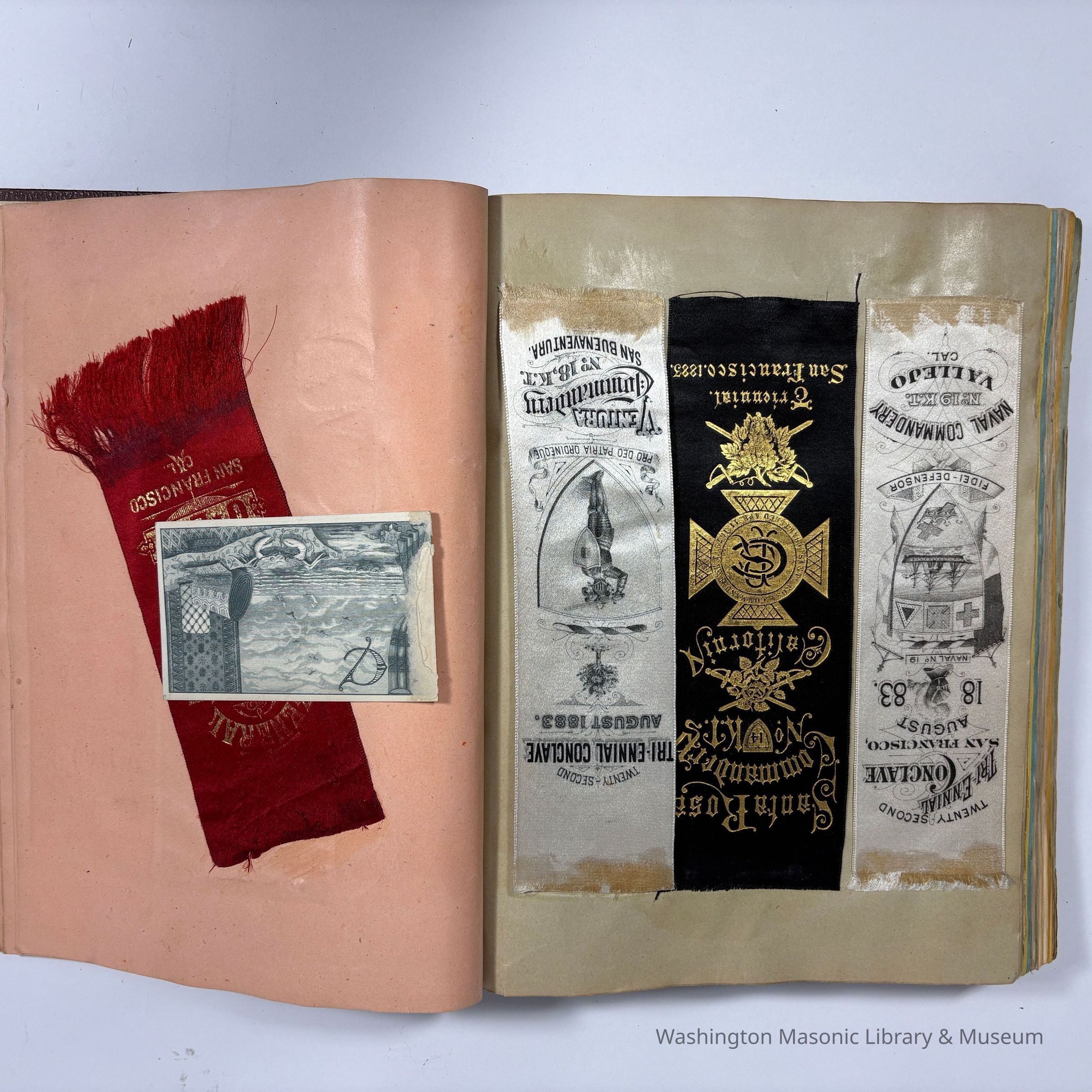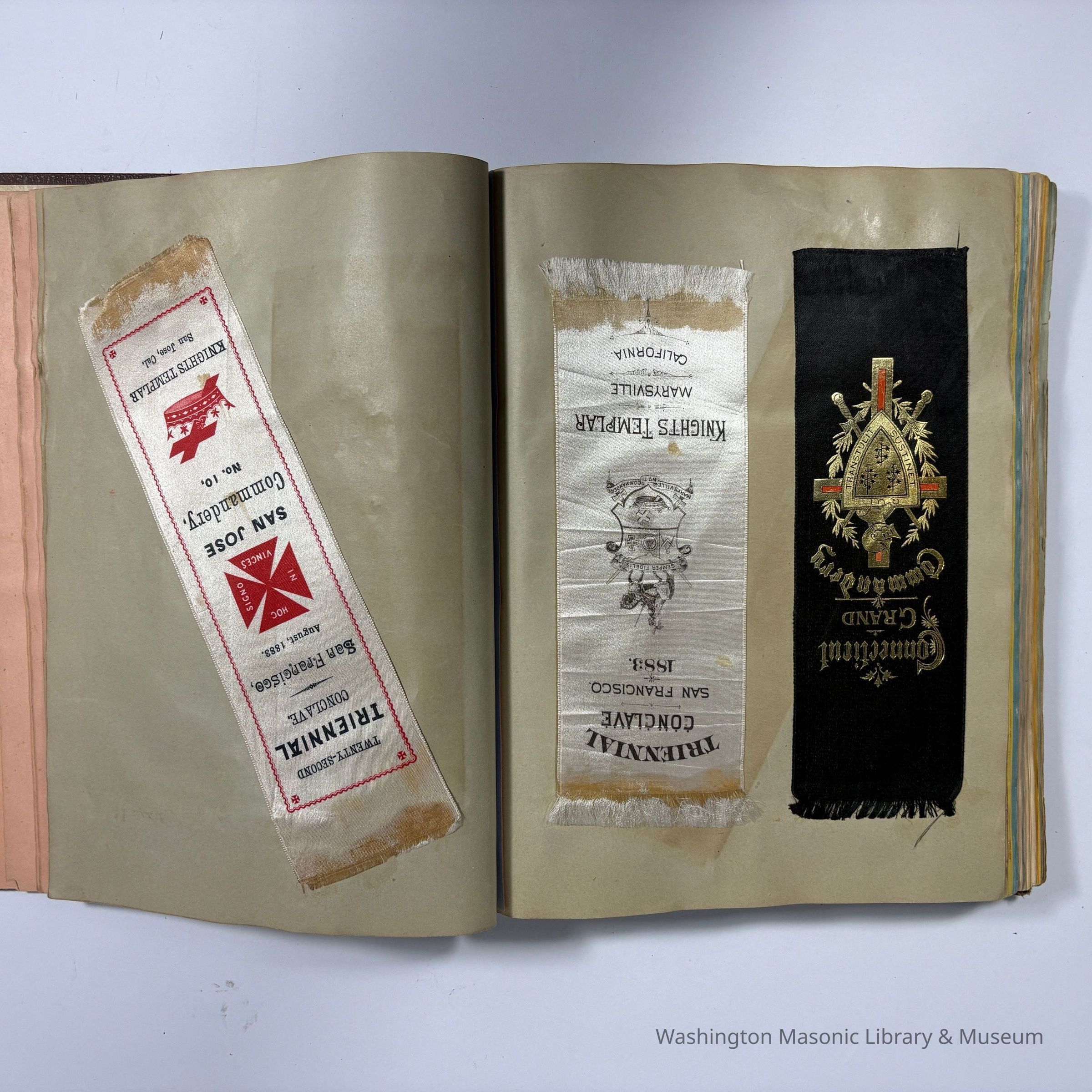 Many of the cards and ribbons were collected at the 22nd Triennial Conclave in San Francisco (1883). Then, in 1886, the scrapbook was reused to collect ephemera and ribbons from the Native Sons of the Golden West (N.S. G. W.)