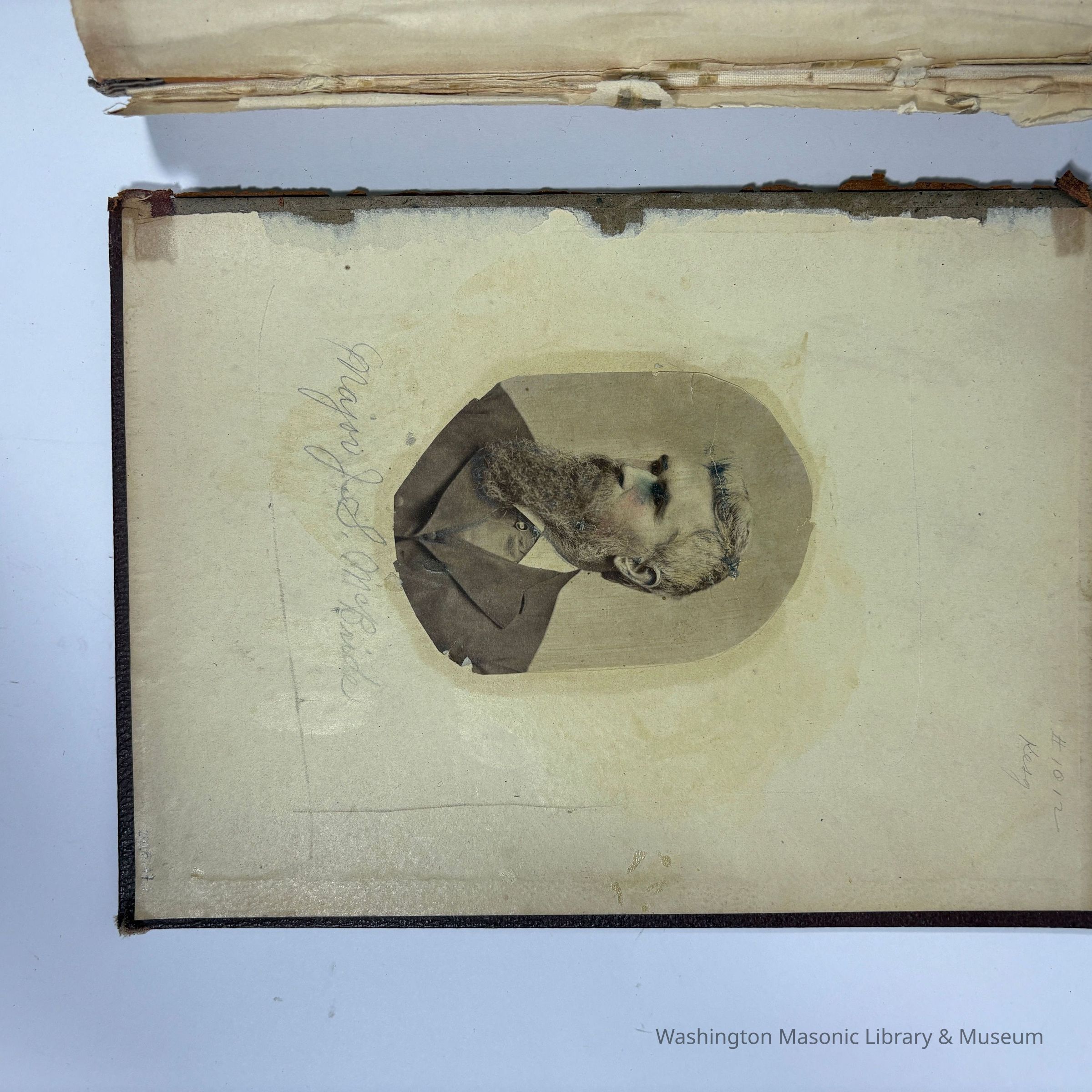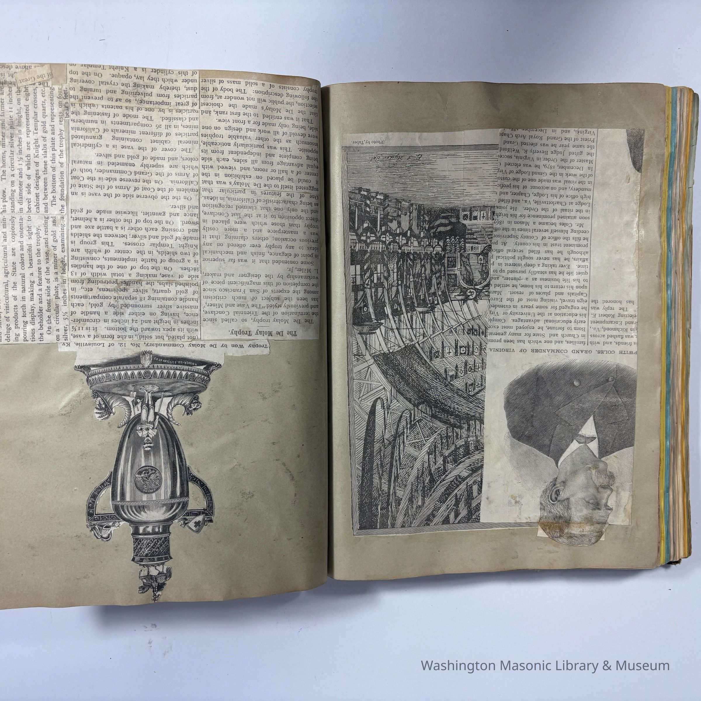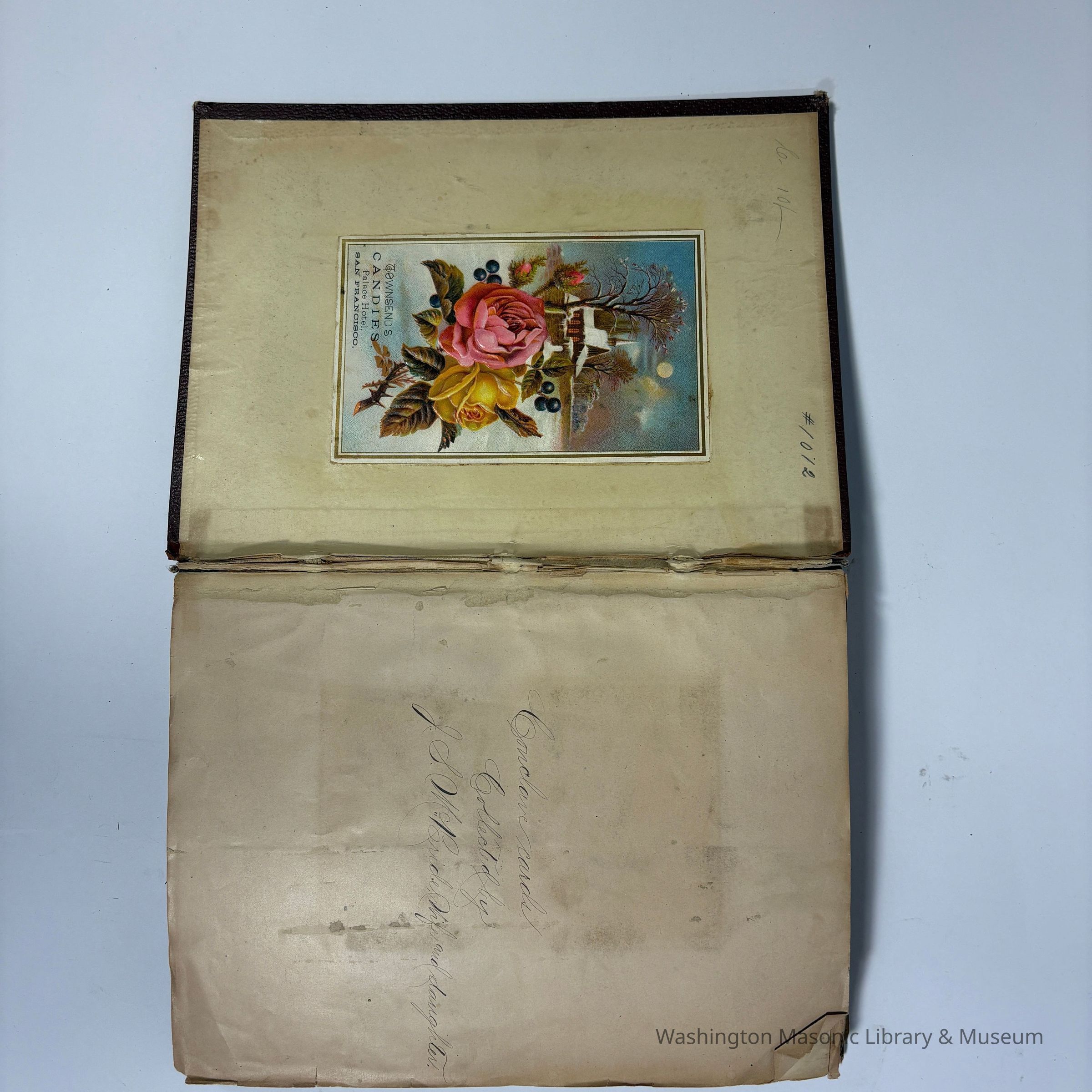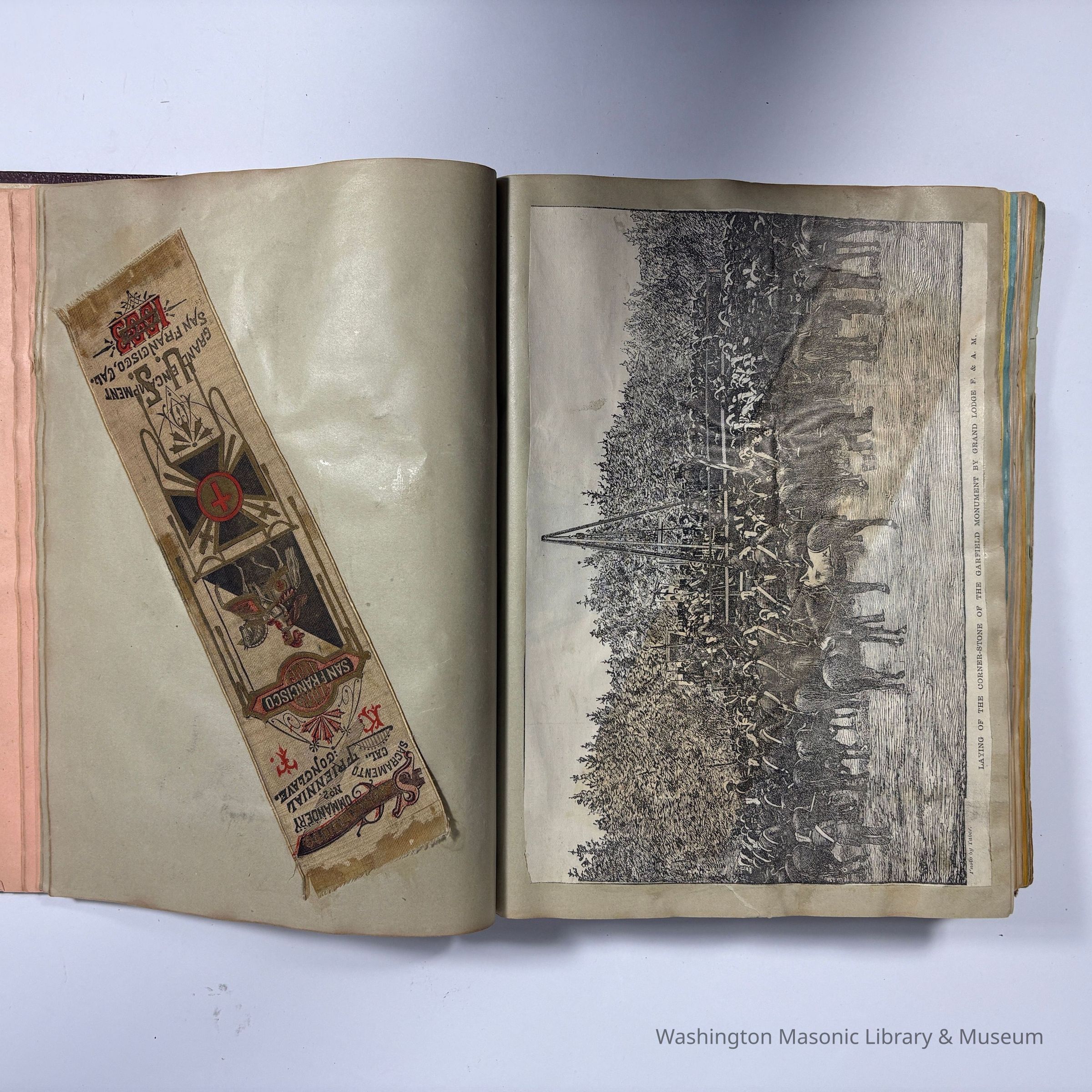 Many of the cards and ribbons were collected at the 22nd Triennial Conclave in San Francisco (1883). Then, in 1886, the scrapbook was reused to collect ephemera and ribbons from the Native Sons of the Golden West (N.S. G. W.)