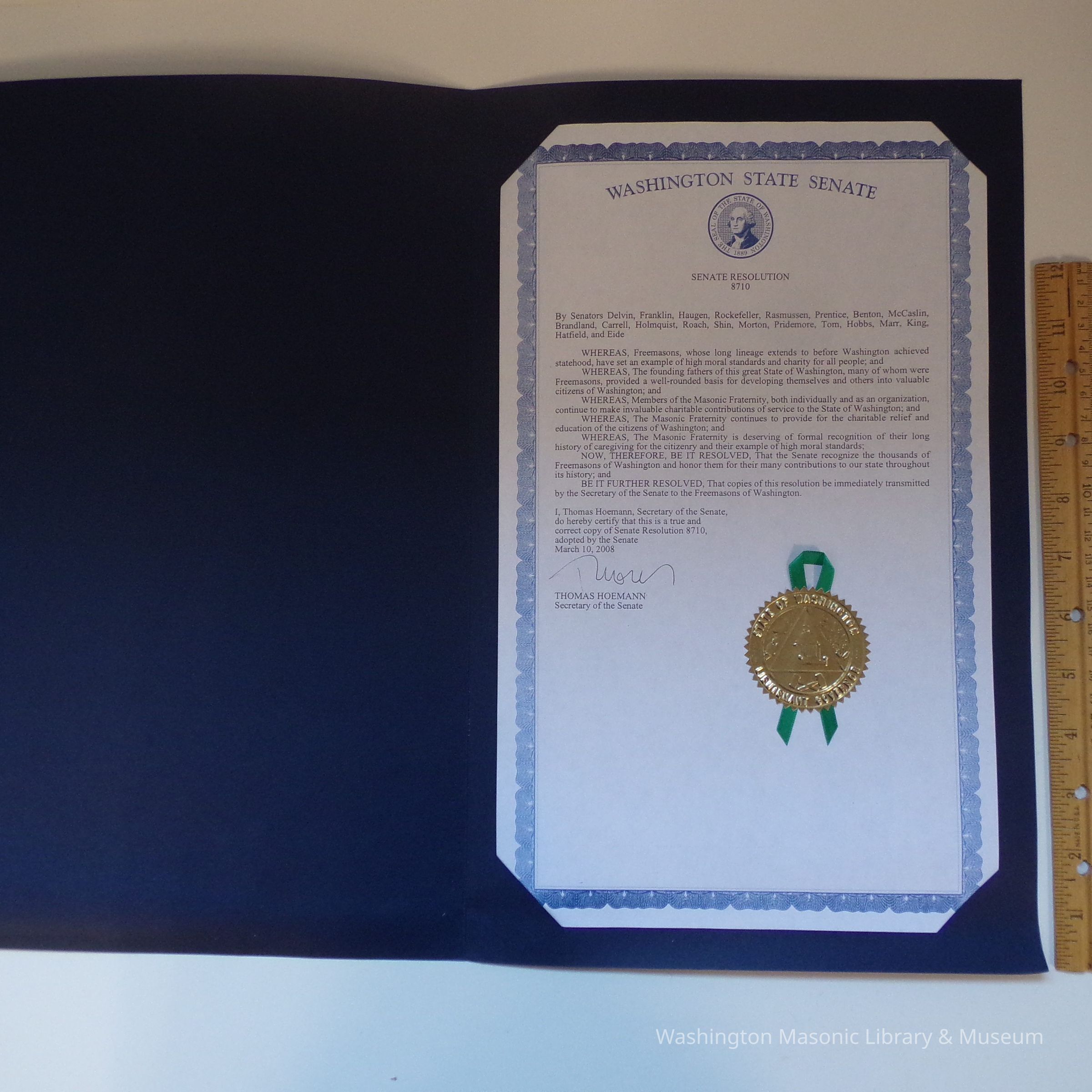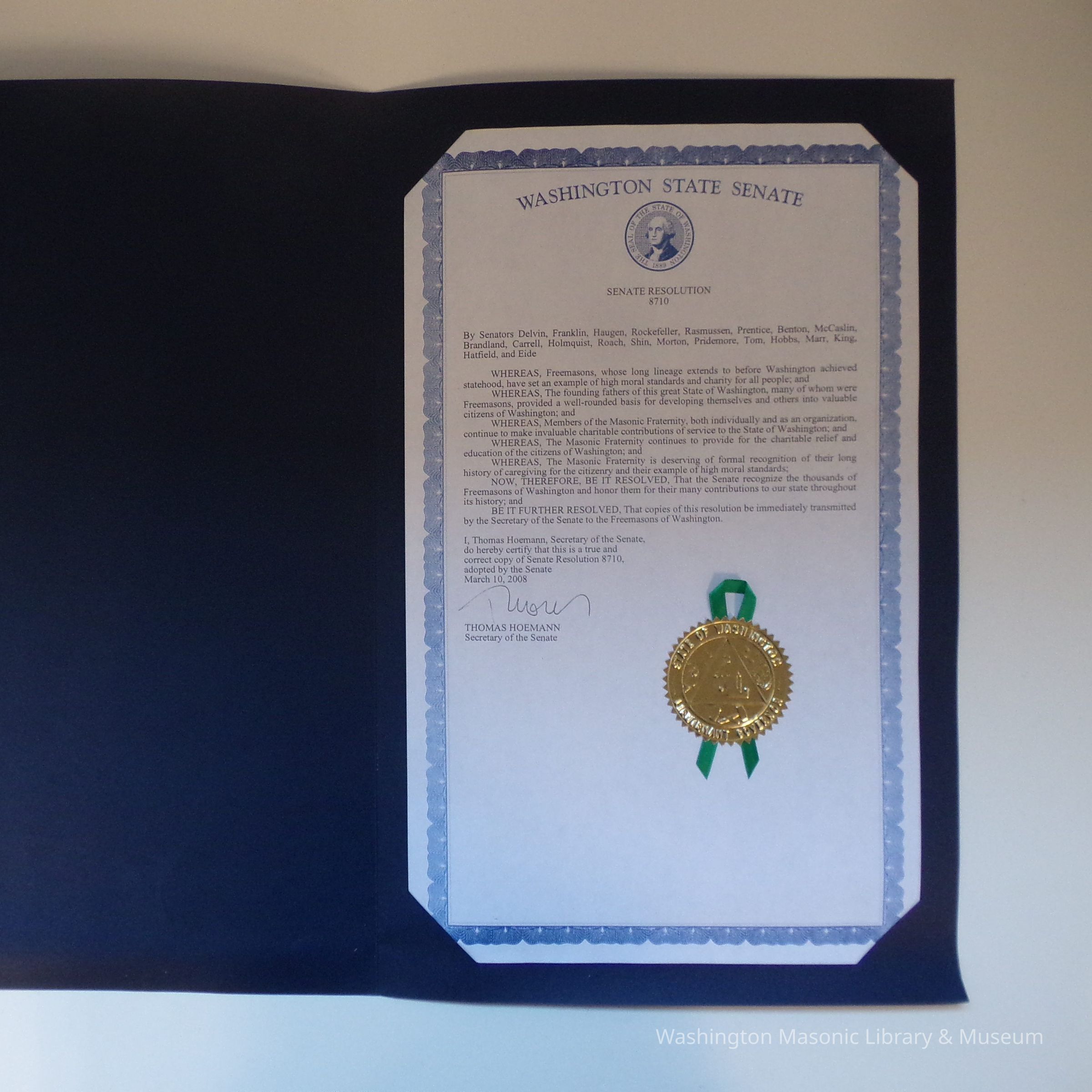 Senate Resolution: Washington State Senate Resolution honoring freemasons. signed by Thomas Hoemann, Secretary of the Senate, March 10, 2008. Senate Resolution 8710.
