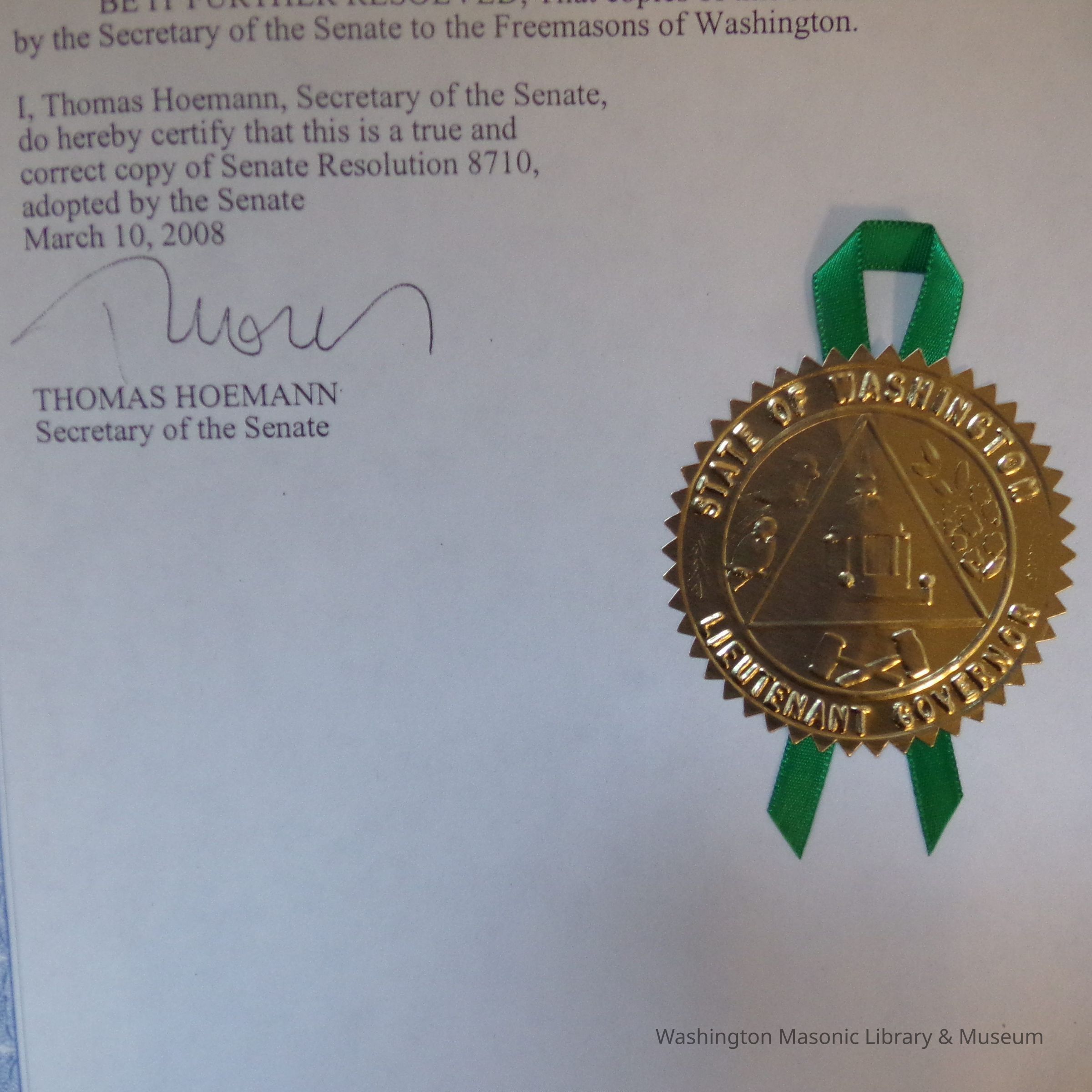 Senate Resolution: Washington State Senate Resolution honoring Freemasons. Signed by Thomas Hoemann, Secretary of the Senate, 2008.Entry/Object ID