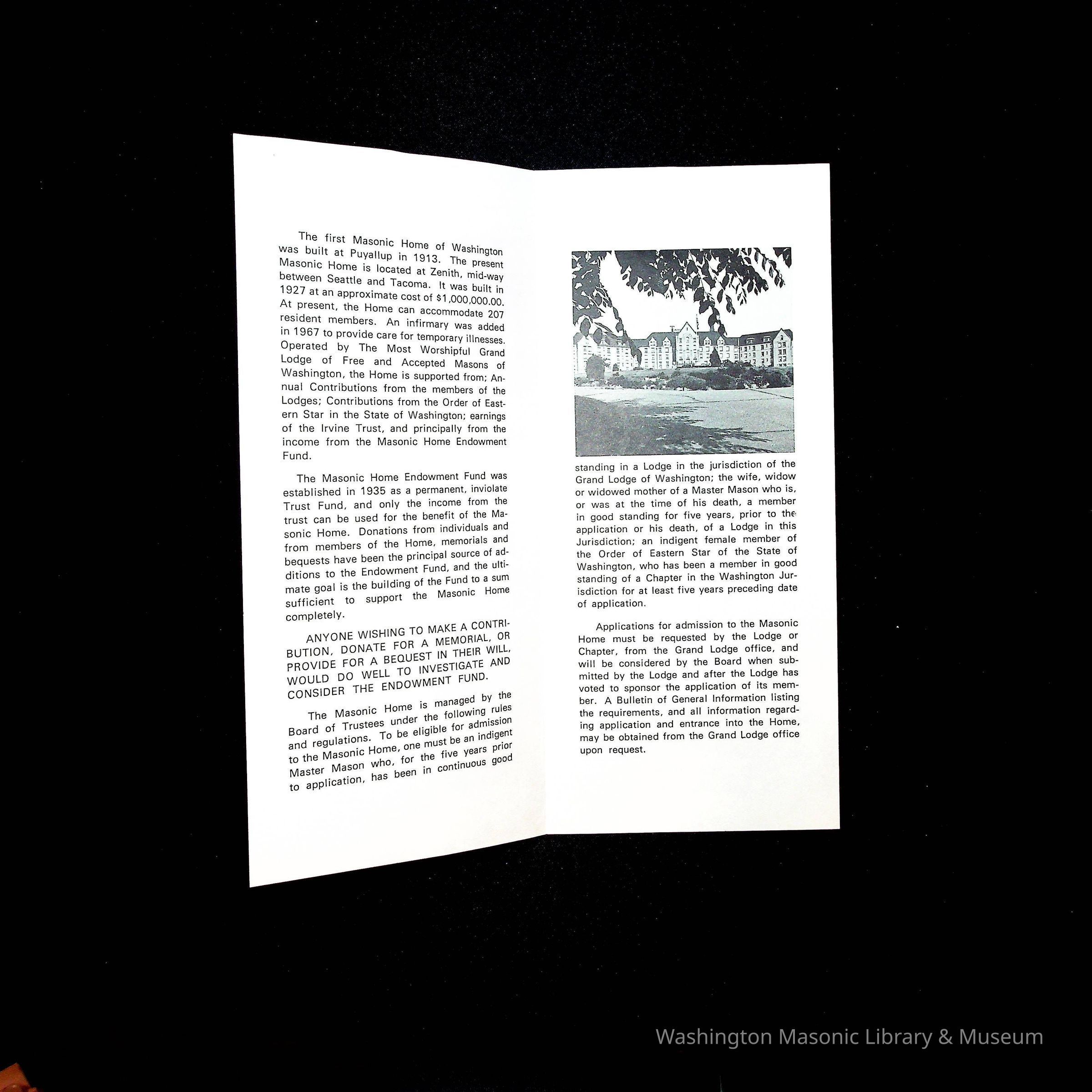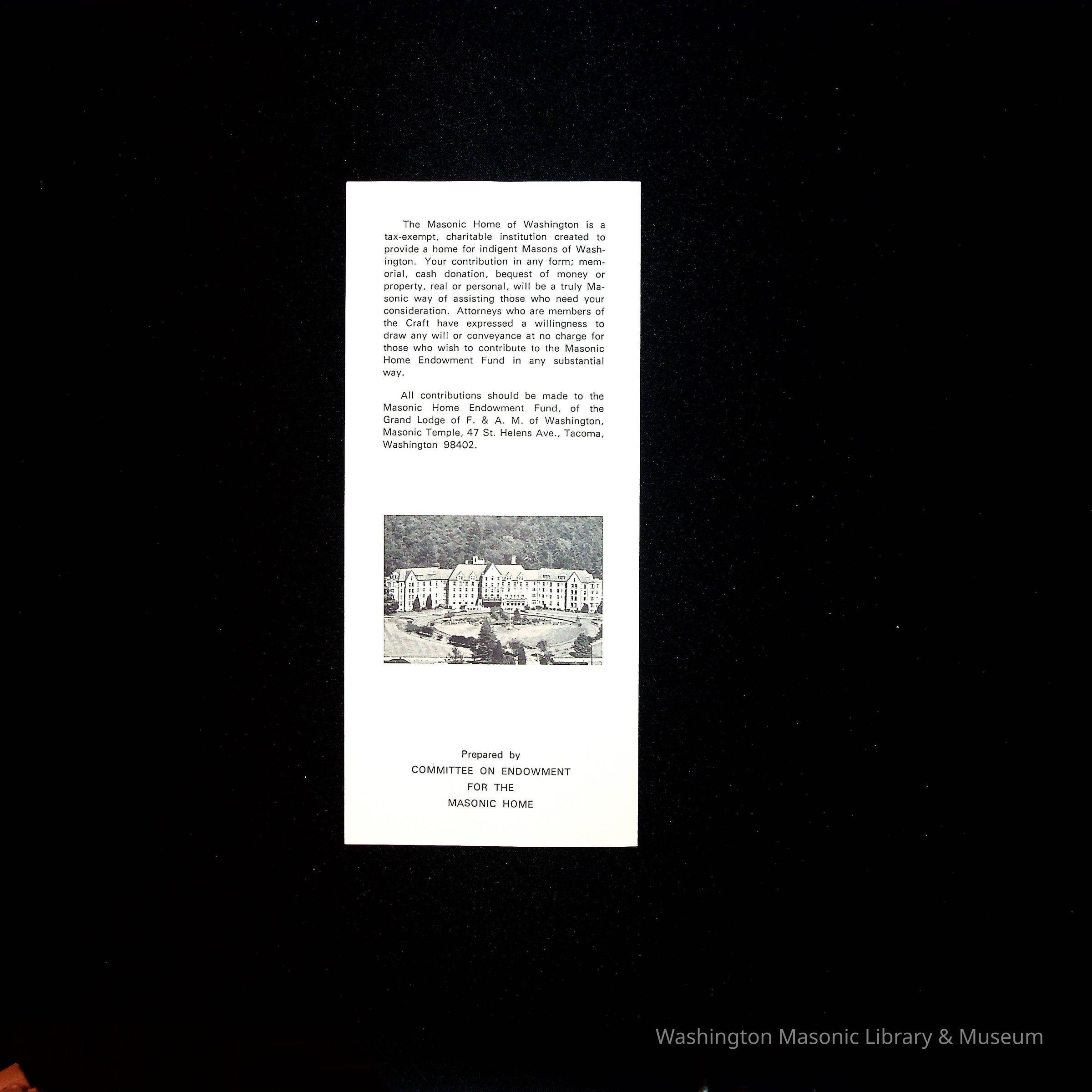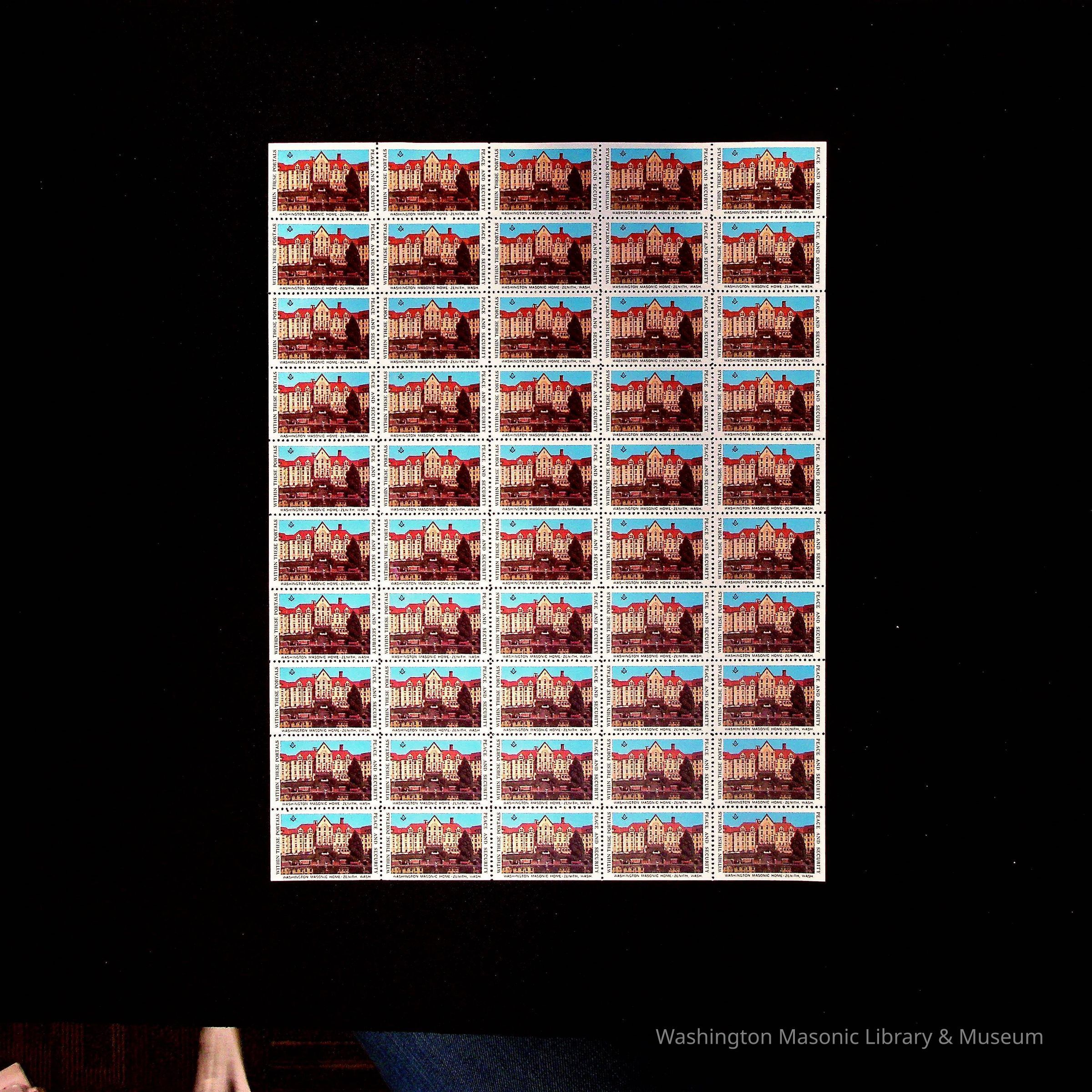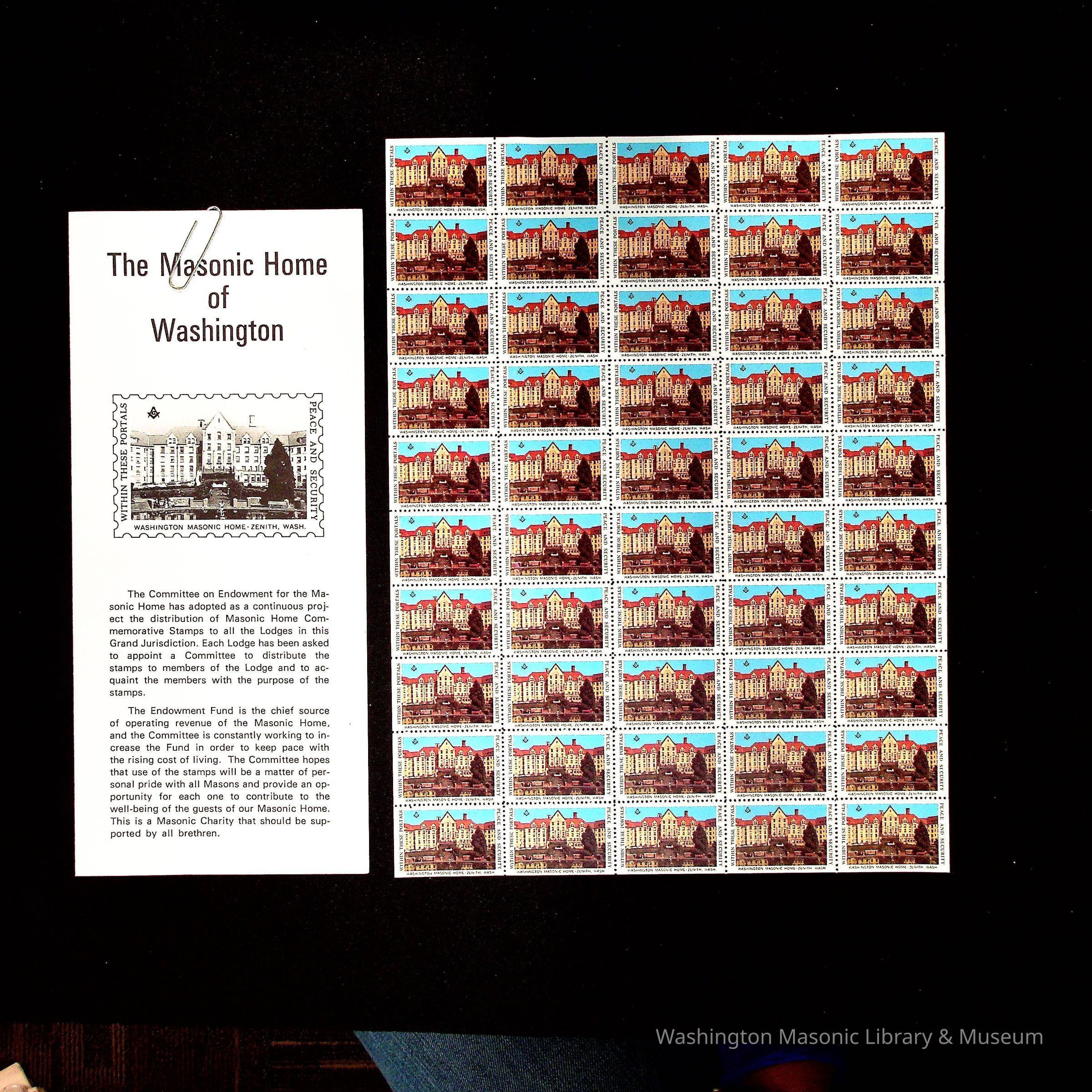 a) Stamps: Stamp books in File folder of the Masonic Home of Washington at Zenith, Washington. Originally 4 sheets of stamps, but we have only retained one. b) Flier found in same file folder as stamps.Collection