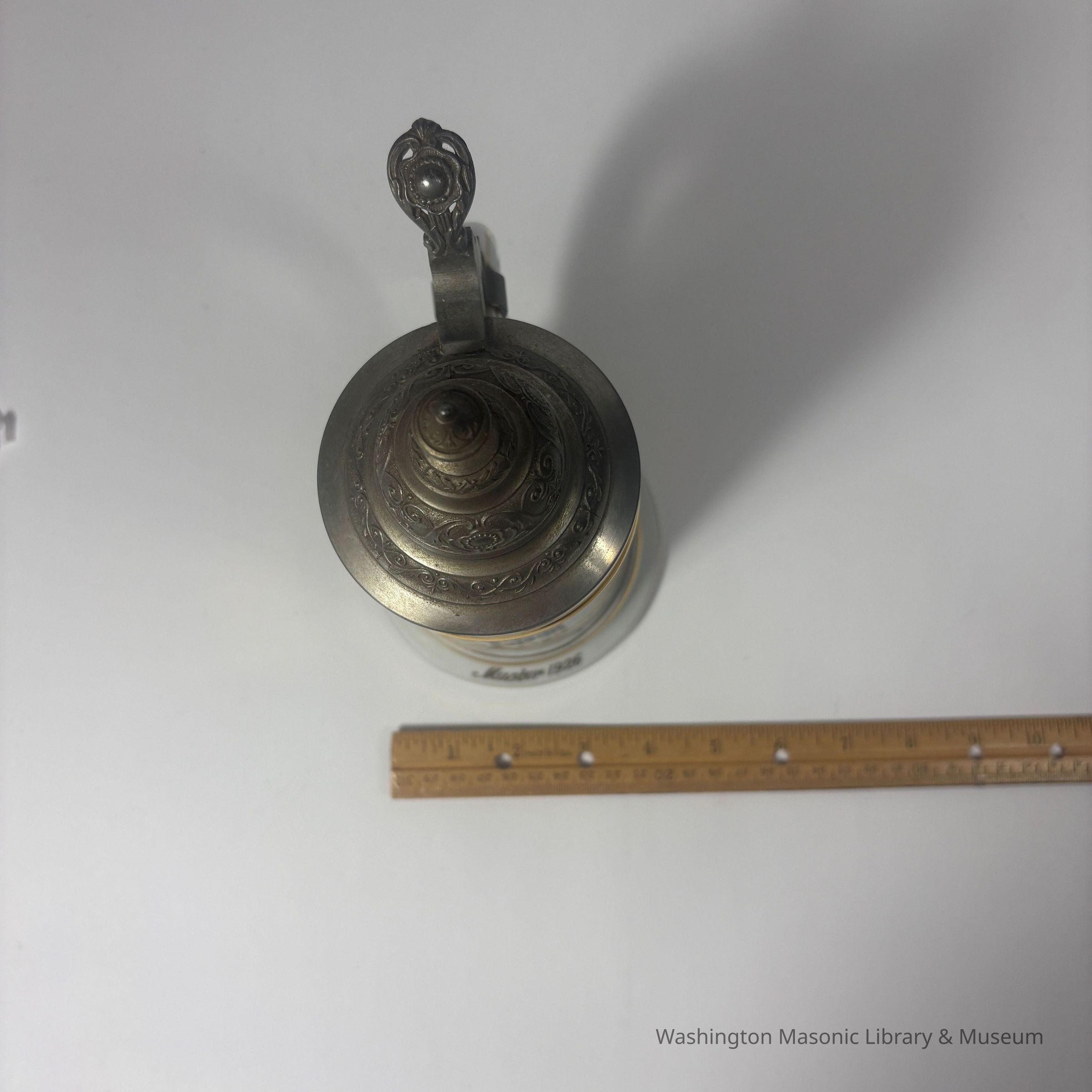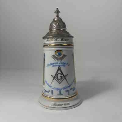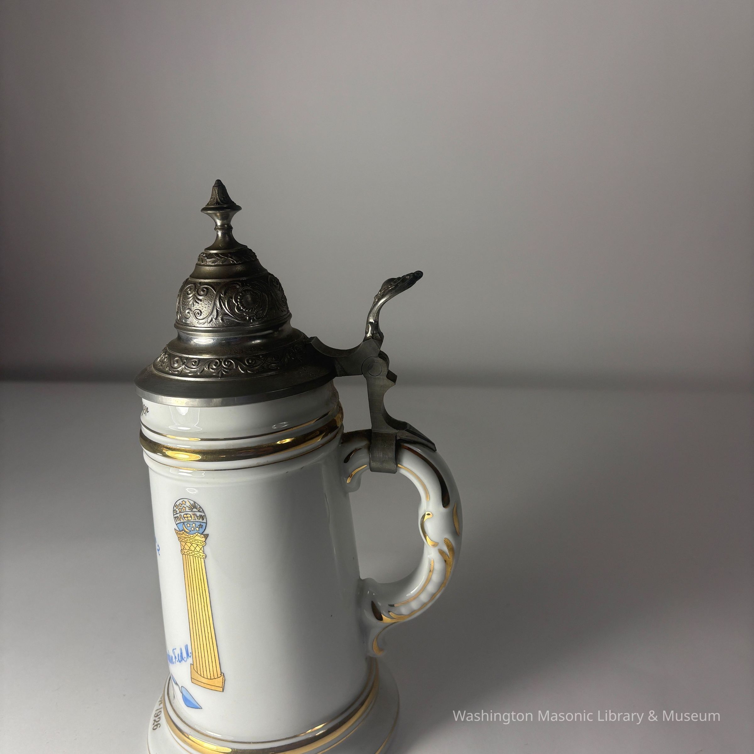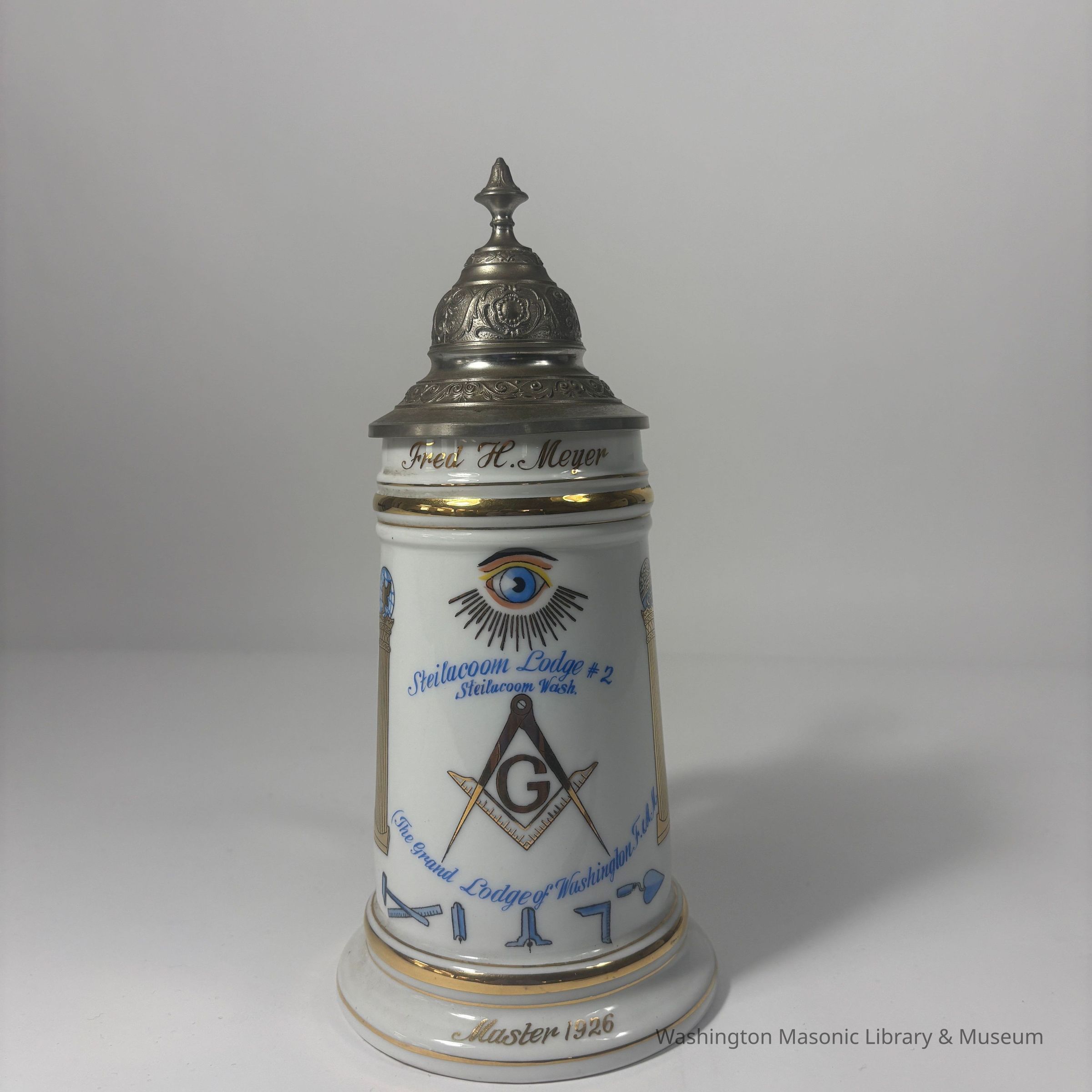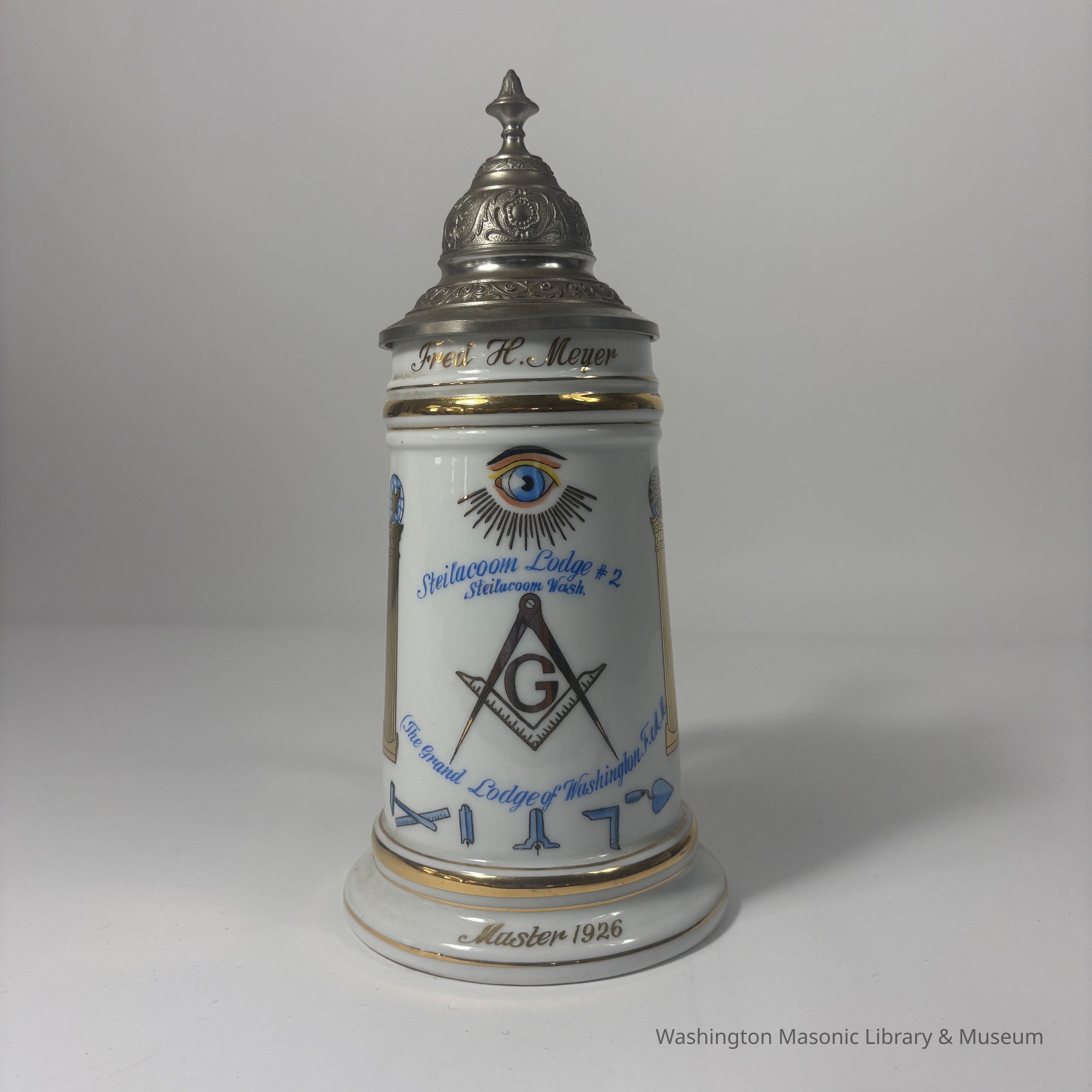 Stein: White with blue and gold painting. "Fred H. Meyer/ Steilacoom Lodge #2/ Steilacoom Wash./Grand Lodge of Washington F&AM/Master 1926/ 22. Nov. 1921"Made/Created