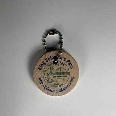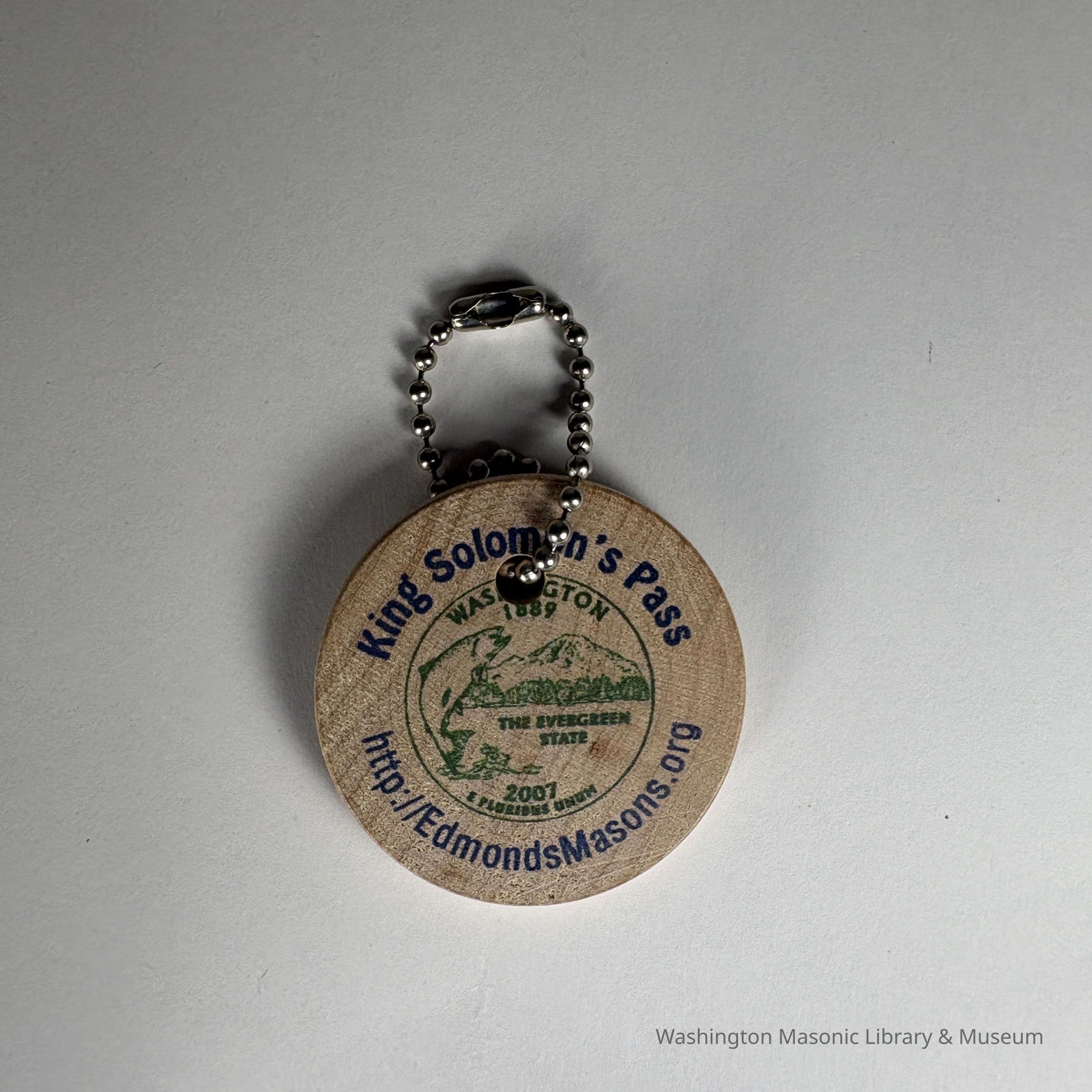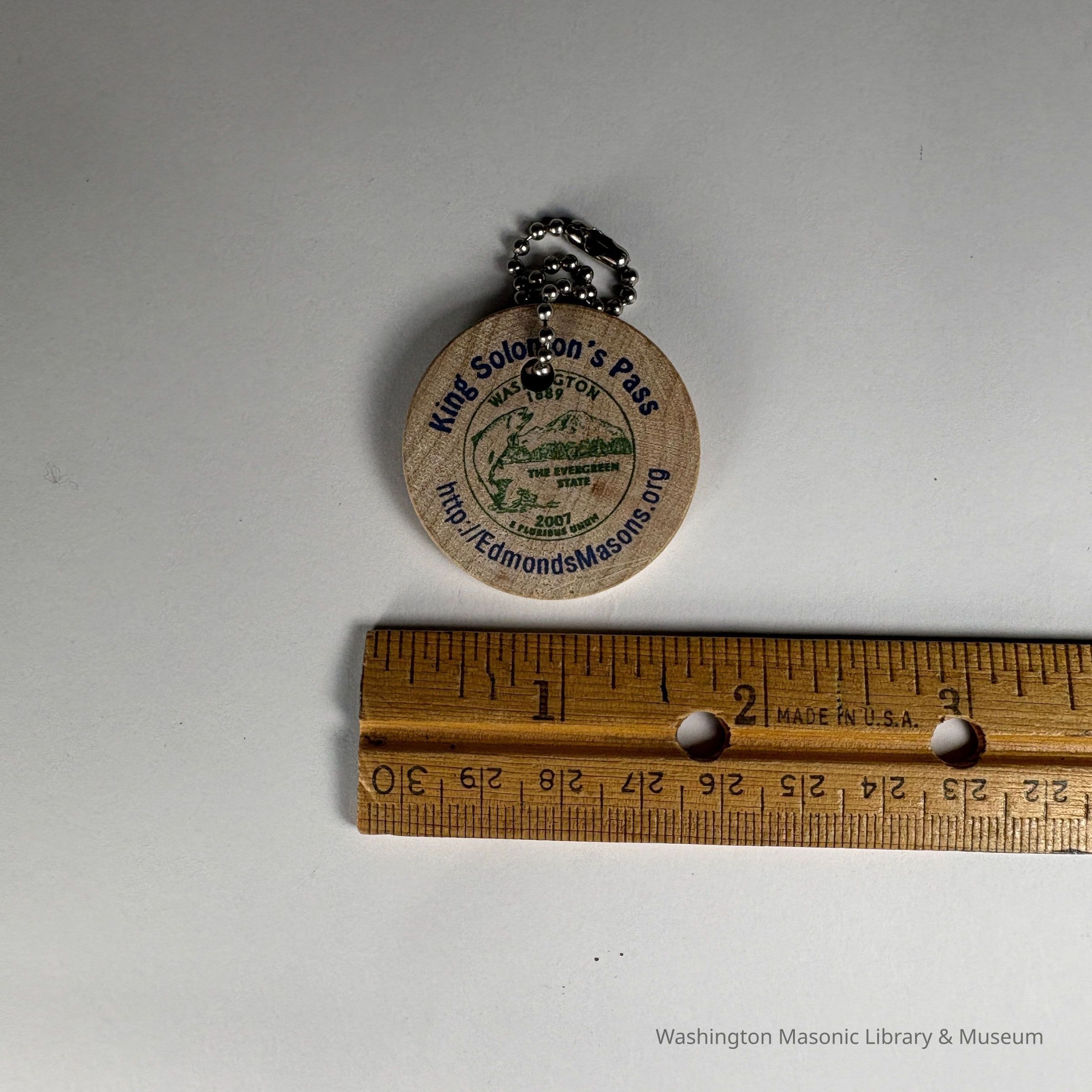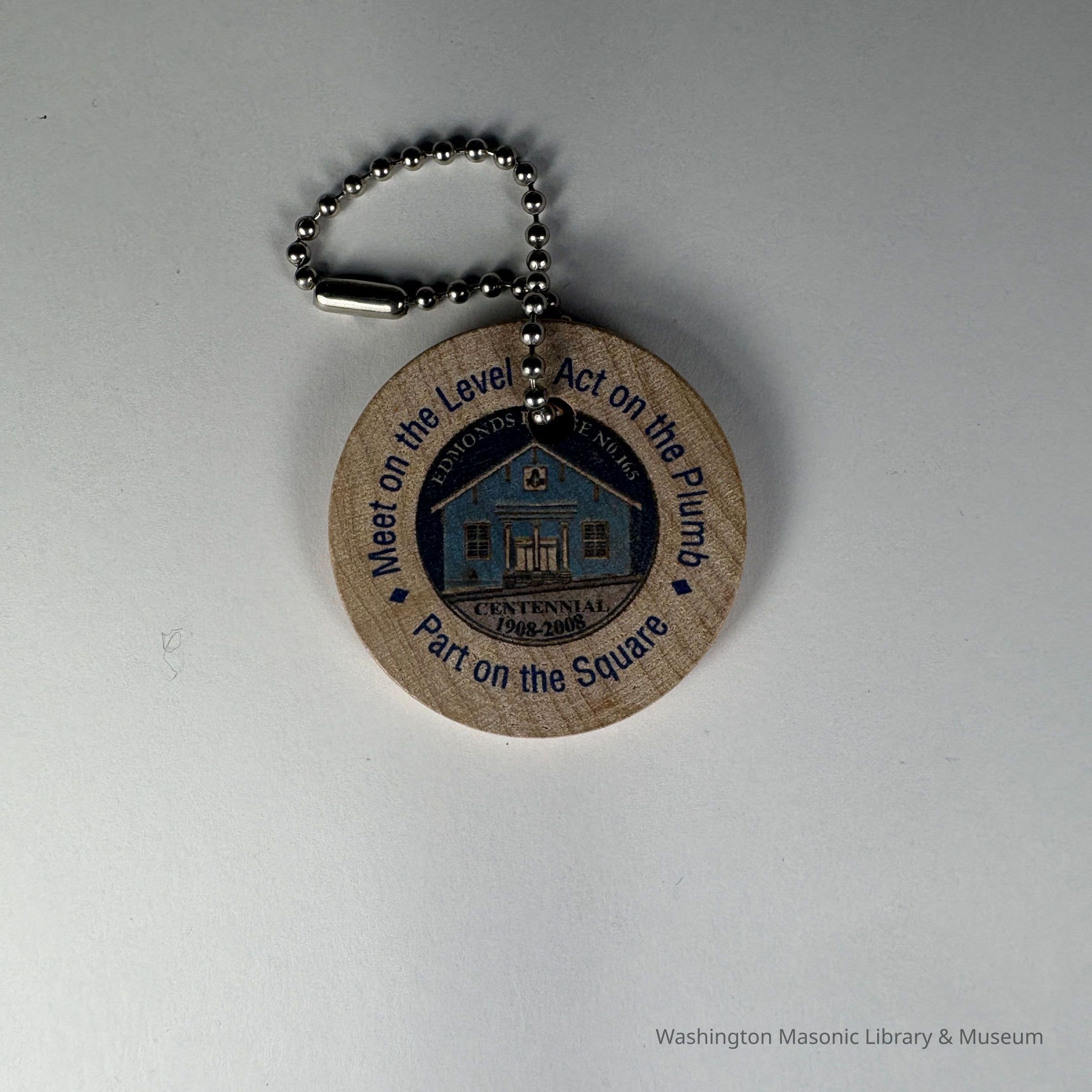 Token: Wood token on metal chain. "Meet on the Level/Act on the Plumb/Part on the Square/Edmonds Lodge No. 165/Centennial 1908-2008"