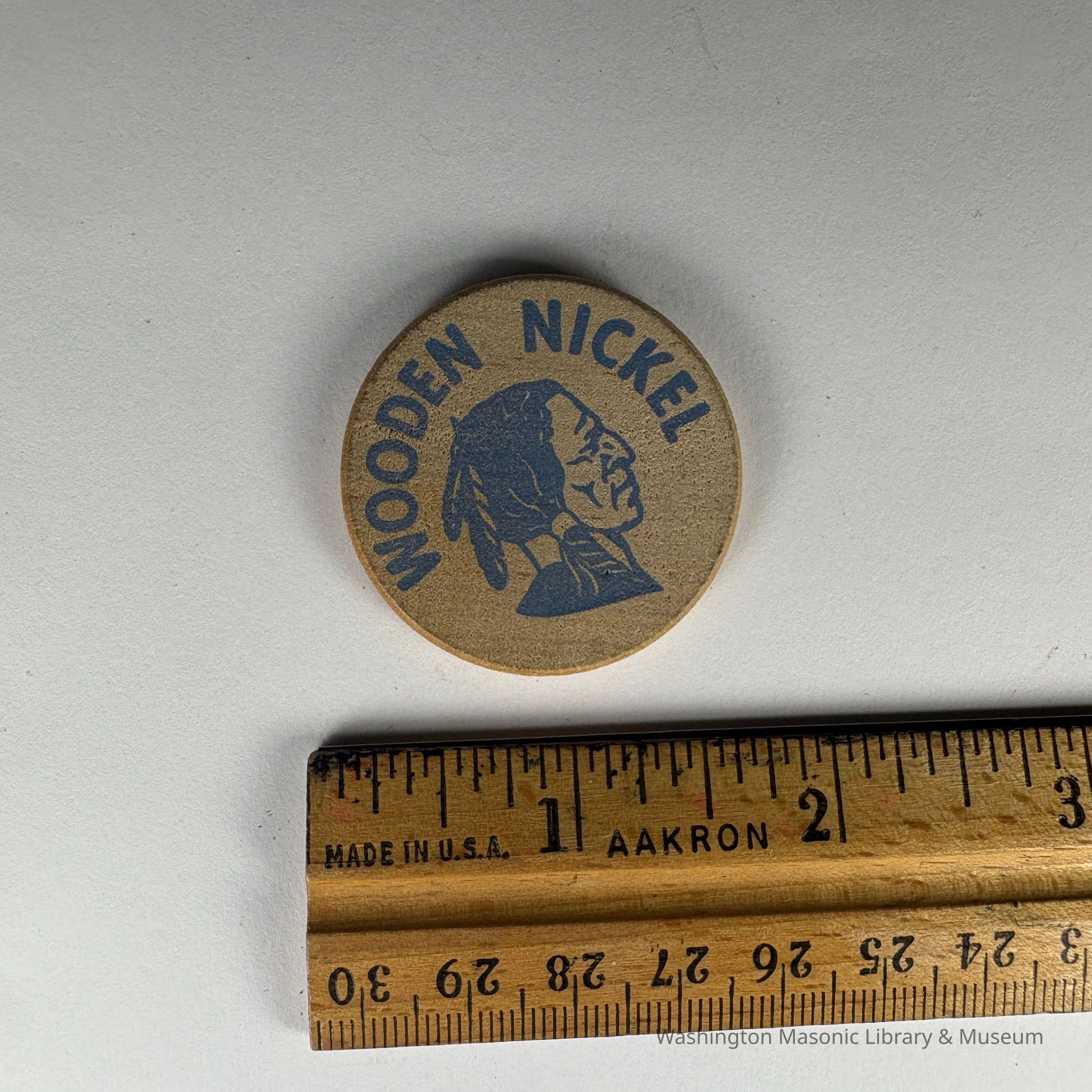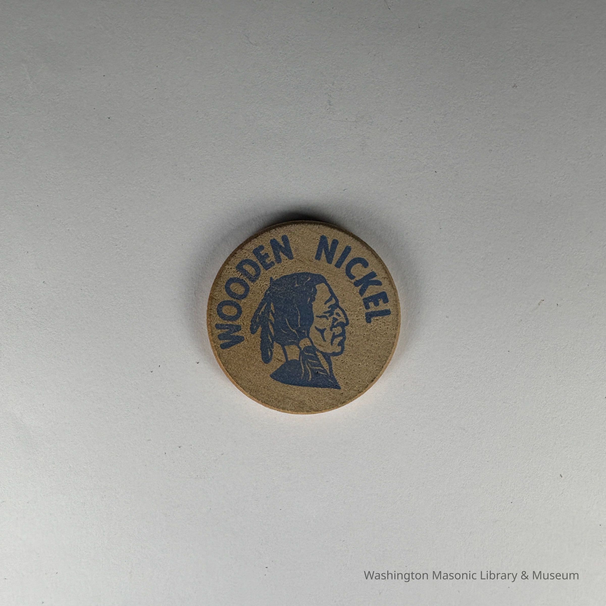 On Front Side: Bust of Indigenous man wearing a headress. "Wooden Nickel"