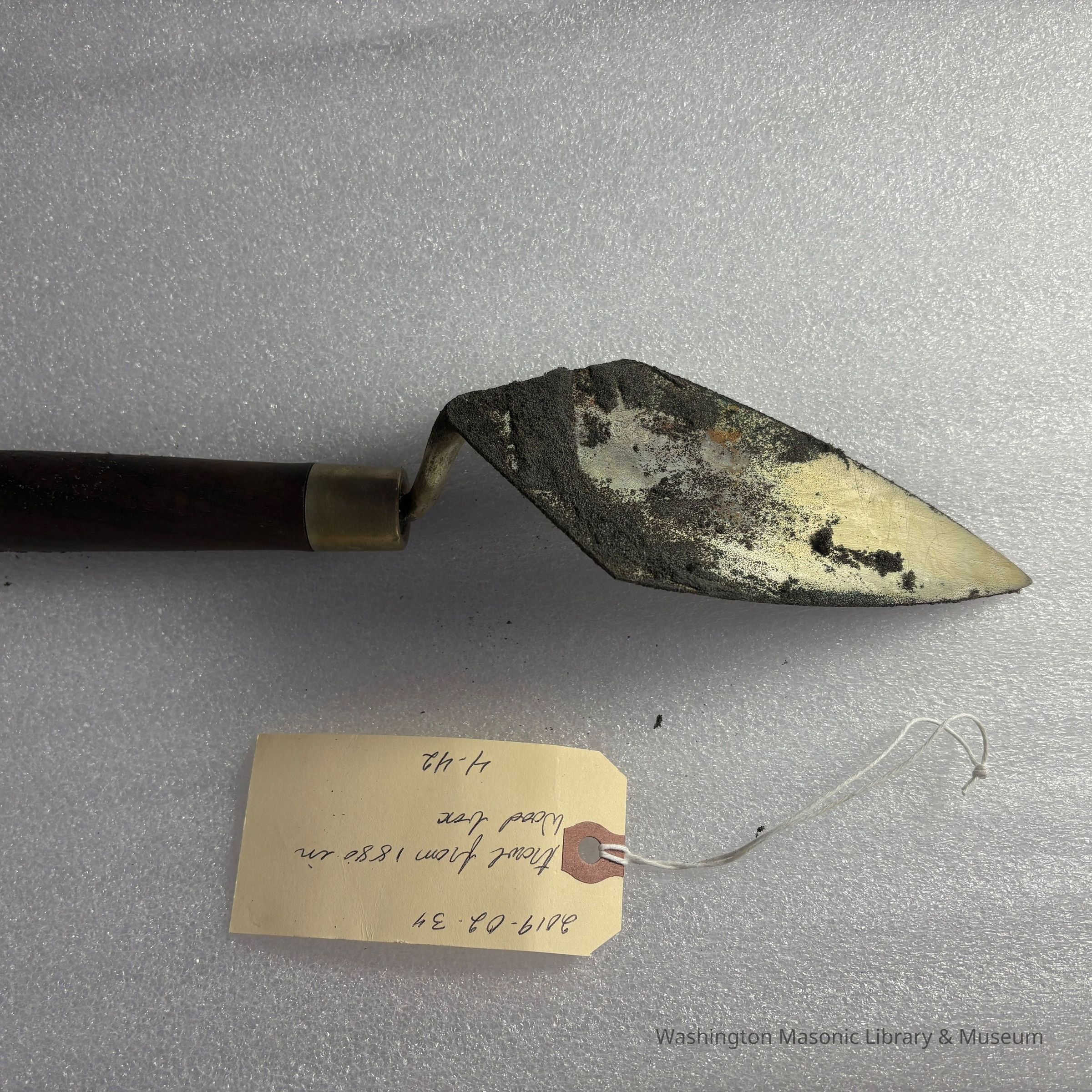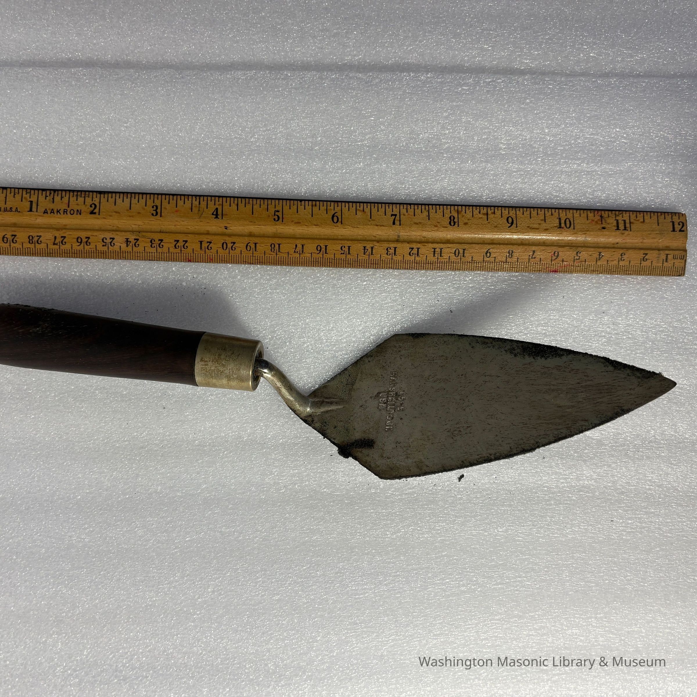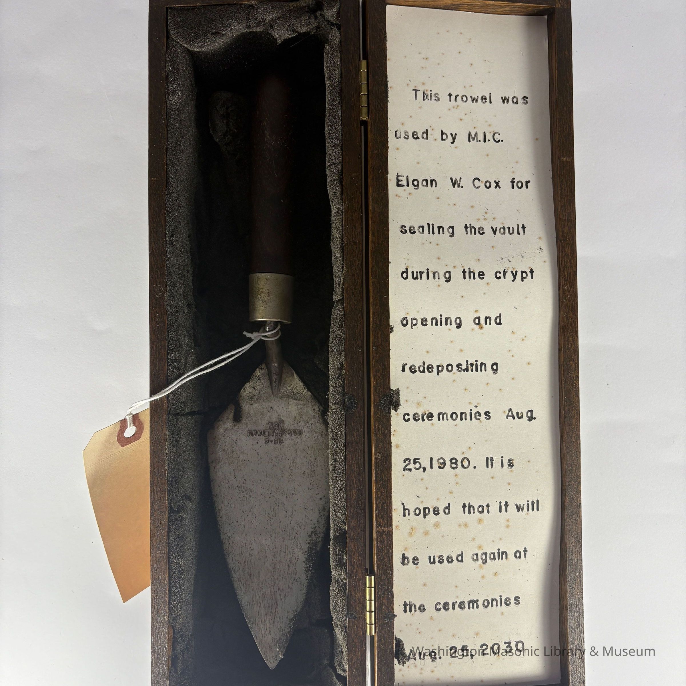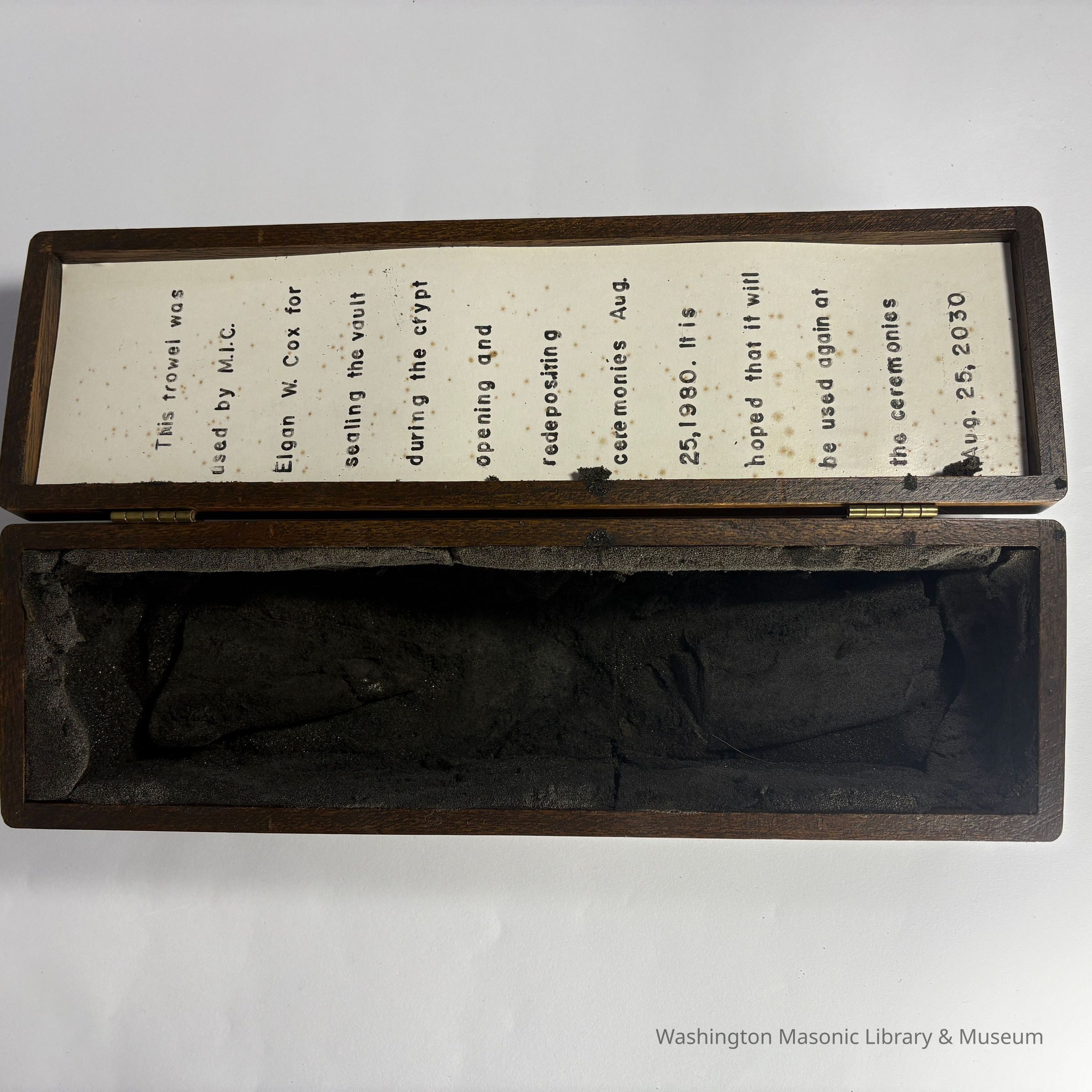 Trowel and Box: Trowel used by M.I.C. Elgan W. Cox for sealing the vault during the crypt opening and redepositing ceremonies Aug. 25, 1980. It is hoped that it will be used again at the ceremonies Aug. 25, 2030.