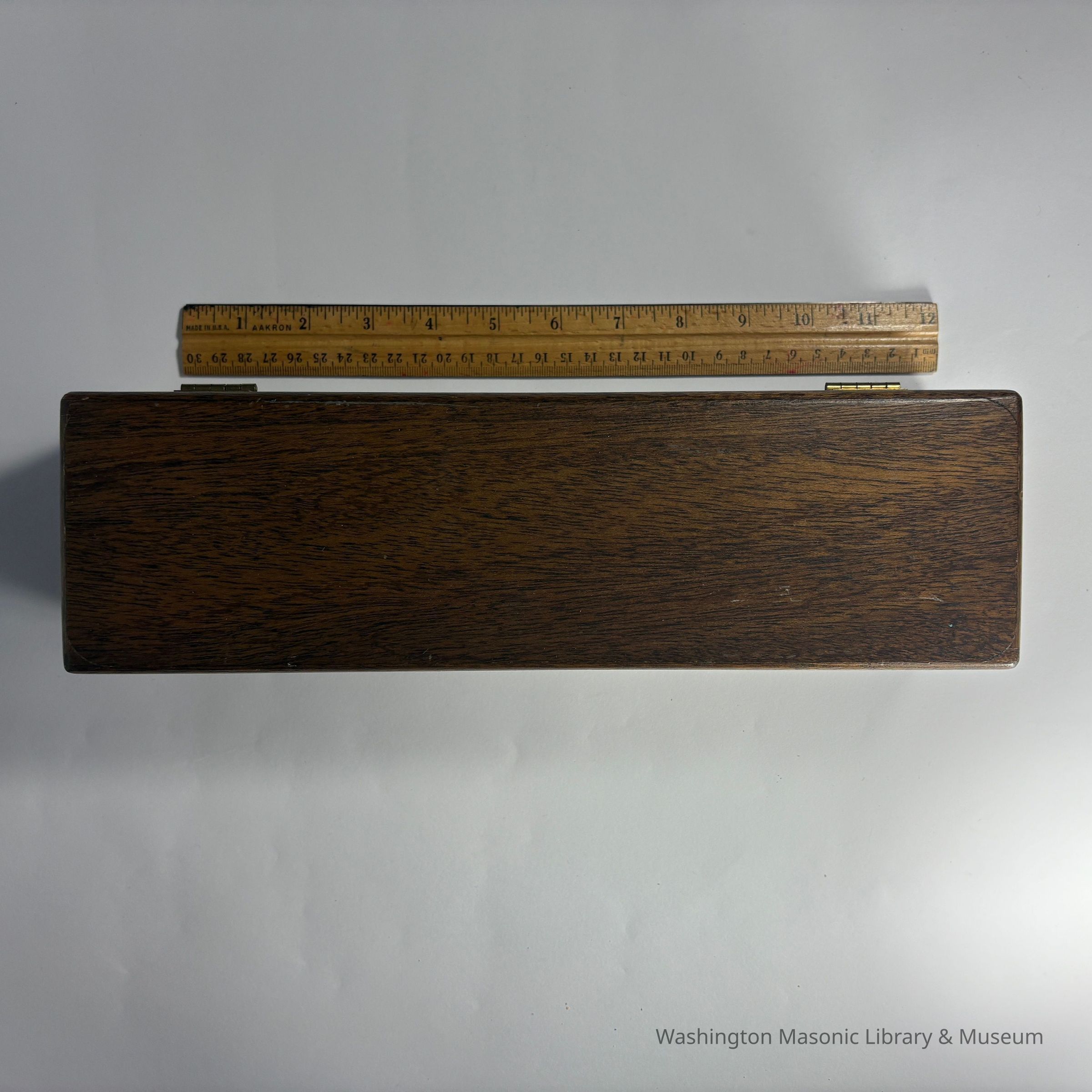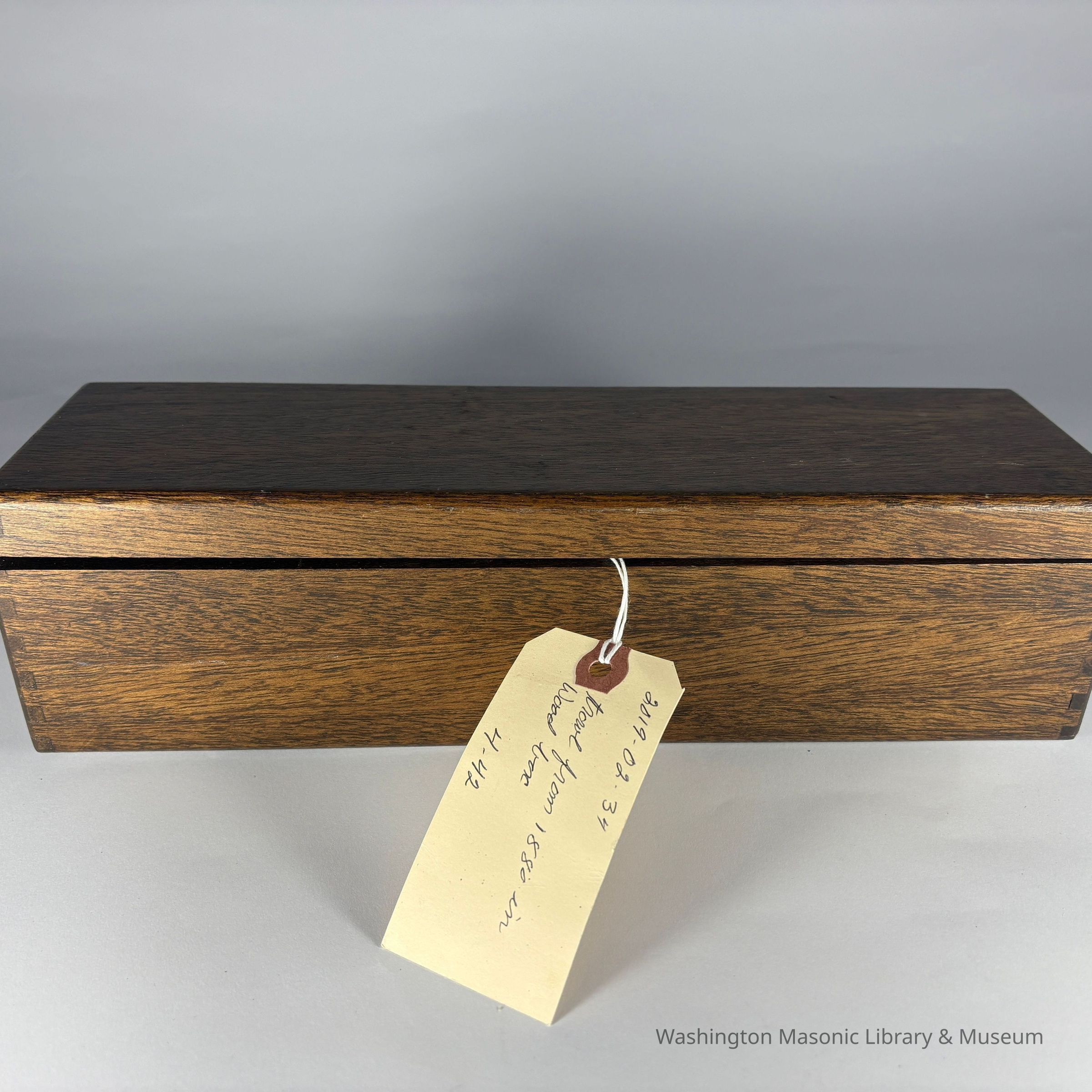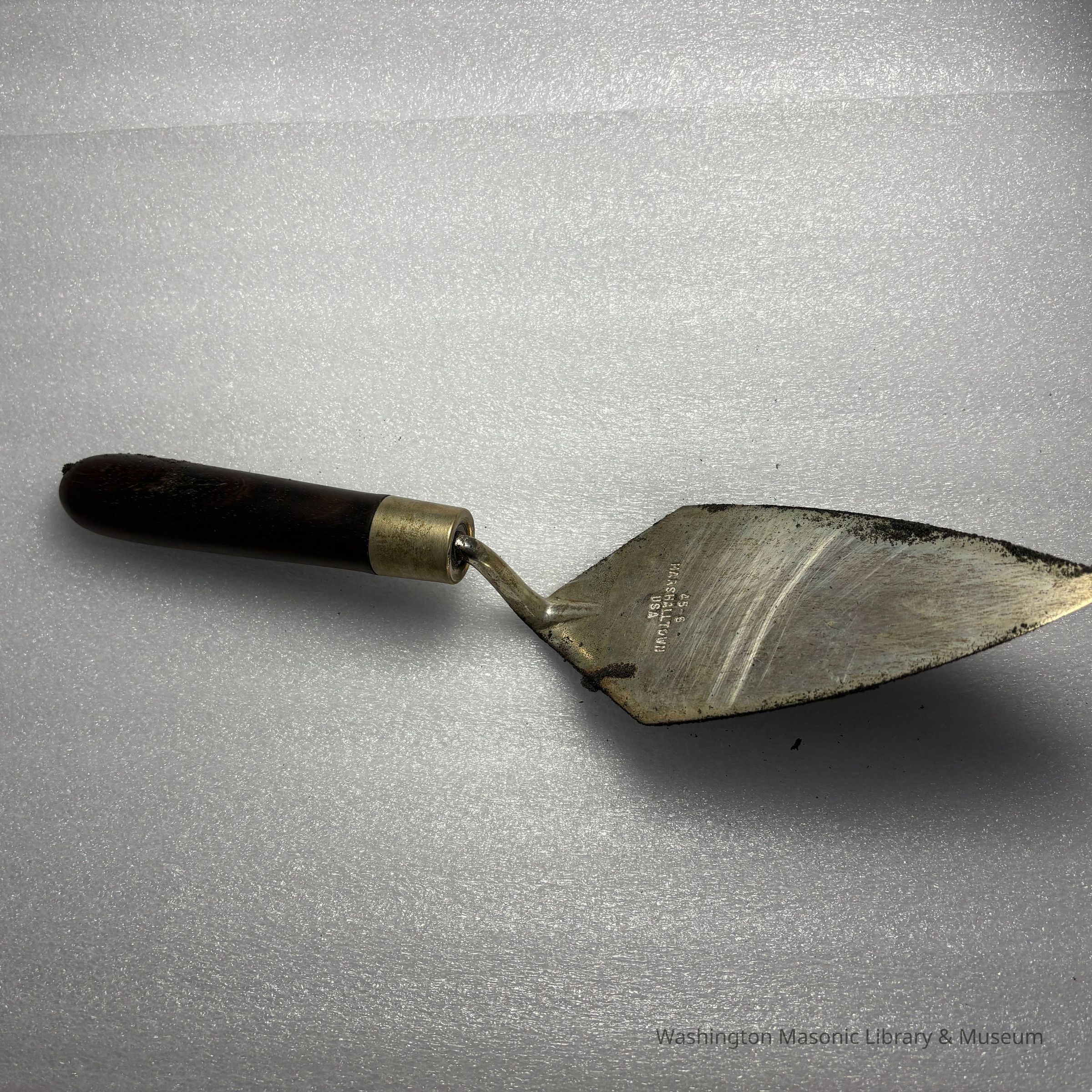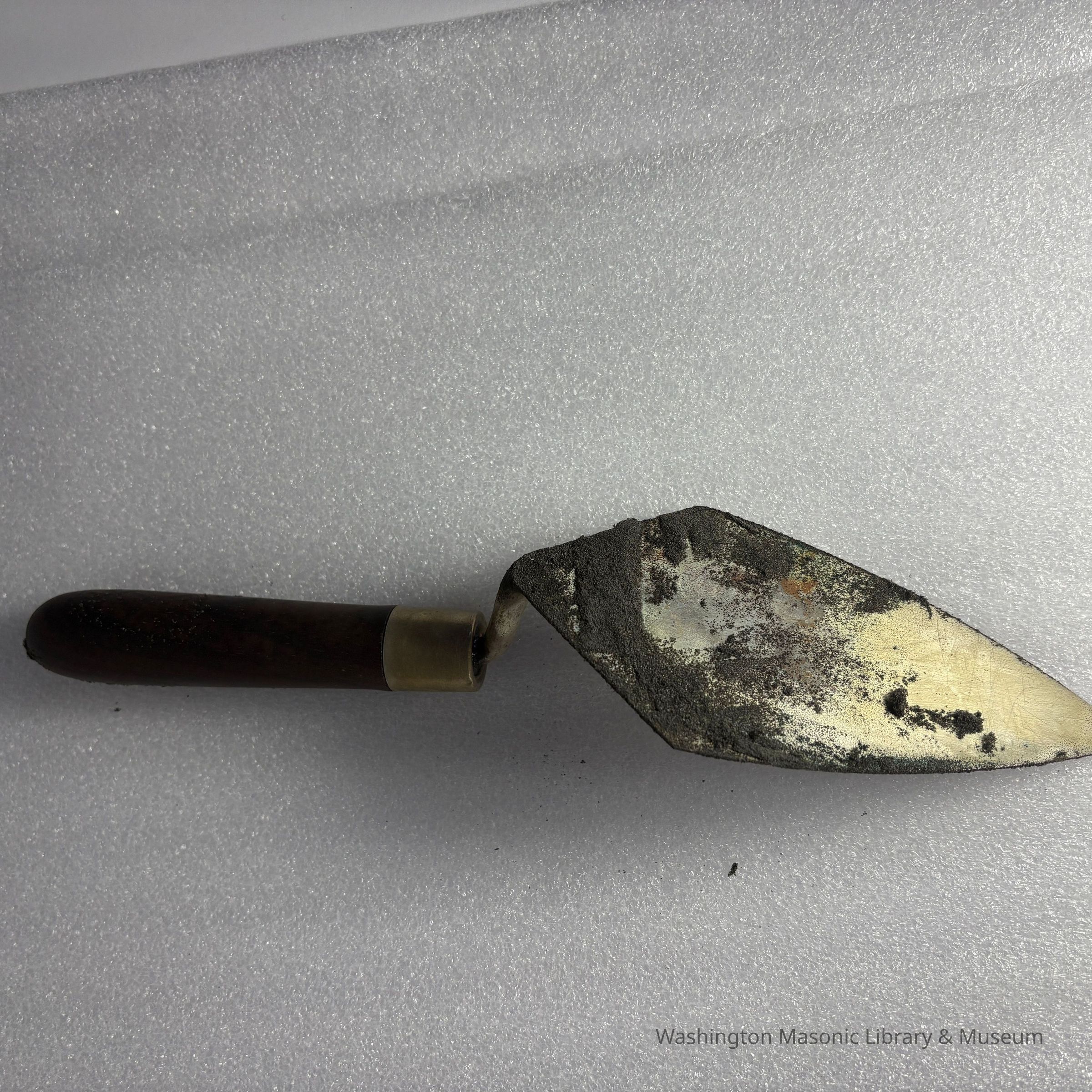 Trowel and Box: Trowel used by M.I.C. Elgan W. Cox for sealing the vault during the crypt opening and redepositing ceremonies Aug. 25, 1980. It is hoped that it will be used again at the ceremonies Aug. 25, 2030.