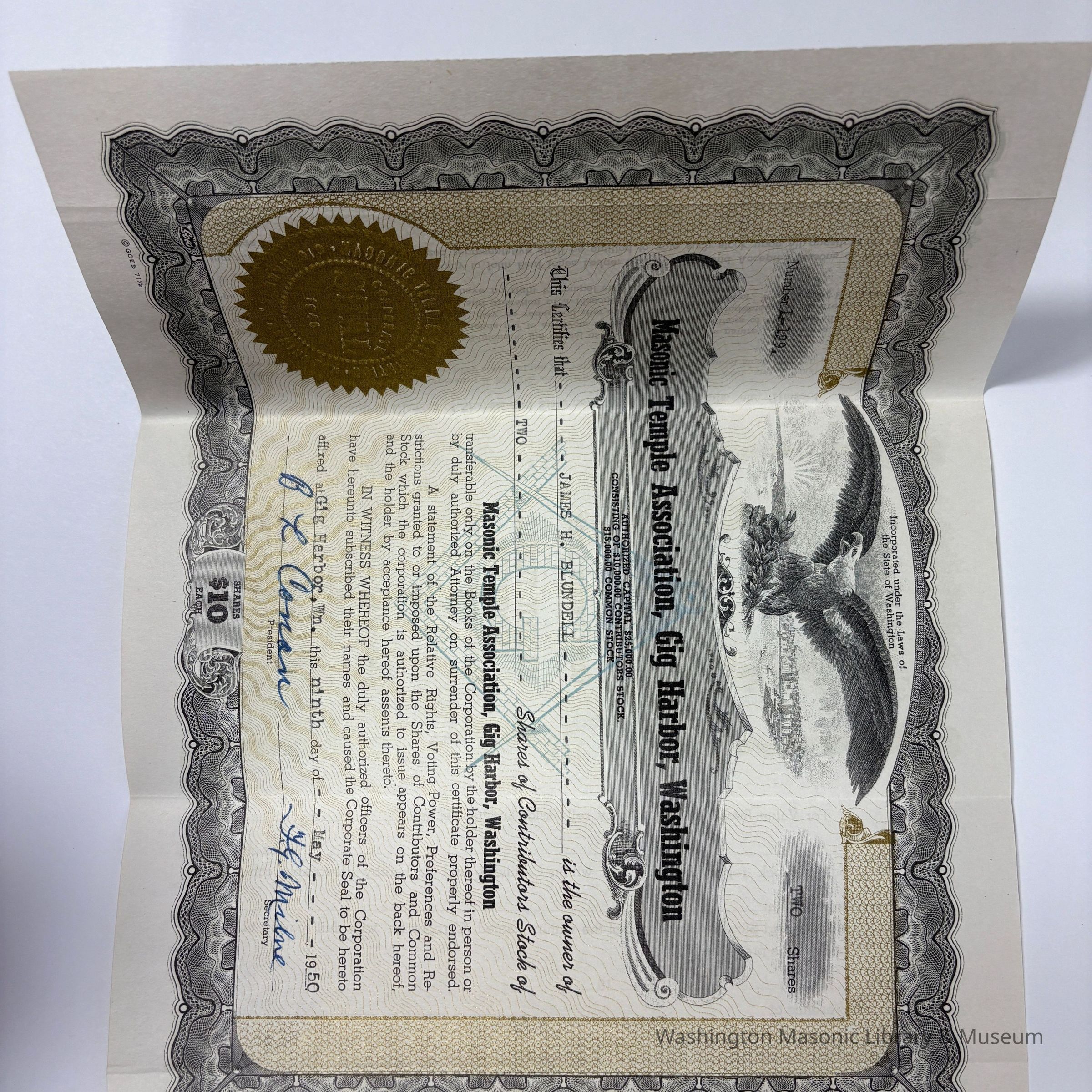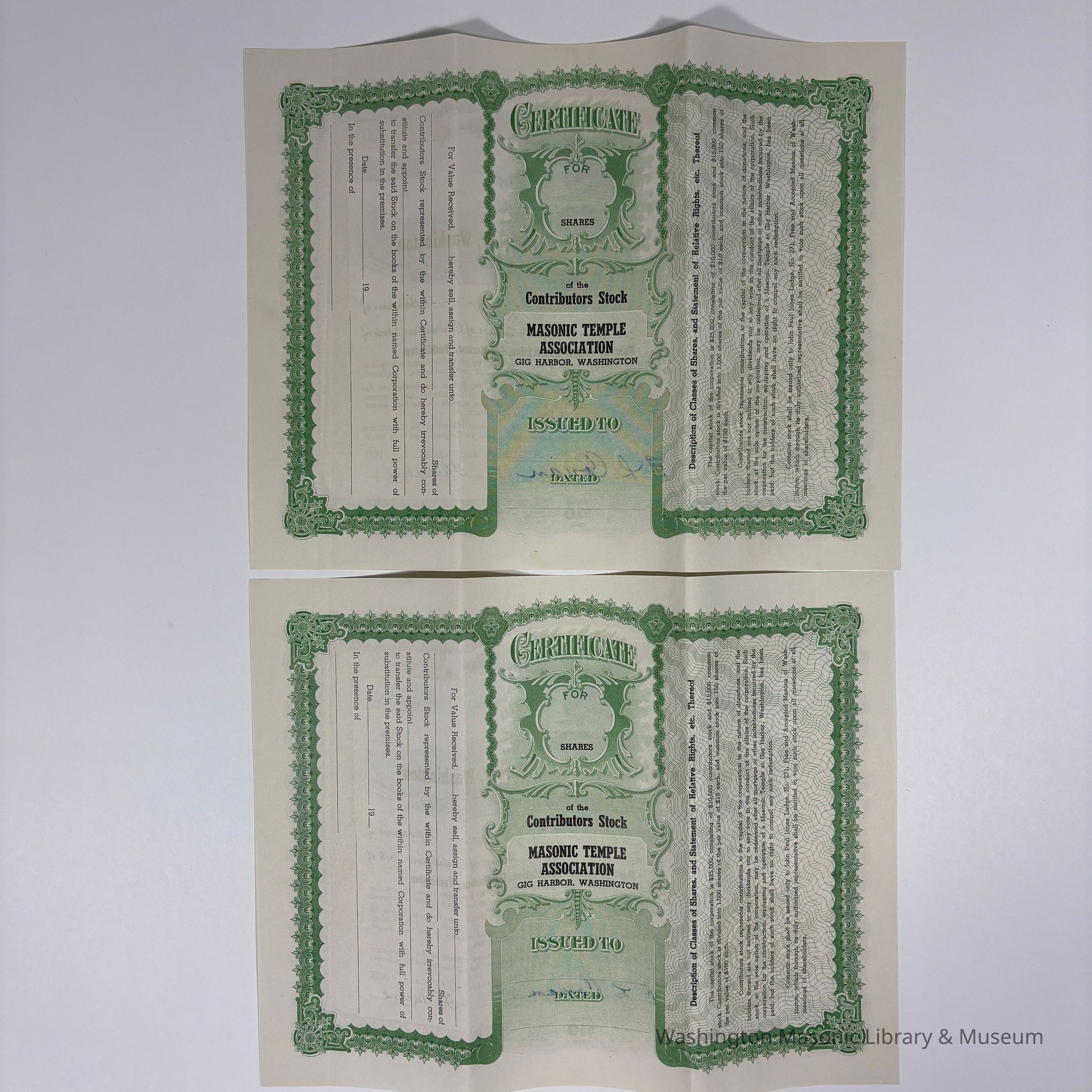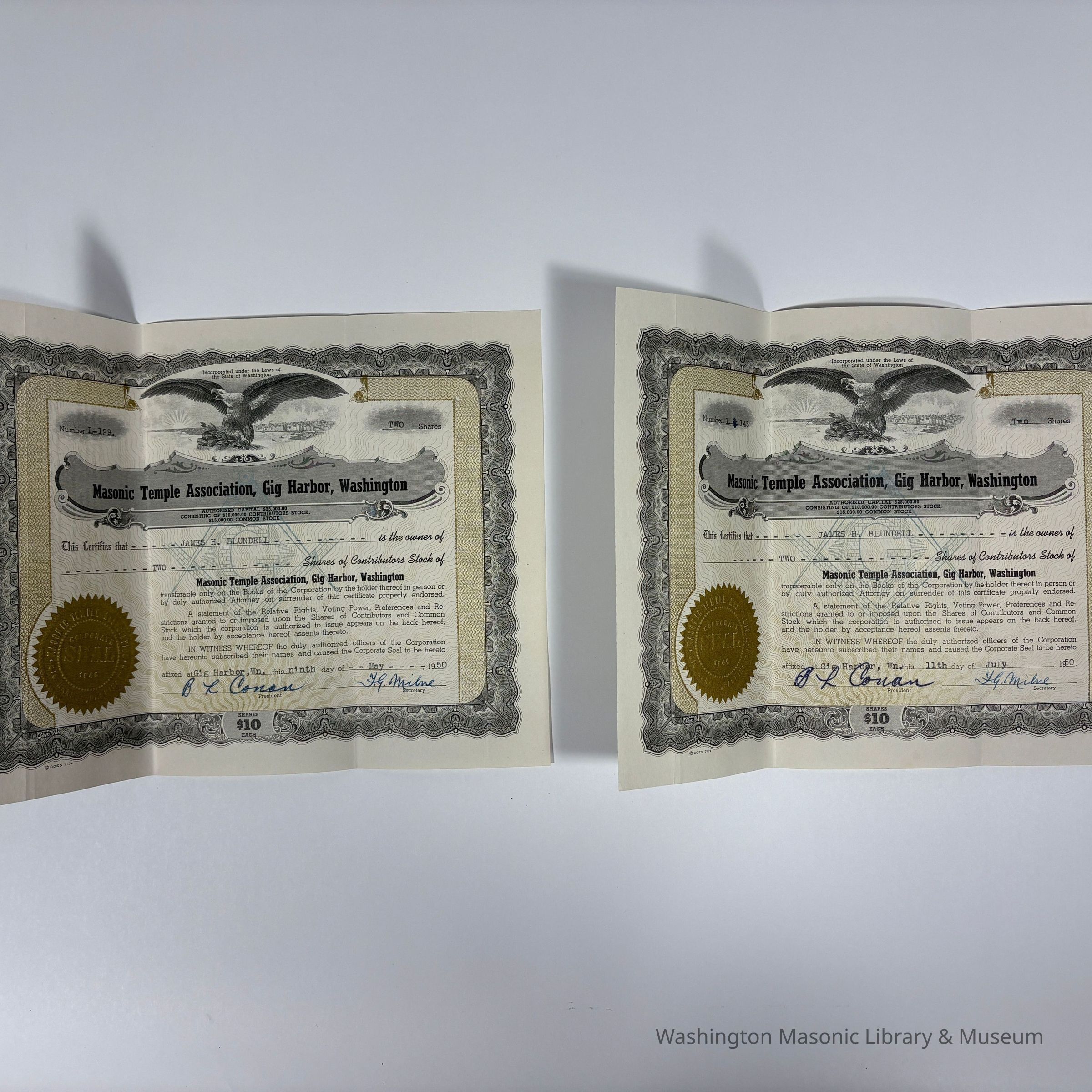 Two Certificates: 2 Masonic Temple Association, Gig Harbor, Washington Share Certificates issued to James H. Blundell (1950).Entry/Object ID