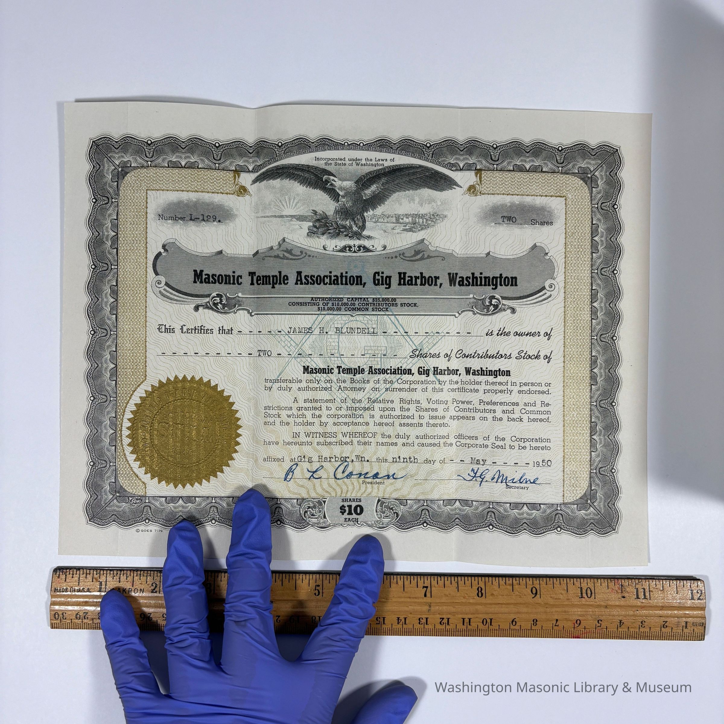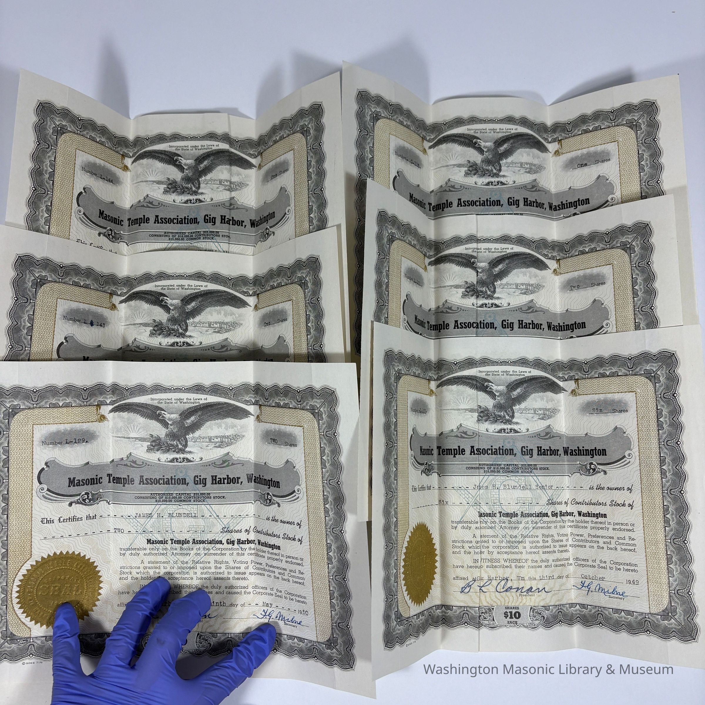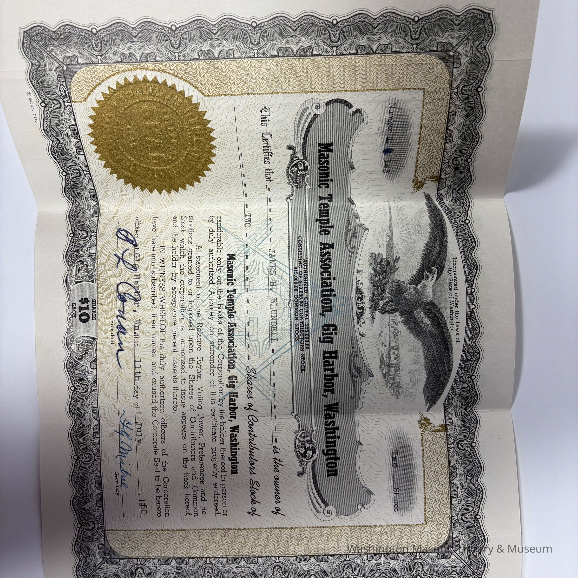 Two Certificates: 2 Masonic Temple Association, Gig Harbor, Washington Share Certificates issued to James H. Blundell (1950).Entry/Object ID