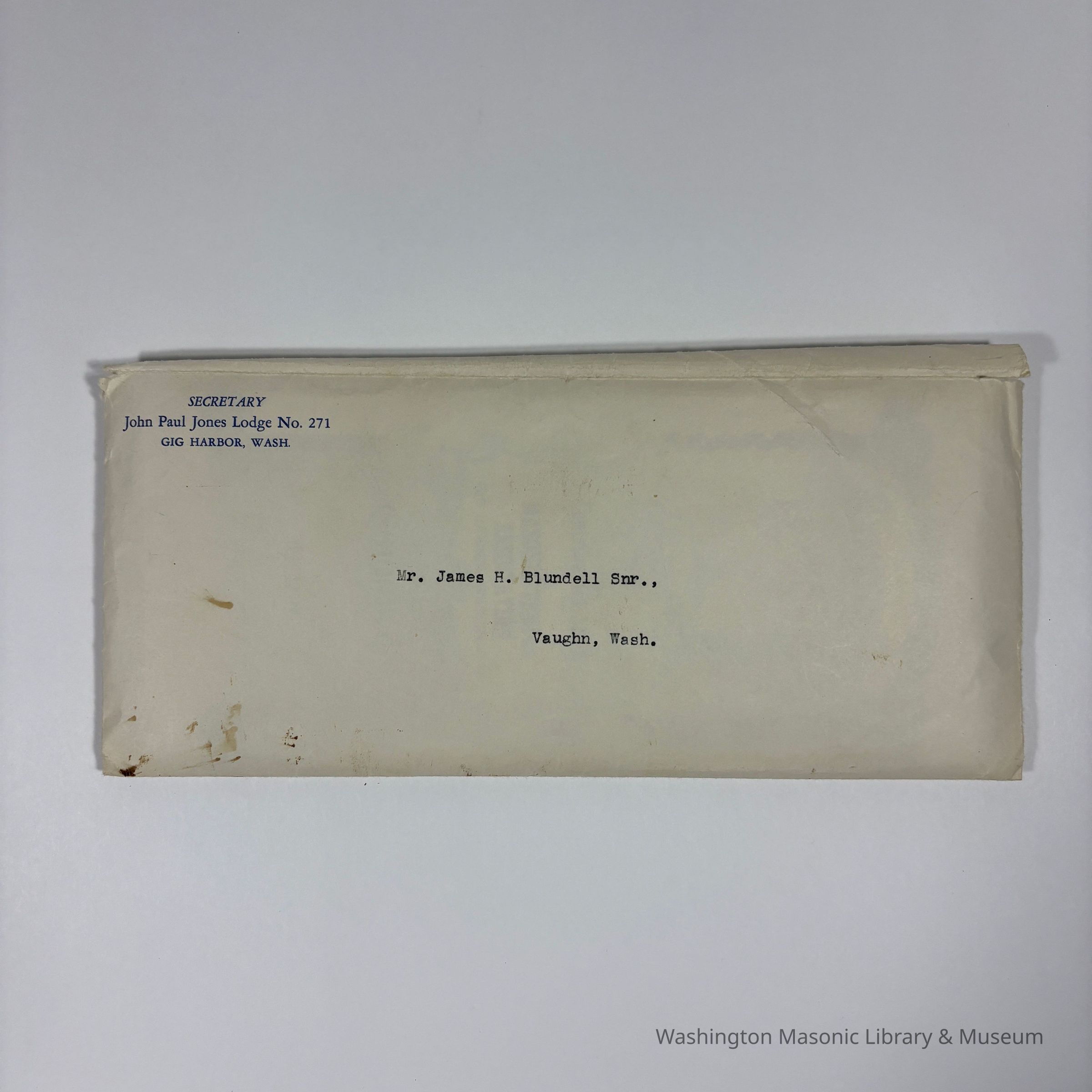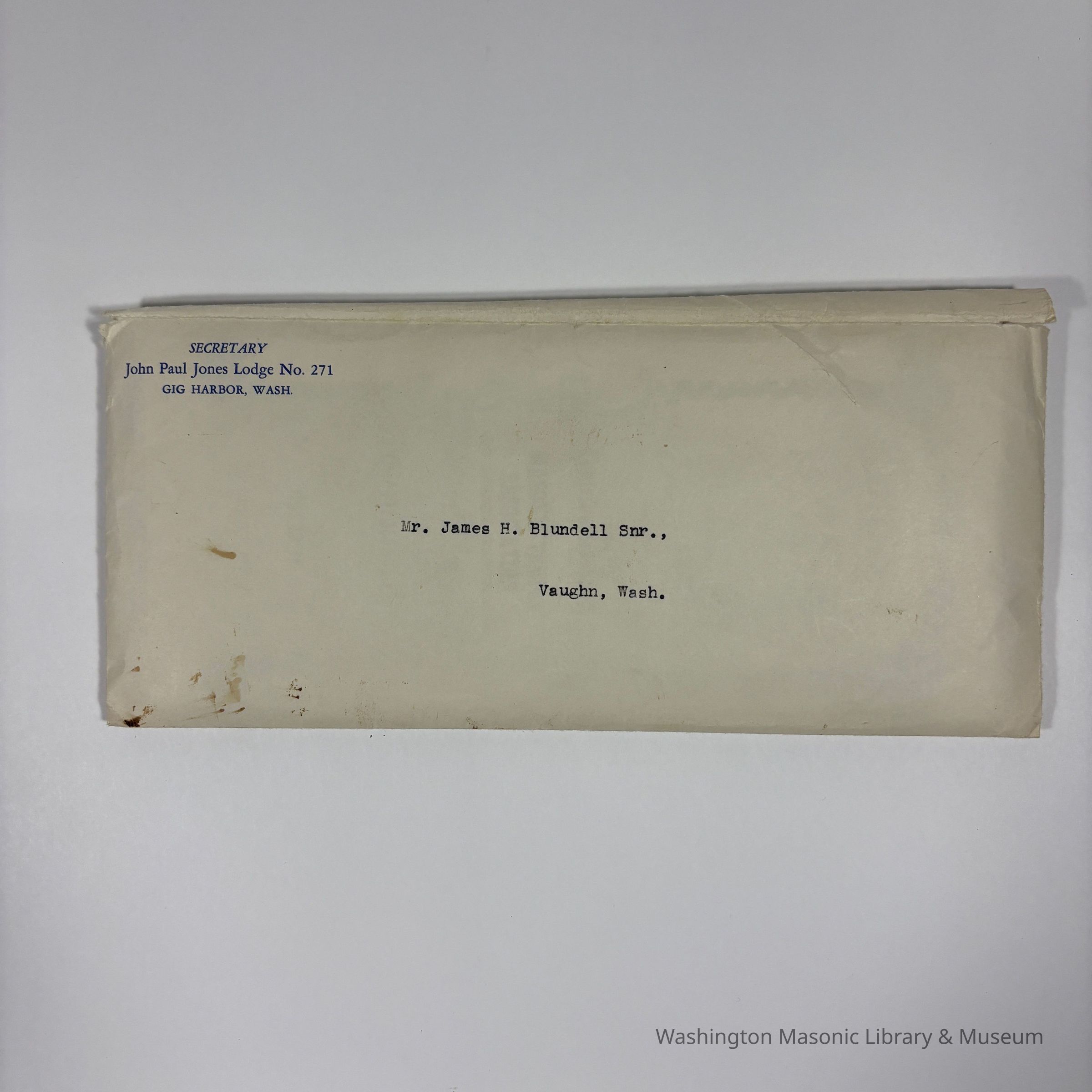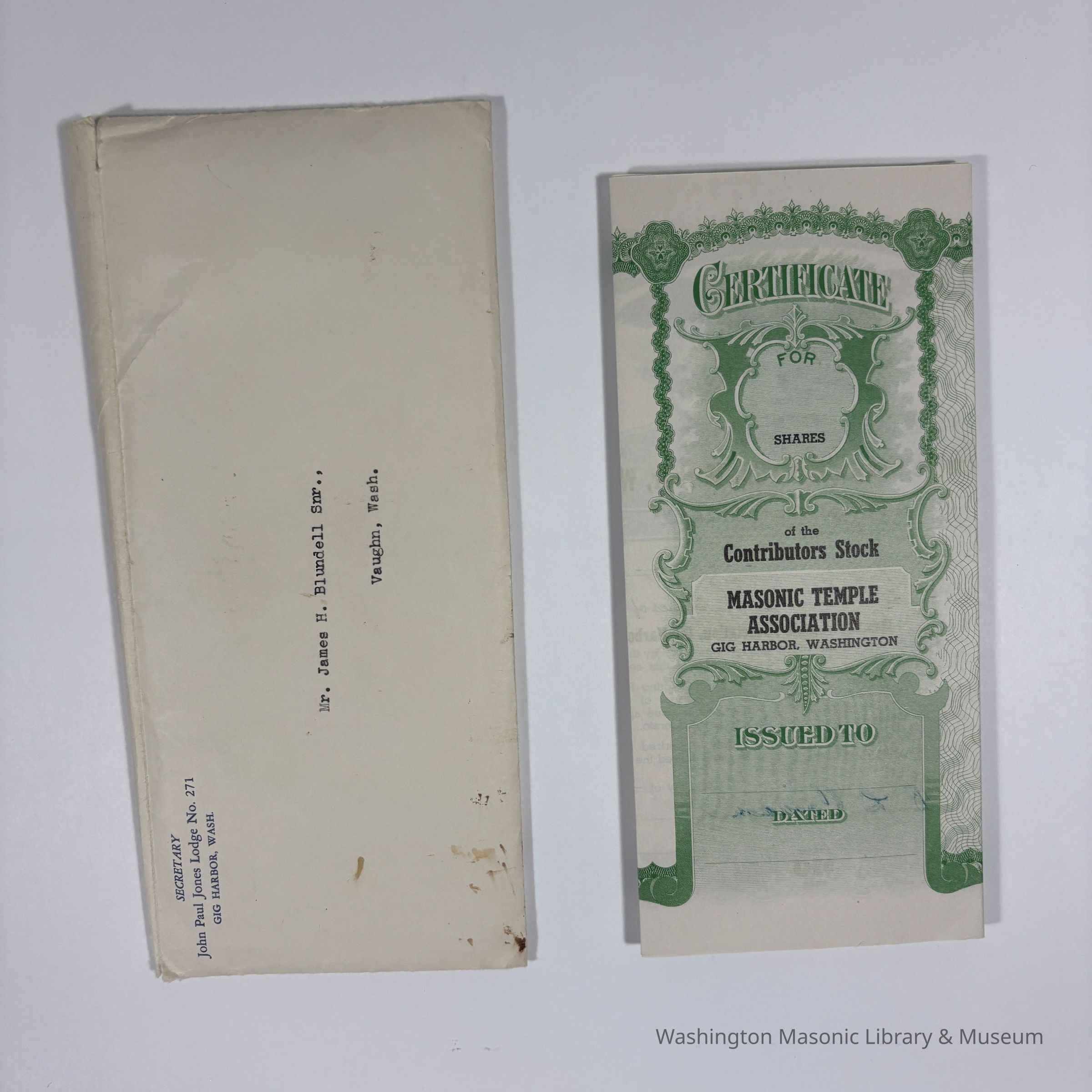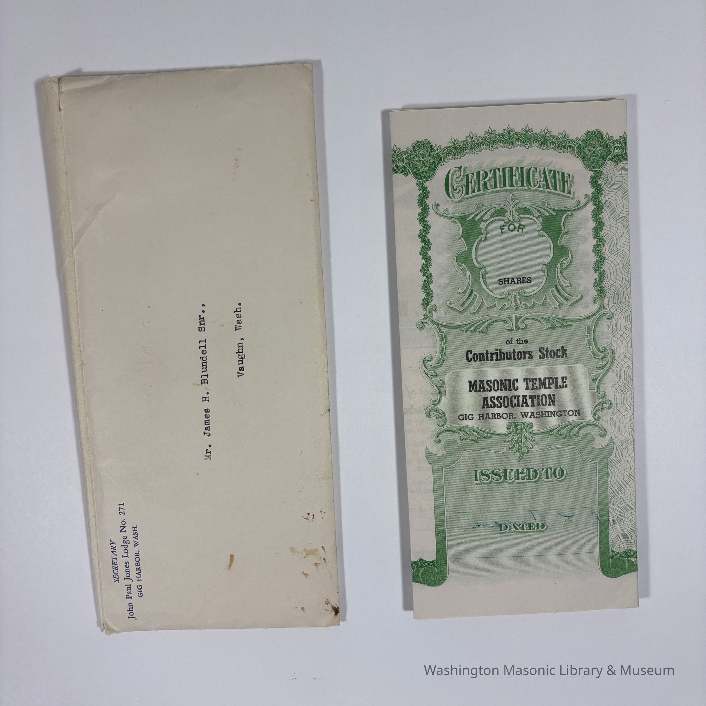 Two Certificates: 2 Masonic Temple Association, Gig Harbor, Washington Share Certificates issued to James H. Blundell by the Secretary of John Paul Jones Lodge No. 271.