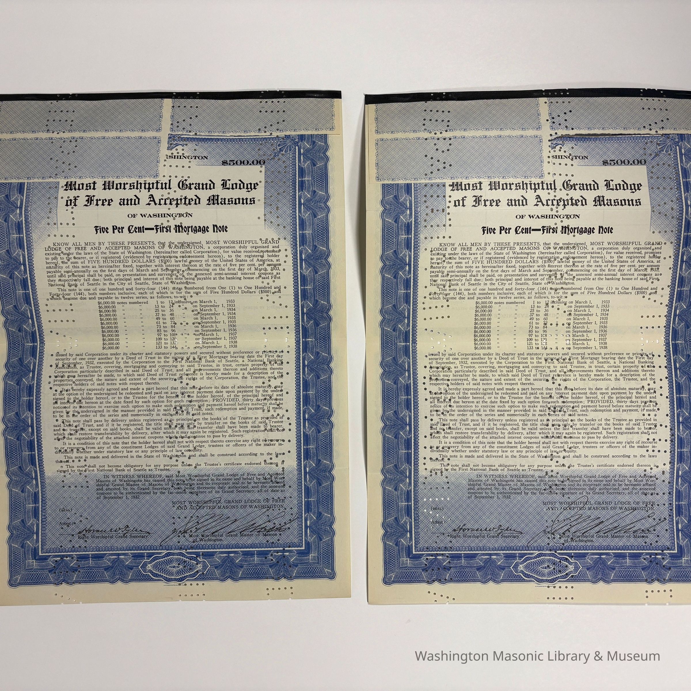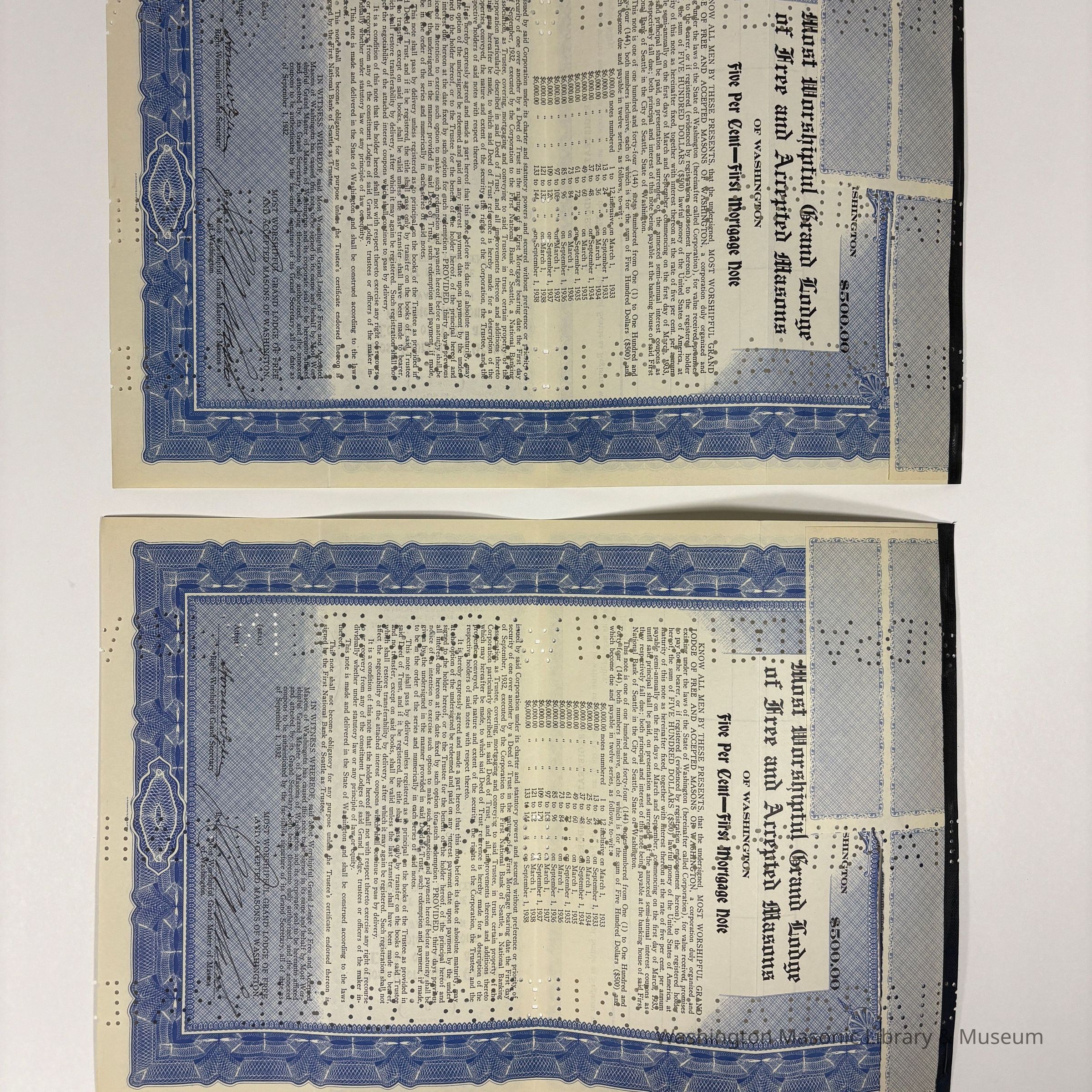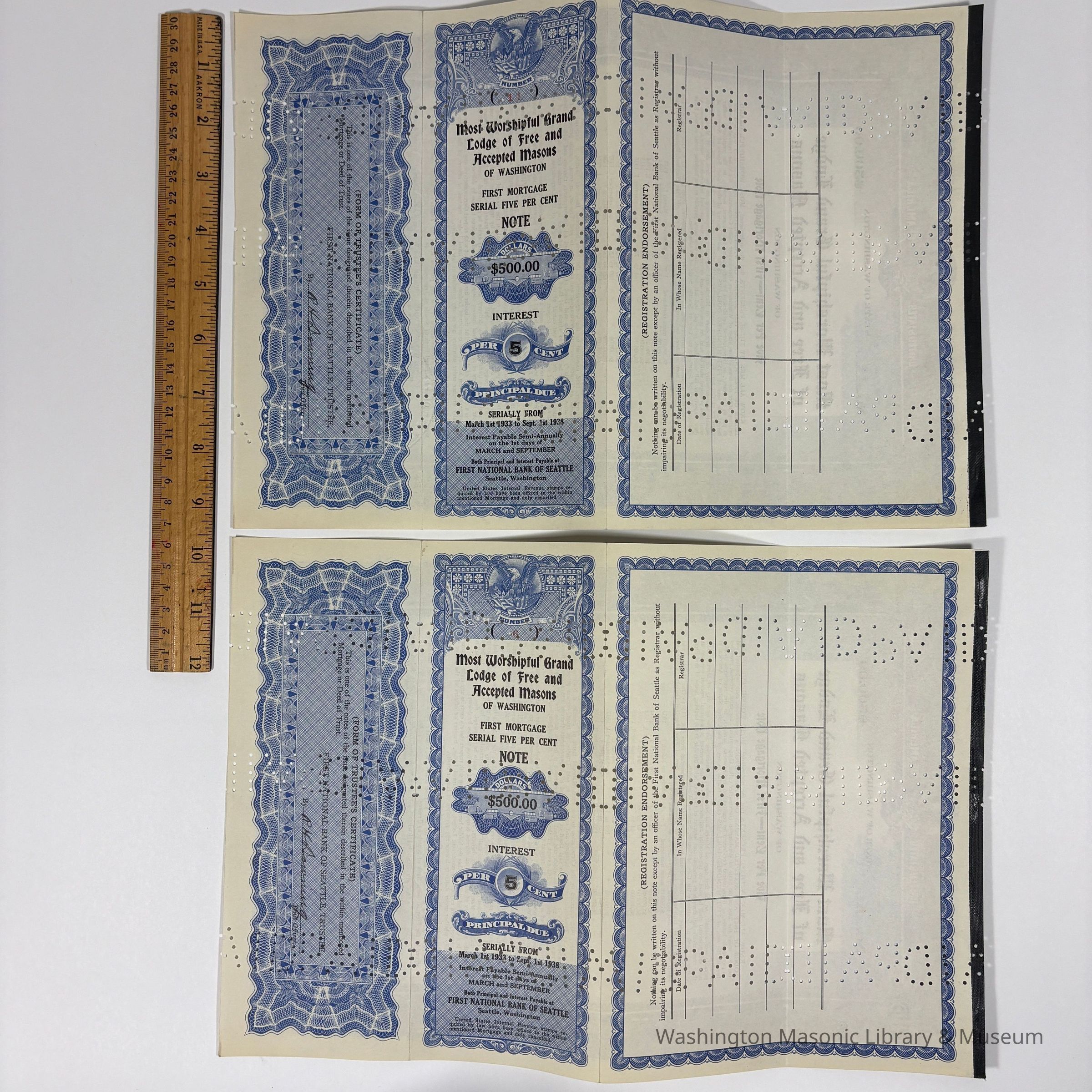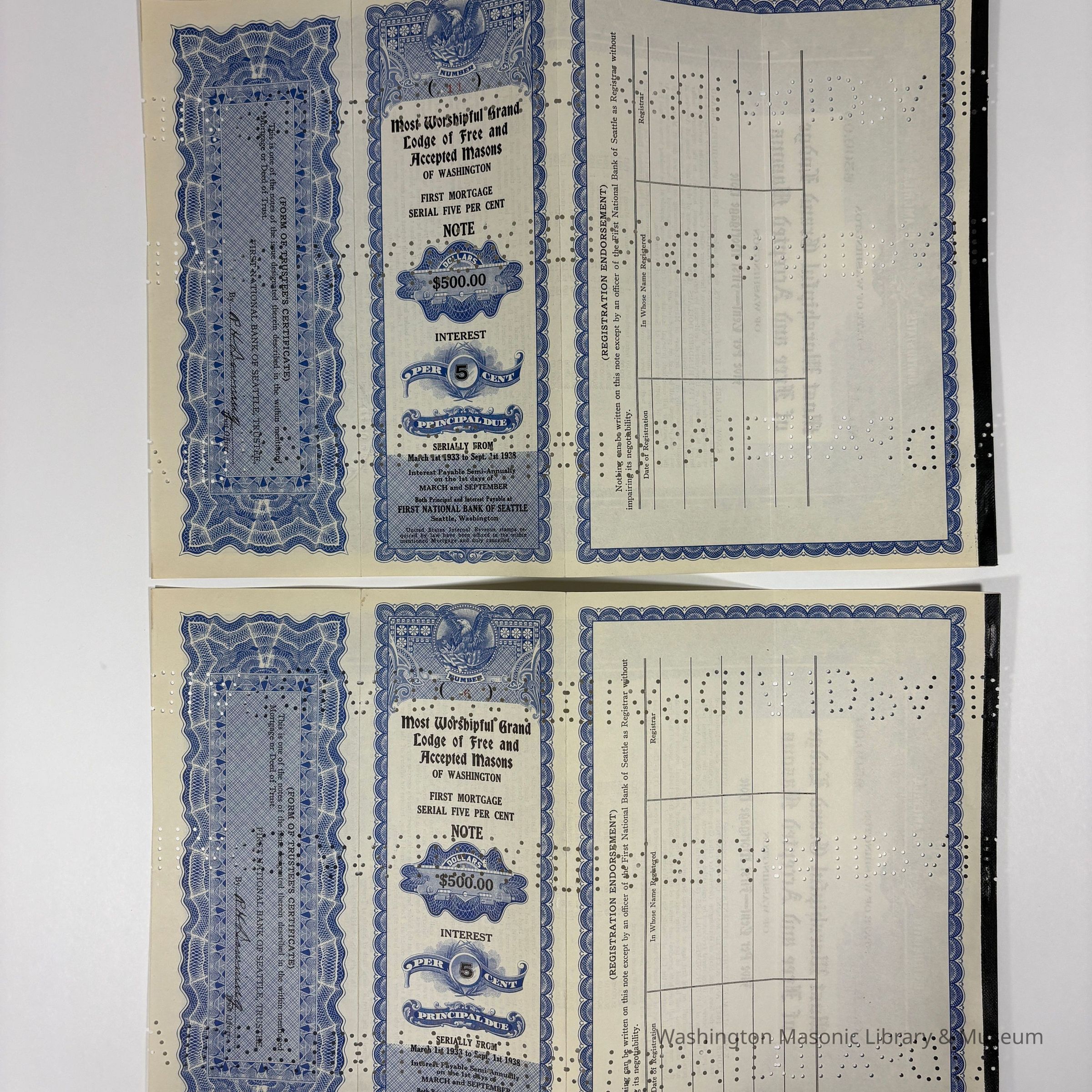 Two Notes: 2 Mortgage Notes issued by the Most Worshipful Grand Lodge of Washington for $500. Serially from March 1st, 1933 to September 1st, 1933. 5 Percent Interest. First National Bank of Seattle, Seattle Washington. (1933). Punch holes throughout.Create Date