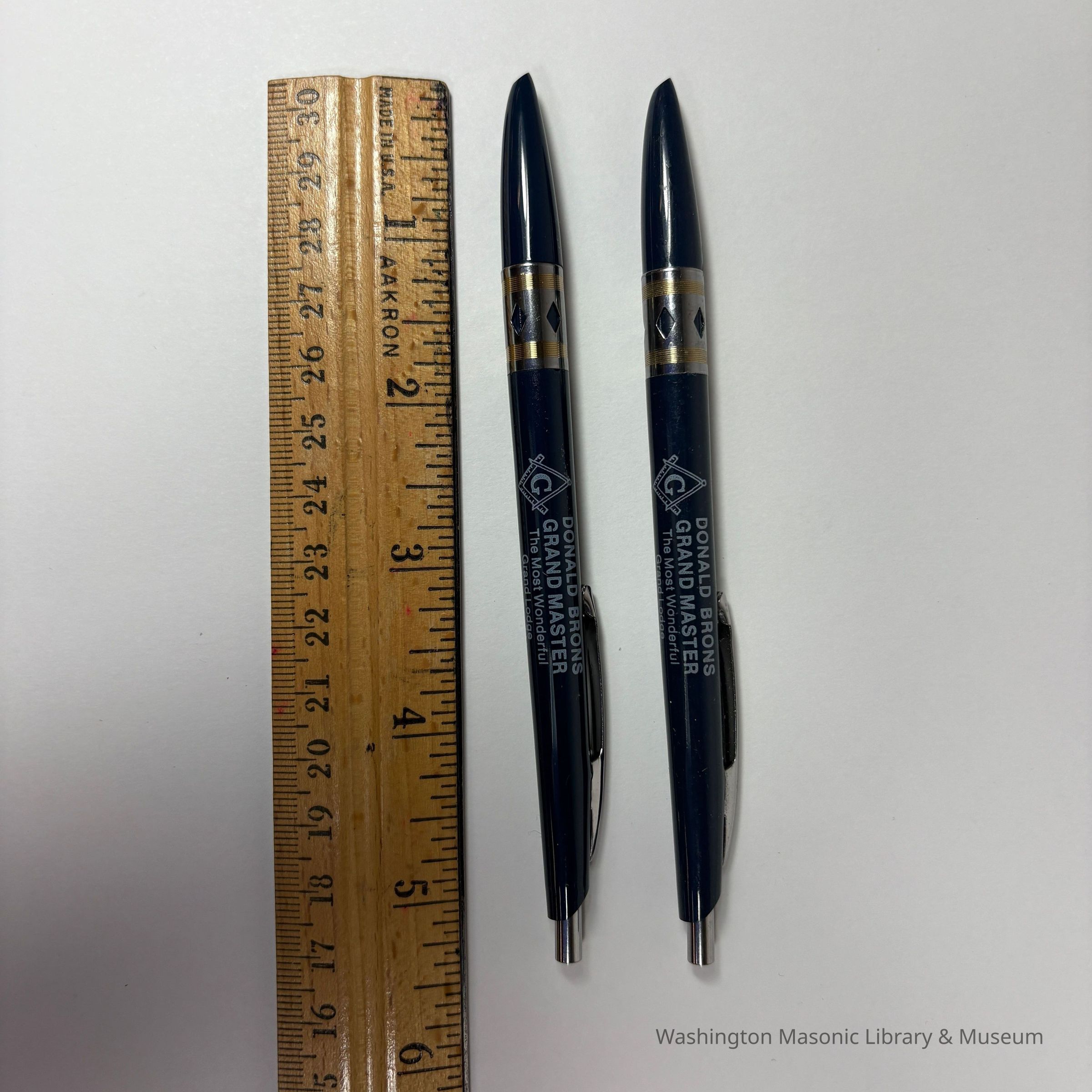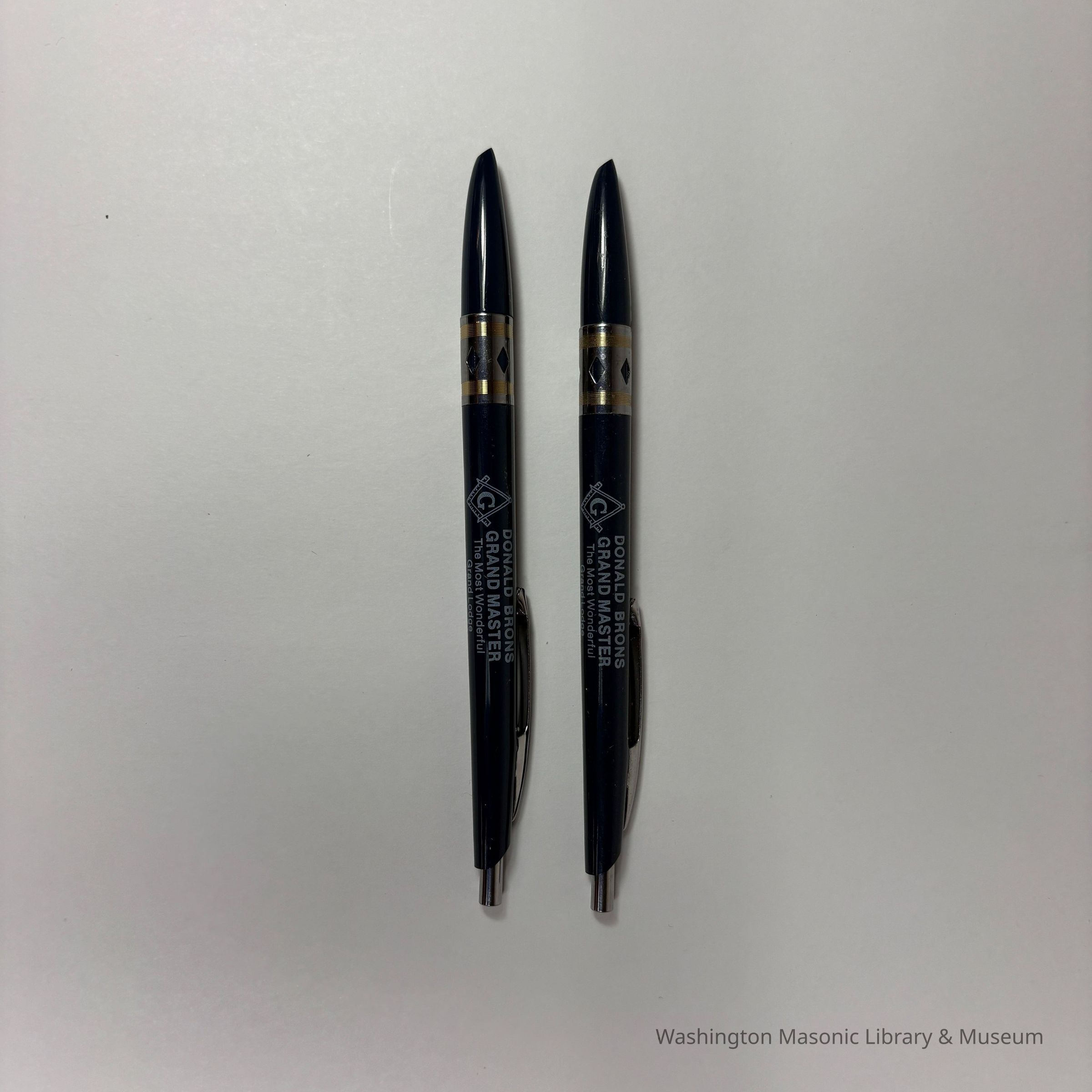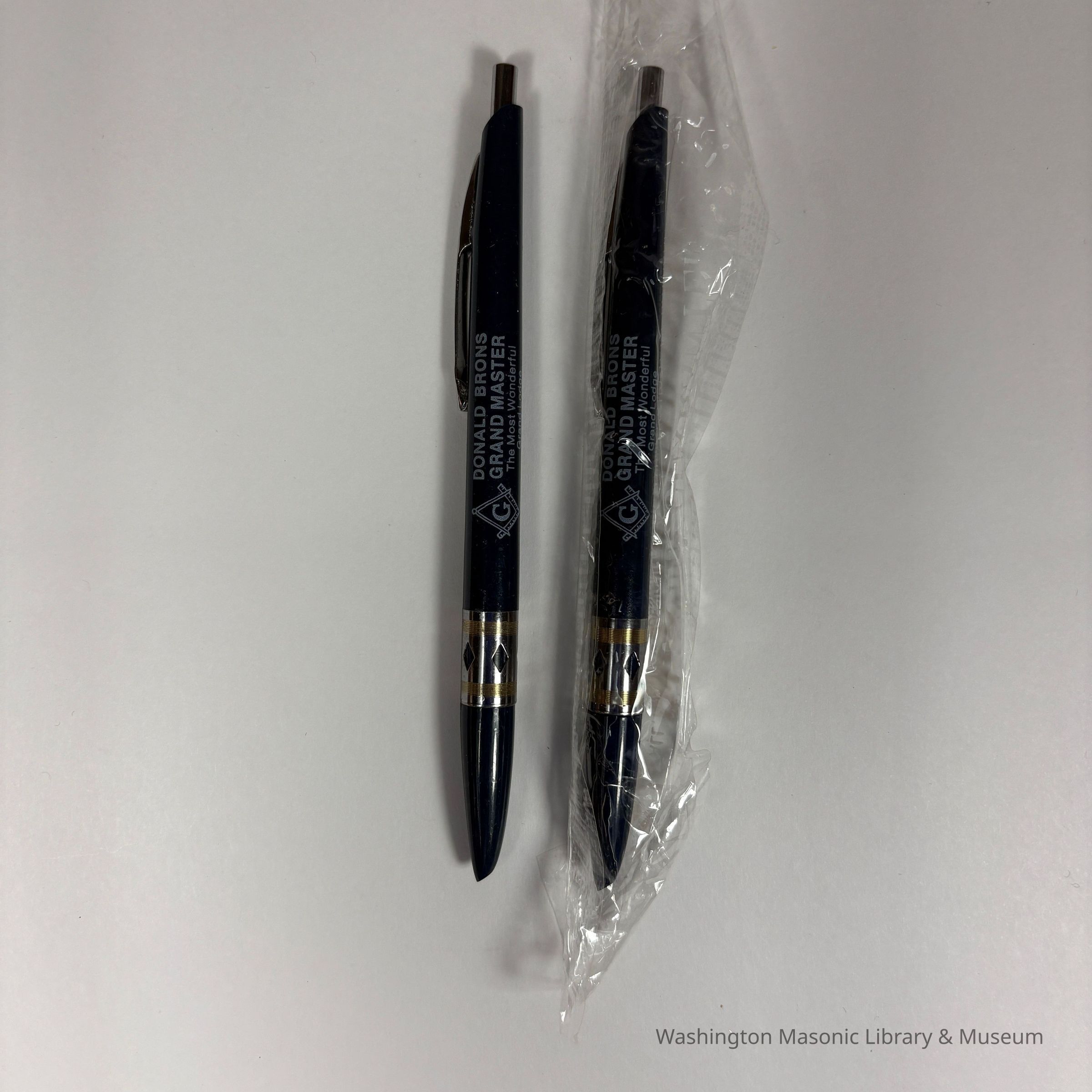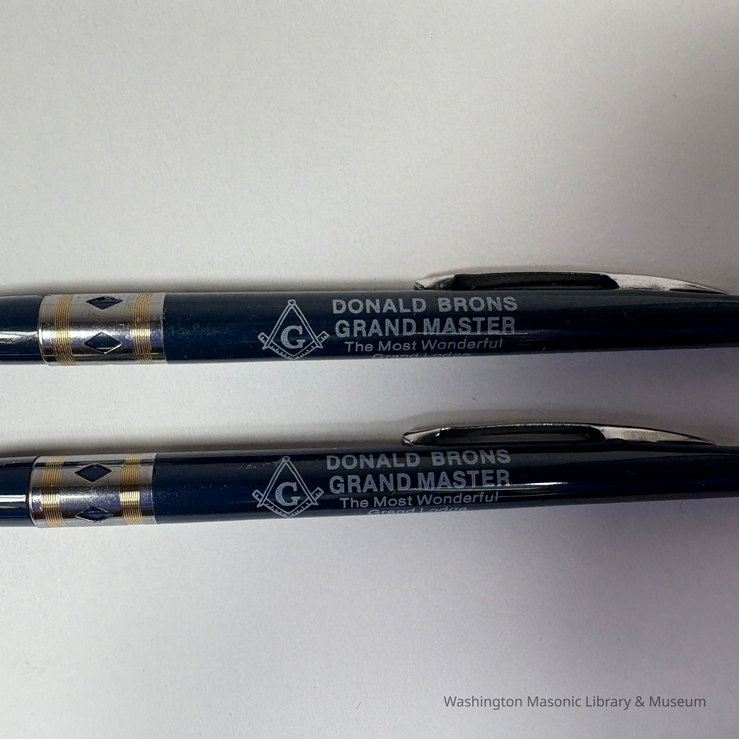Two Pens: Dark Blue with silver accents. "Donald Brons/Grand Master/The Most Worshipful Grand Lodge Free and Accepted Masons of Washington". Brons was Grand Master (1983-1984)Collection