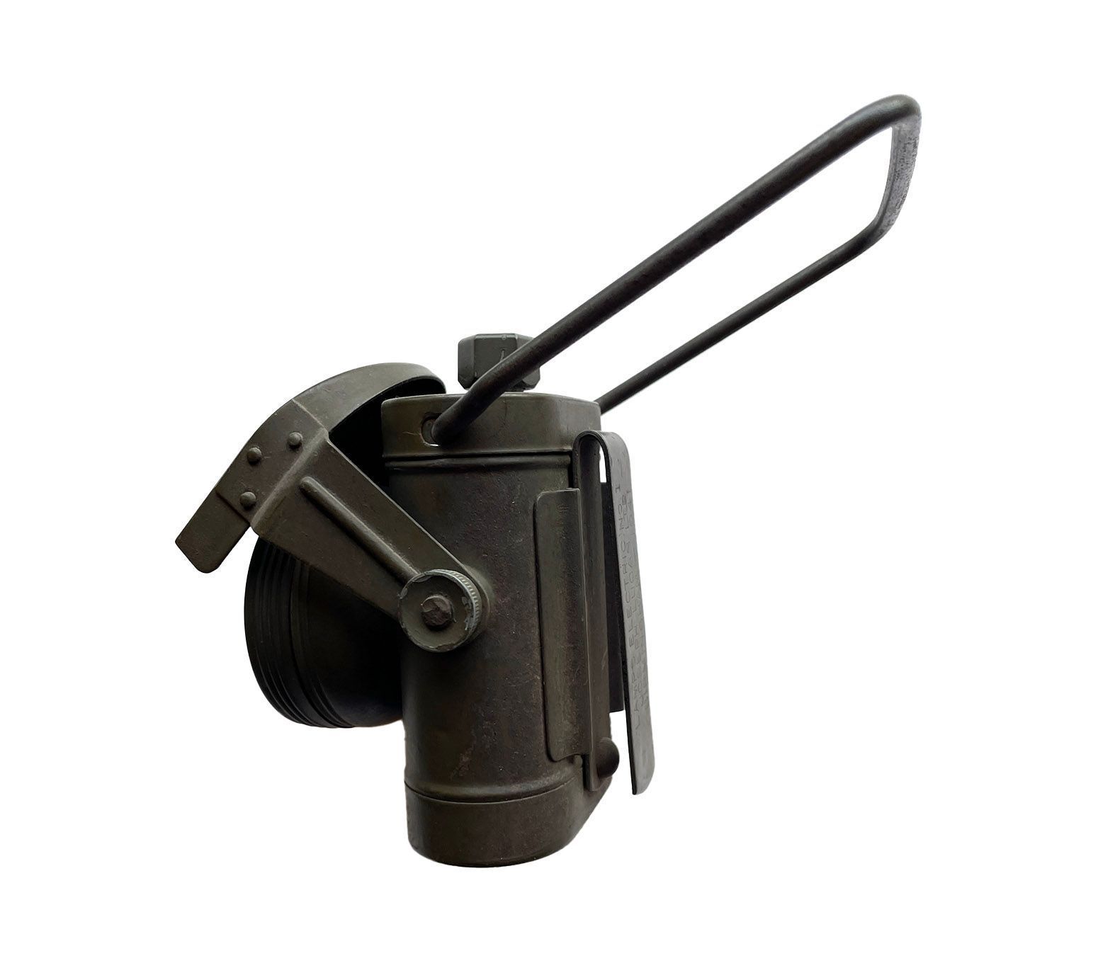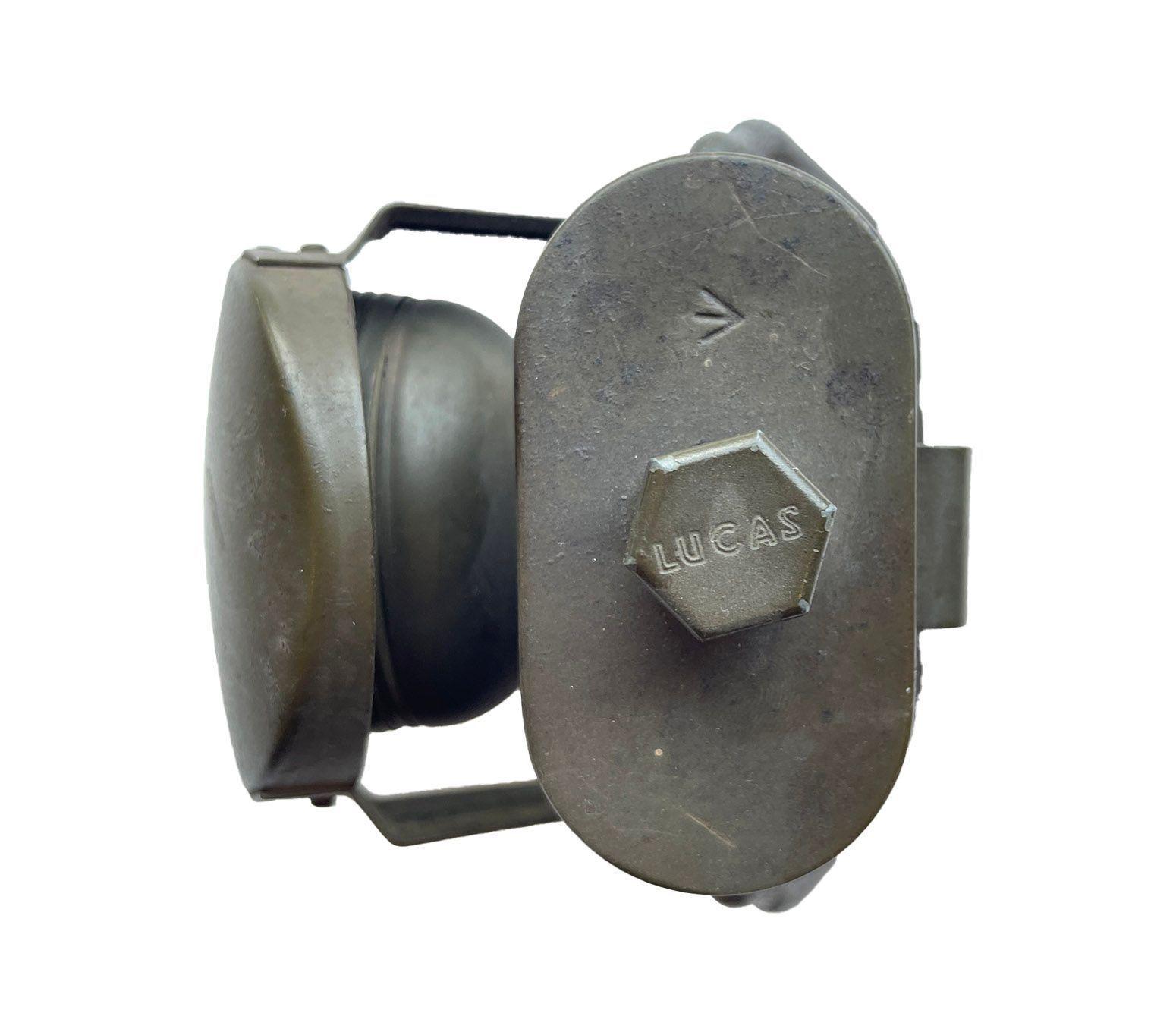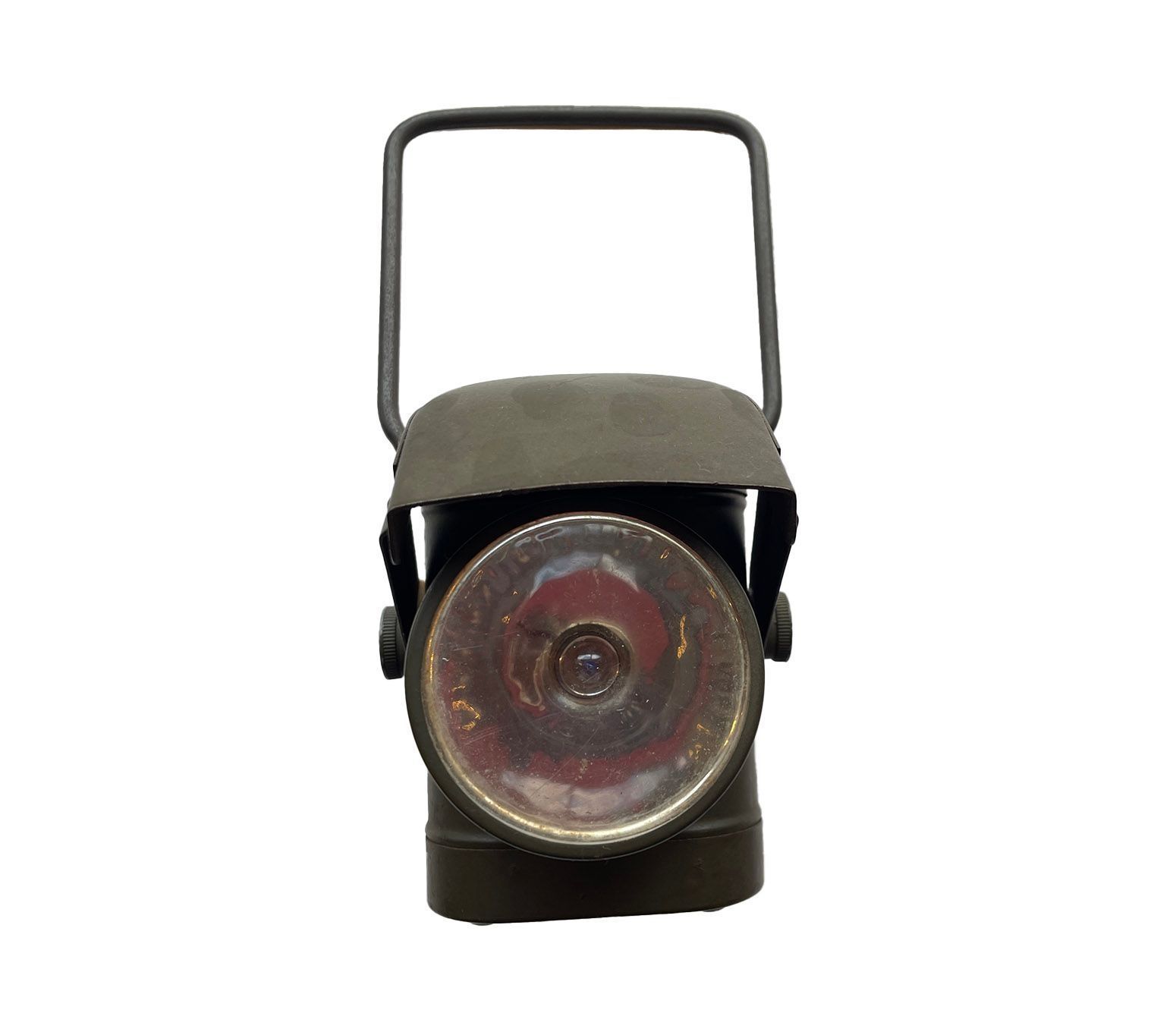Metal khaki coloured torch with an external moveable shutter to cover the beam of light, a carrying handle, an off/on button on the top, stamped Lucas and a hook to attach to a belt or onto a bicycle.. The lens has an internal shutter than can decrease the light emitted to a minimum. Manufactured by Joseph Lucas 1941. Lucas is stamped on the top alongside a WD (War Department) arrow. On the back of the lamp on the hook it is marked LAMPS ELECTR.C.No.1 JOSEPH LUCAS LYD> BIRMINGHAM – 1941.Context