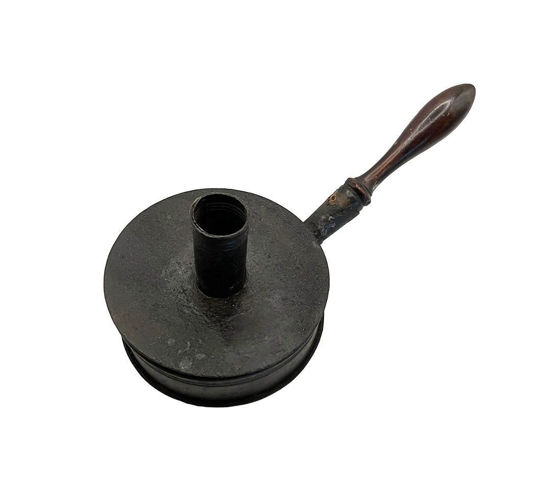 Small tin pan with a turned wood handle. The set includes a tight fitting 'damper' lid and candle stick to rest on the top of the pan. Also a metal striker and a flint.Context