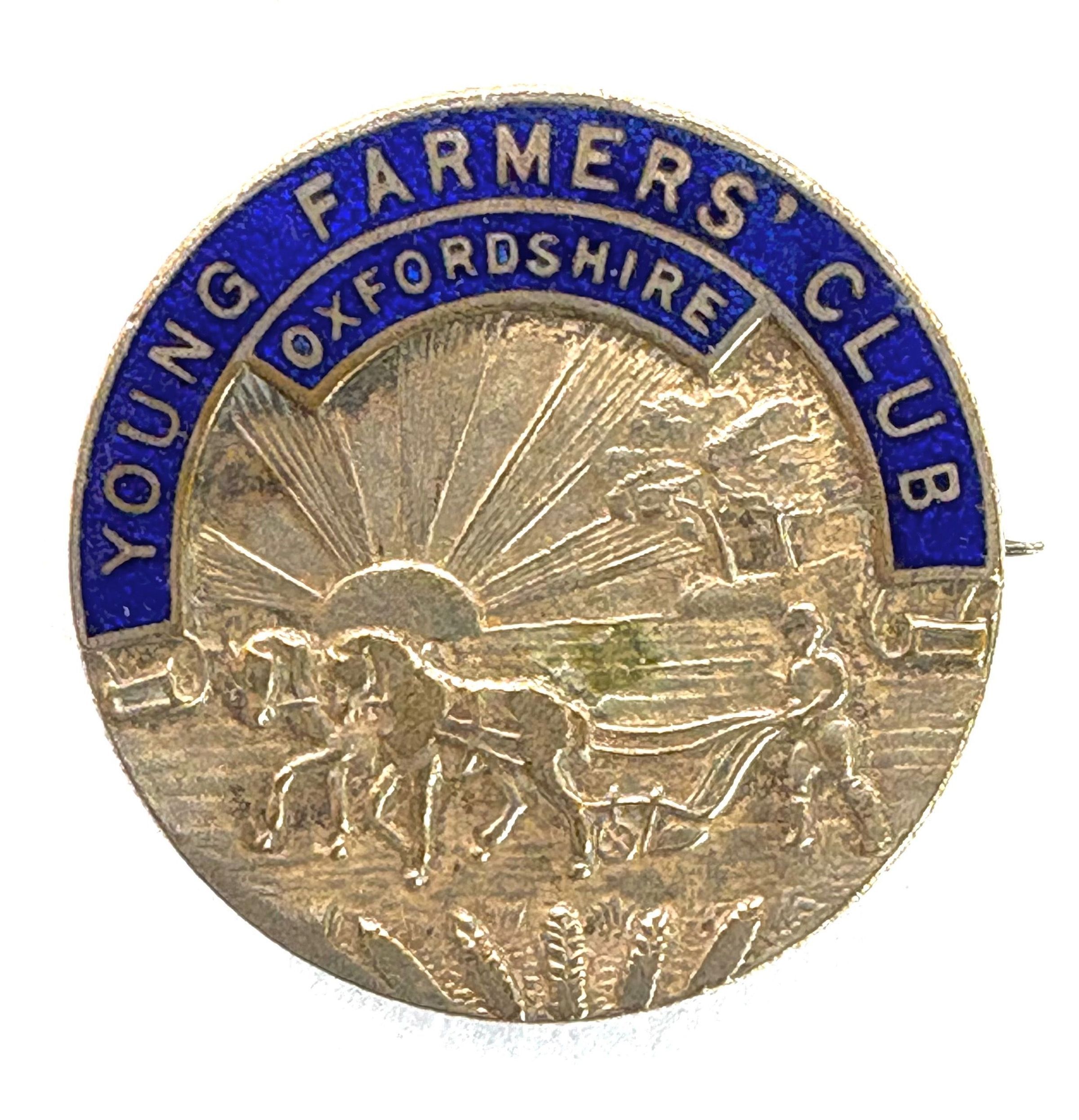 The Young Farmers Club was started in 1921 in Devon. The badge or supporters pin may have started in the 1940s. The design of the sunrise on the horizon, embossed pair of horses ploughing, the ploughboy and the wheat in the foreground remained very much the same for many years. Originally the badge was only inscribed with Young Farmers Club, the county was a later addition.Category