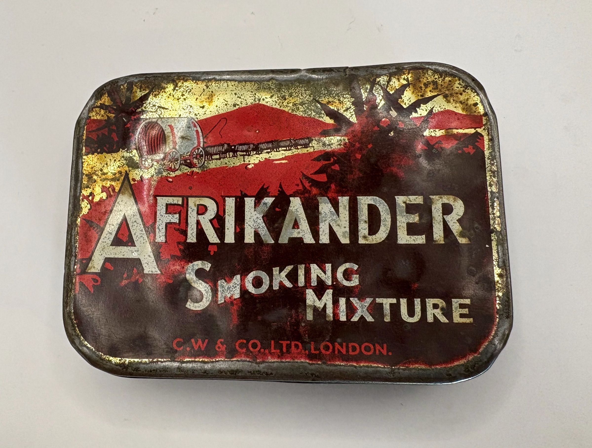 Afrikander Tobacco refers to a vintage brand, specifically "Afrikander Smoking Mixture," produced by Cohen Weenen & Co. in London, popular in the early 20th century, known for its distinct tins featuring wagons and bold graphics, primarily sold in the UK and South Africa, and now a sought-after collector's item in the tobacciana market.Cataloged By