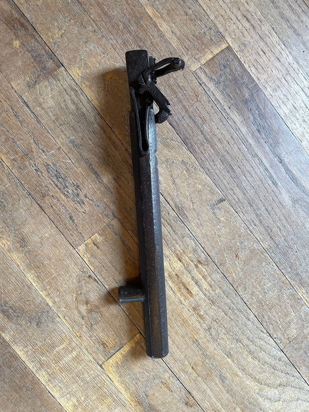 Heavy iron gun, with cavity for charge and mechanism for trip wires to detonate the explosive.Context