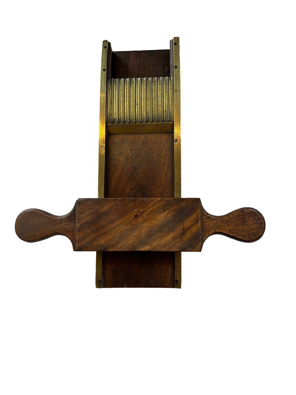 Brass and wood two part machine for rolling out pill-paste and cutting it into circular pills. Likely to be 18th century because of the brass and mahogany construction.Context