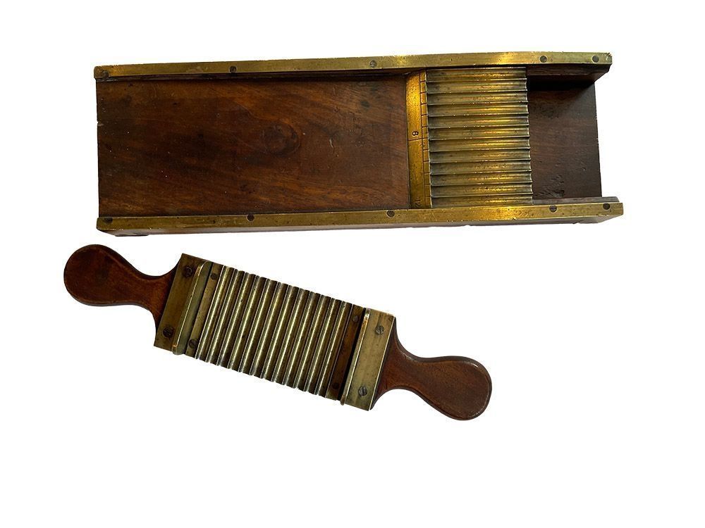 First appearing in the mid-1700s the pill making machine soon became an essential item of the Victorian chemist’s shop. The pill mixtures, including a binding agent, would be rolled into a sausage shape and laid across the metal corrugated brass plate, then the corresponding side of the paddle roller would cut the pills into shape.