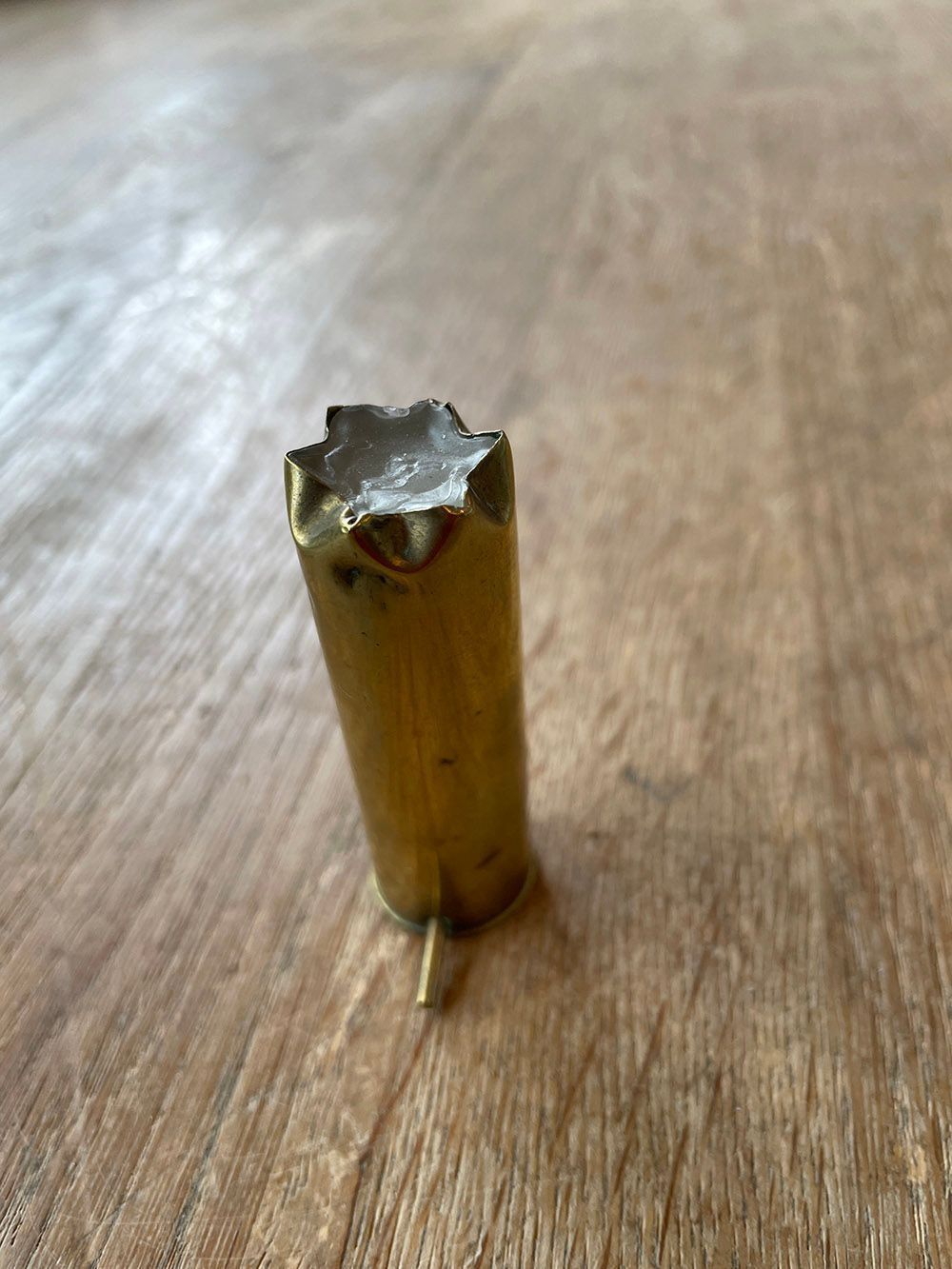 12 bore brass cartridge, pin-fire, wax sealed.Context