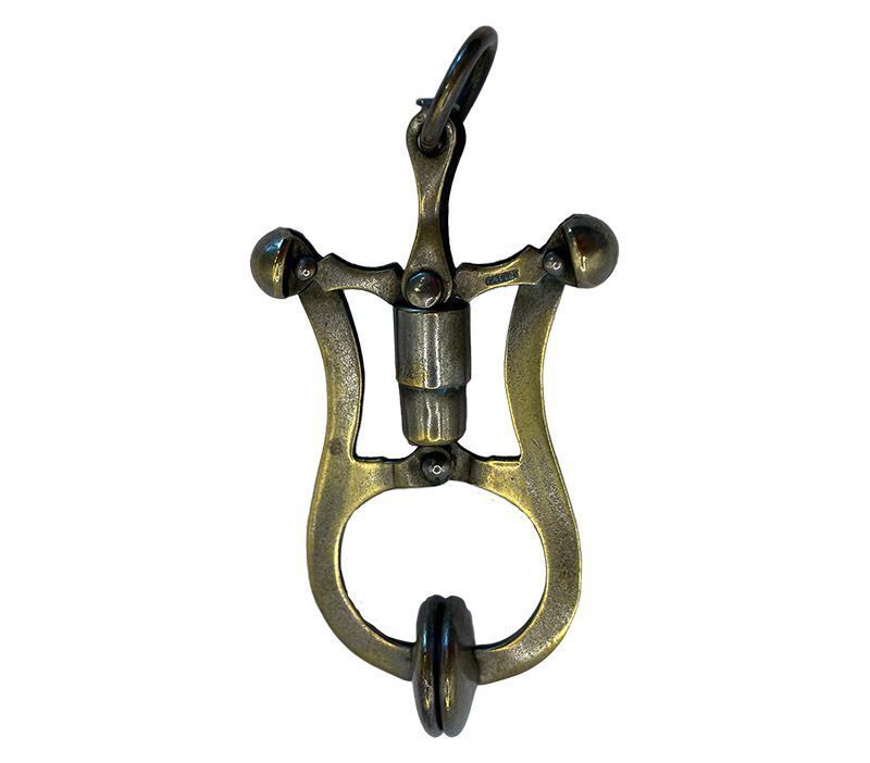 A solid brass skirt lifter, with a pair of 'tongs' to hold the skirt and a ring to attach, with a cord/ribbon, to the waist or belt. Also known as a skirt grip, dress suspender, hem-holder or page or porte-jupe. Sometimes some of the heavier lifters were used to hold down the fabrics to maintain modesty when playing sports, for instance.Context