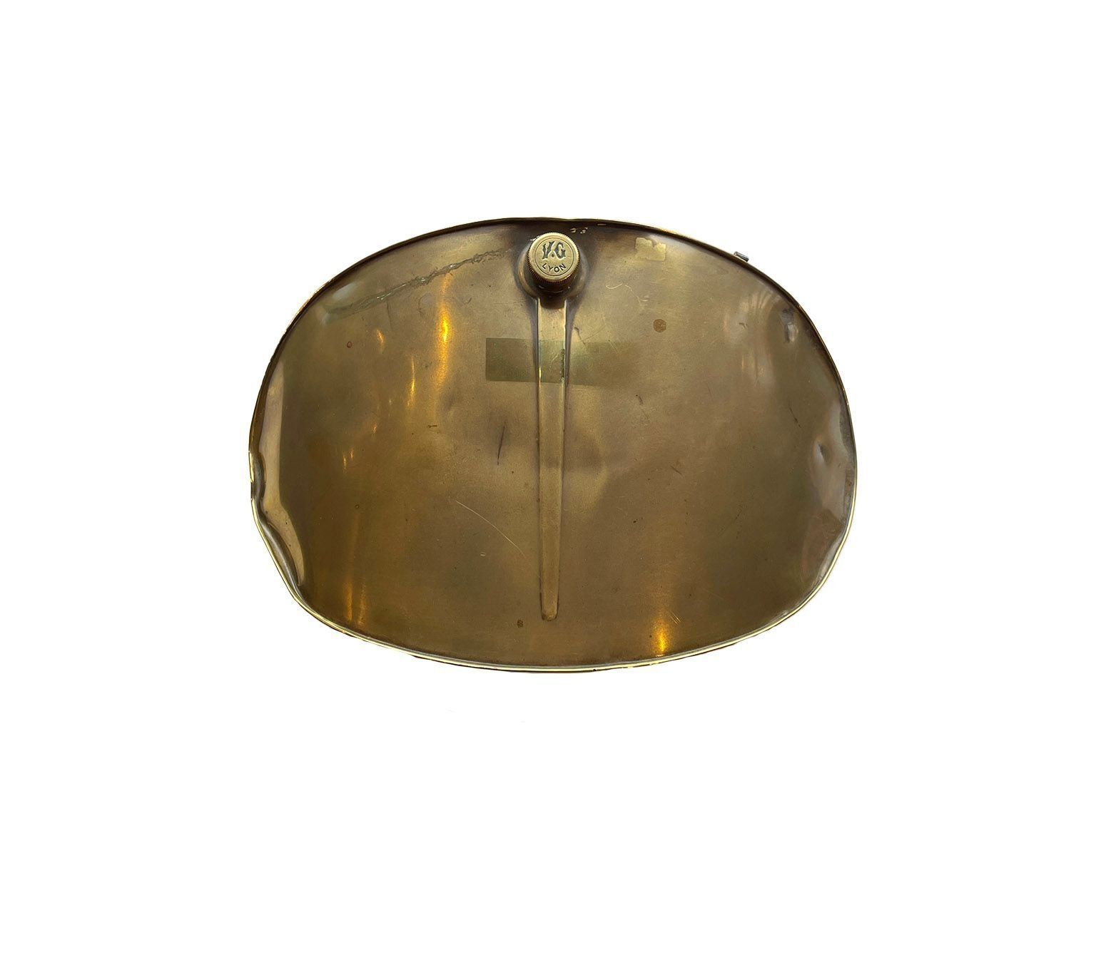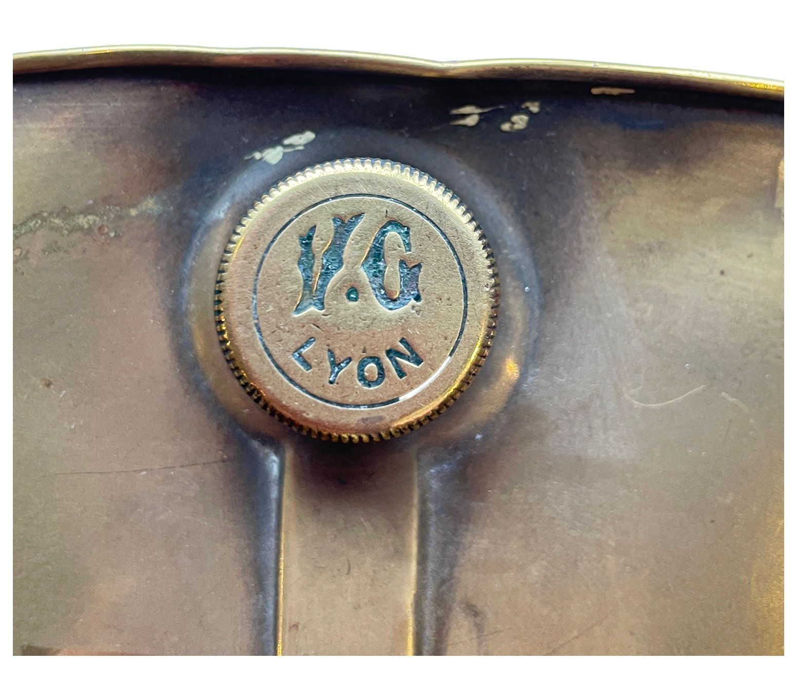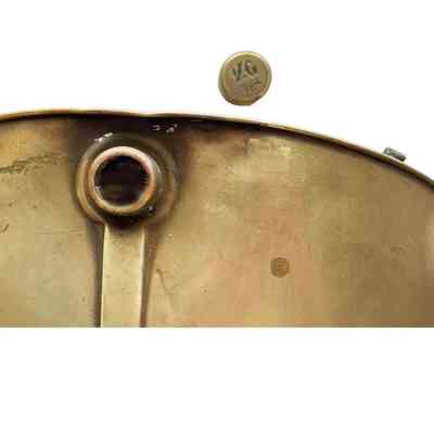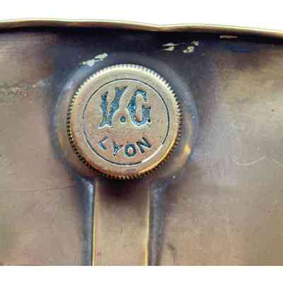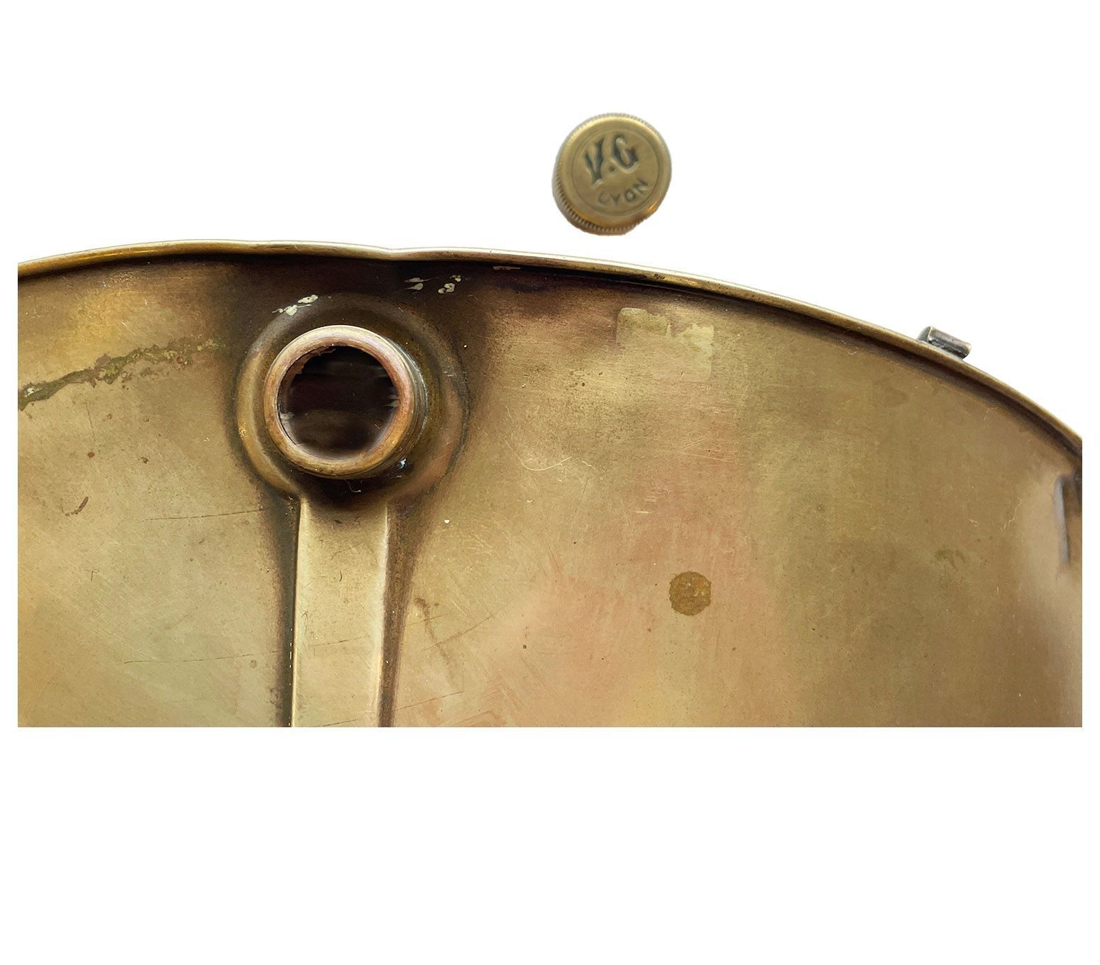 French curved oval brass water holder, with the stopper illustrating the makers mark - "VG". The remnants of two eyelets are visible along the top of the warmer.Context