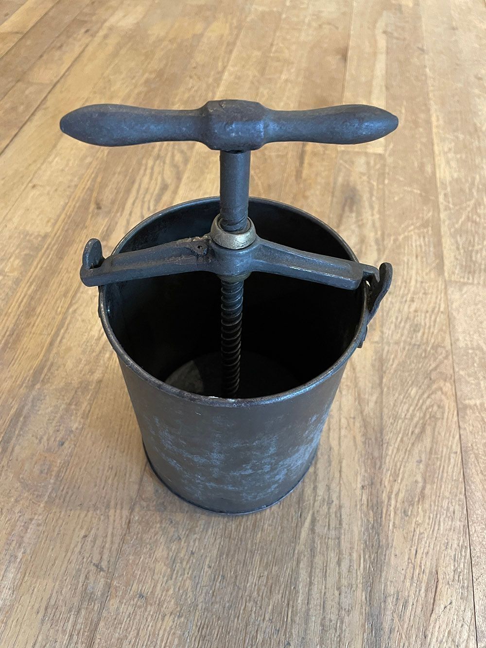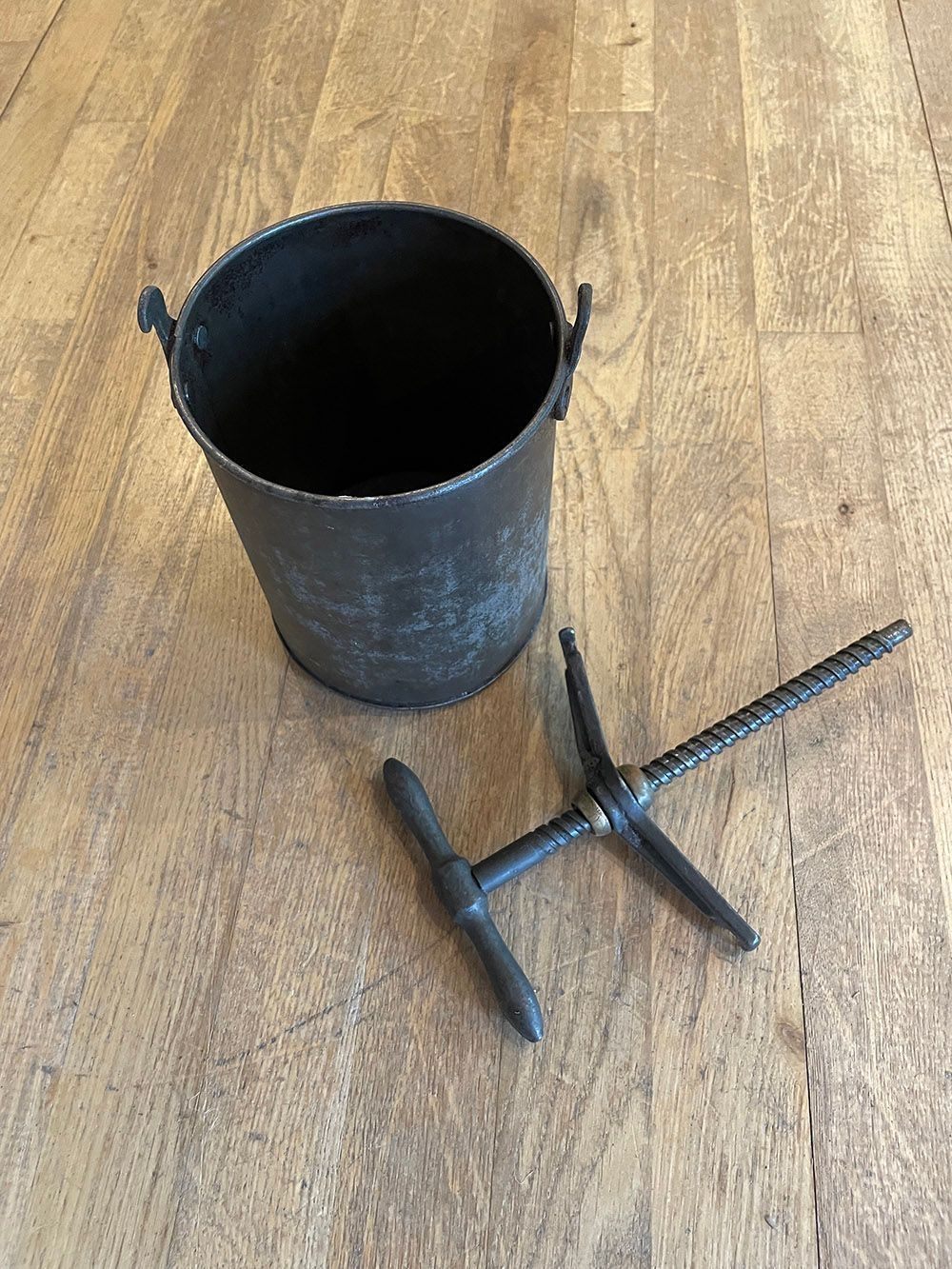A small metal bucket with a handle and screw.Context
