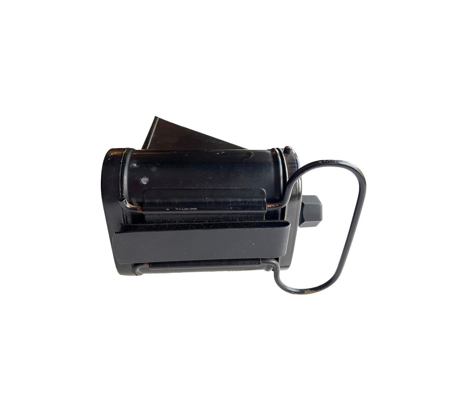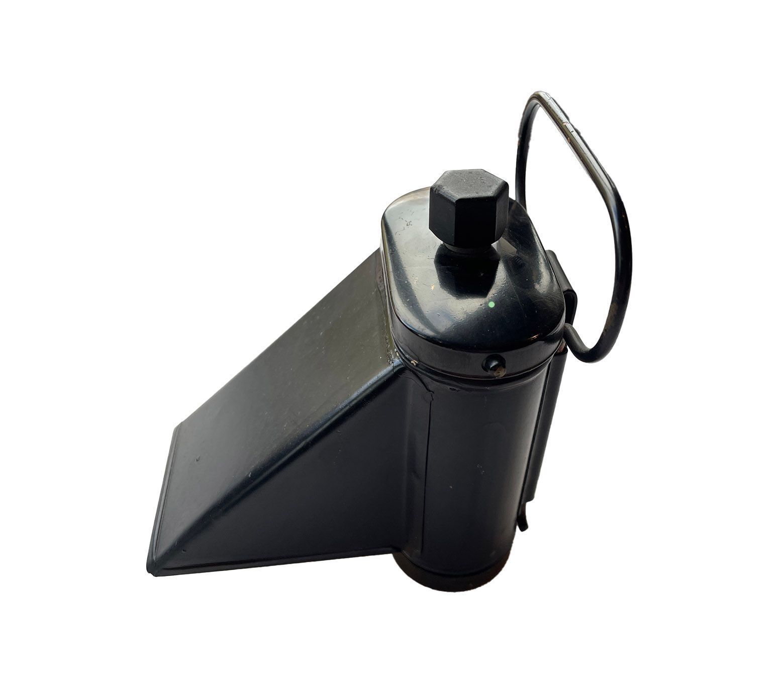 Rectangular metal torch with a wede-shaped hood over the light. Sturdy clip at the back to attach to a bicycle and a metal handle to hold the torch by. The on/off switch is on the top of the lamp.Context