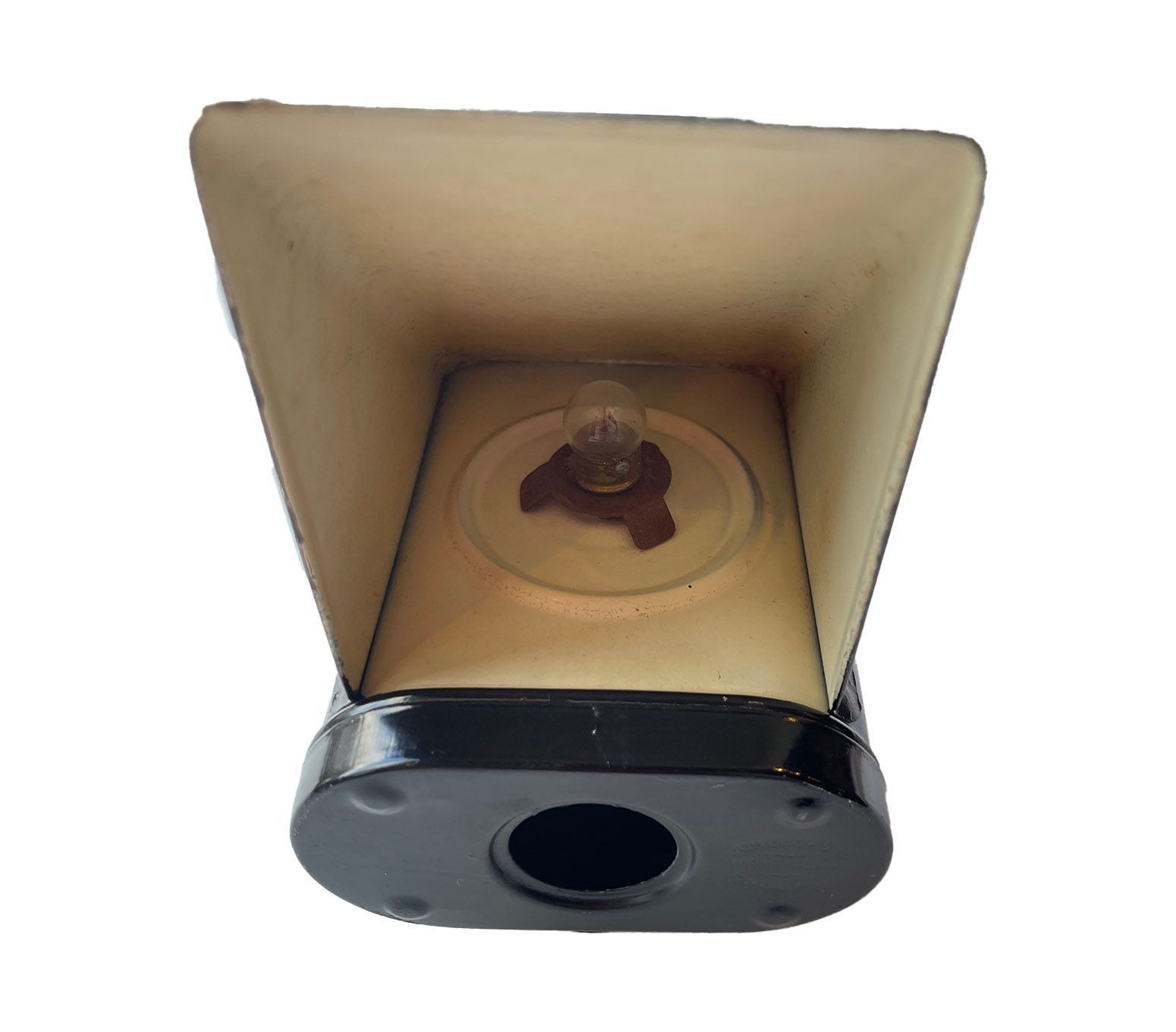 During the blackout in WW2 it was necessary to reduce any lighting to the minimum even for the essential services. This light has a fixed cover. It was to be powered by two 69R twin-cell batteries. Made by Joseph Lucas of Birmingham.