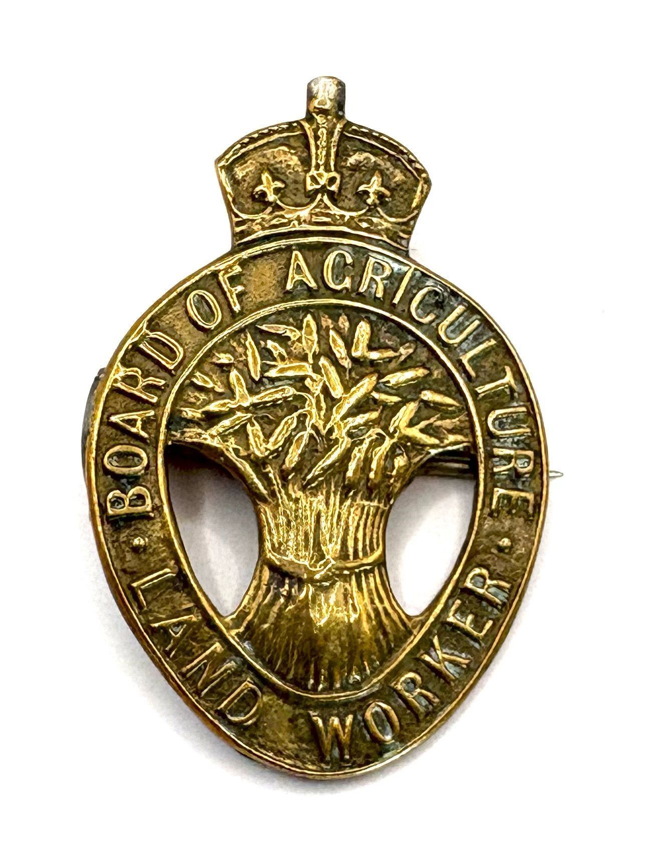 British, Board of Agriculture Land Worker's badge 1915 -16. Voided metal badge having a central motif of a bushel of wheat surrounded by an oval band bearing the inscription: 'BOARD OF AGRICULTURE LAND WORKER'. The badge is surmounted by a King's crown.Context