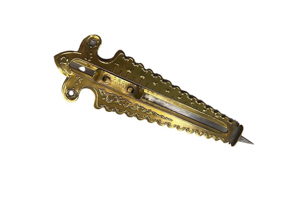 Brass and steel instrument to cut buttonholes in fabric. The blade, the point of which is visible, is retractable and can be pushed out by the slider button in the centre. The corrugated edges are marked 1 - 9 in eights of an inch.Context