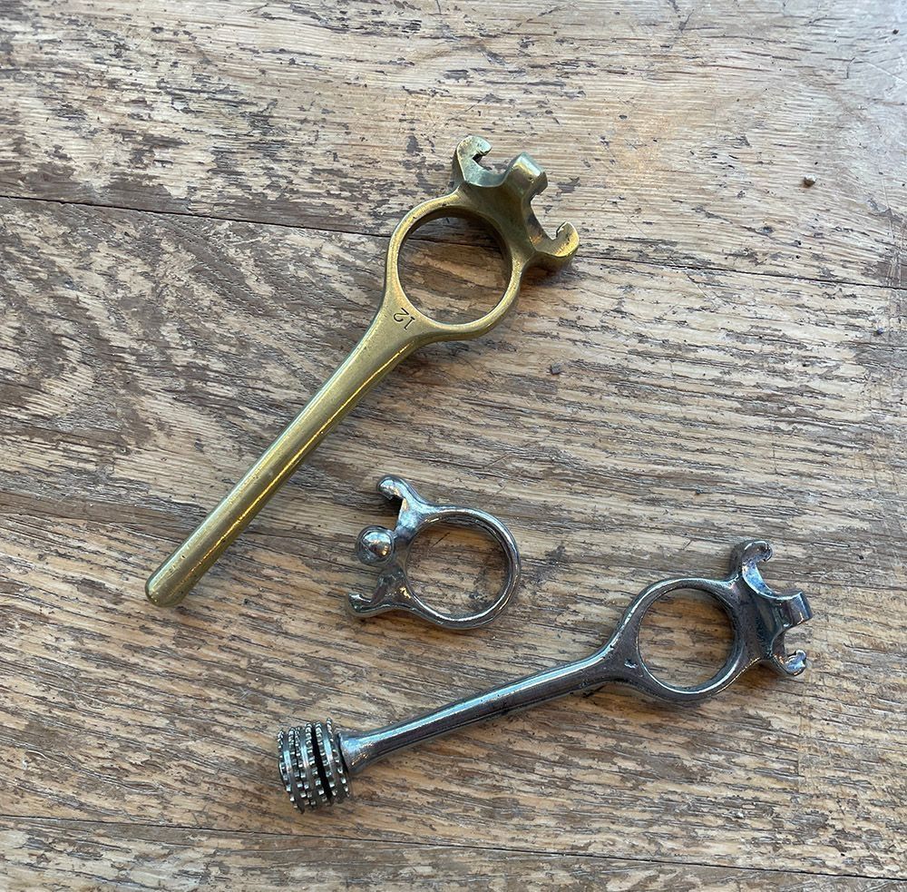 Brass extractor tool possibly made by James Dixon but not inscribed. Centre of picture small extractor known as 'ring-type'; bottom in picture is an extractor known as 'Pope's Patent'.Acquisition