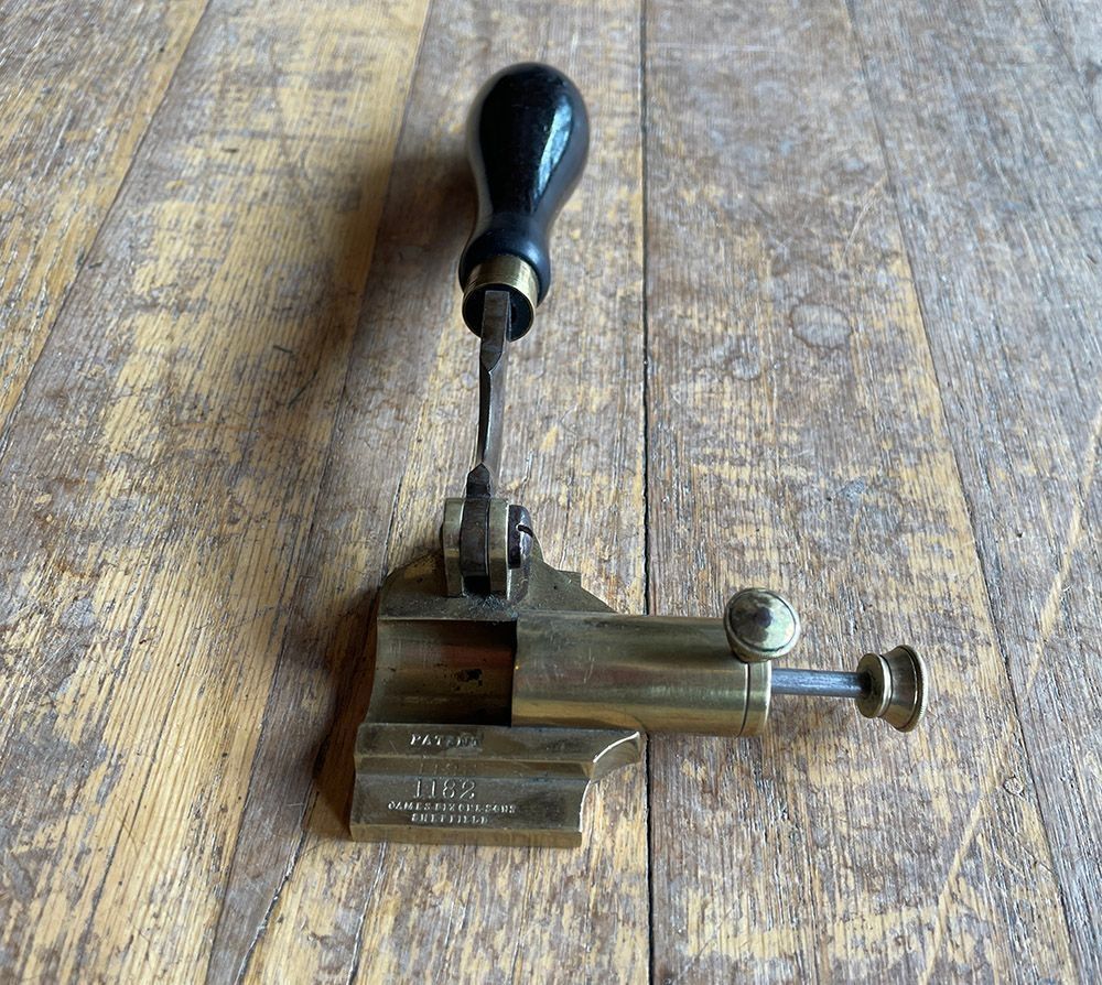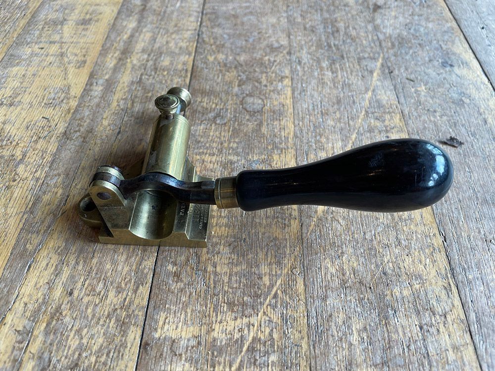 Brass case crimper by James Dixon for 577 cartridges, catalogue number 1182. Includes depth stop locking thumbscrew.Context
