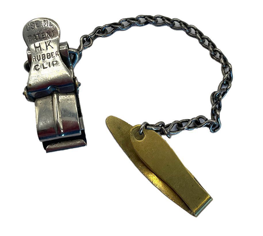 A 'chatelaine' type skirt lifter - the brass clip is slipped over the waistband and the clip can secure and pull up the skirt. The clip was clamped mid-way up the skirt. On the clip is stamped USE ME/ Patent/ H.K./ RUBBER CLIPContext