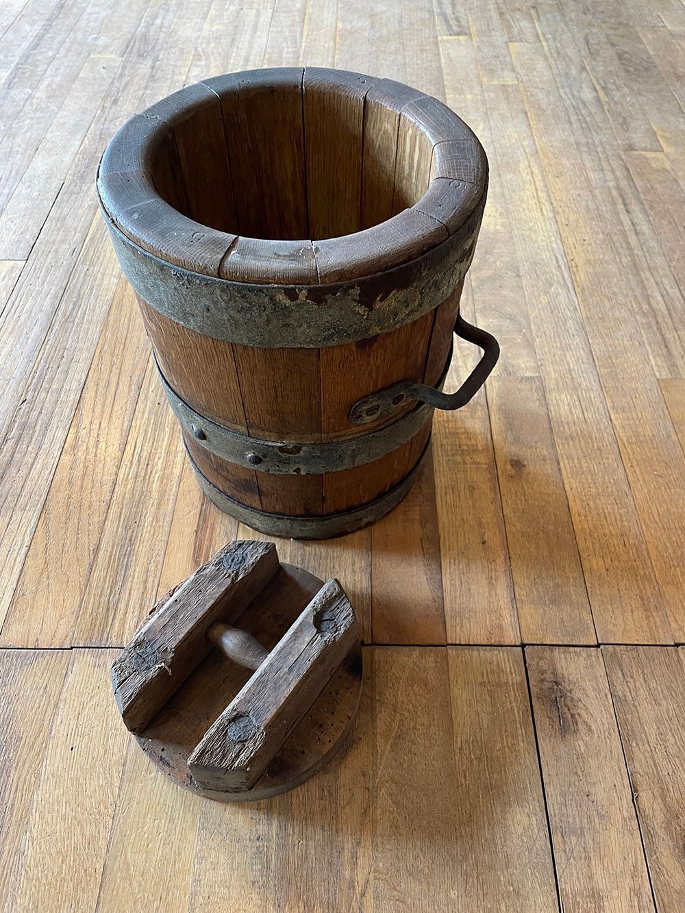 Wooden staves bucket with fitting lid and metal bands and handles.Context