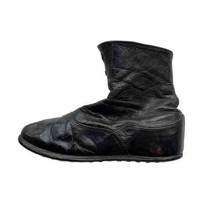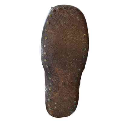 Black leather ankle boot for a child with a six button fastening. Extra leather for sole fastened with nails. These shoes both machine made and cobbled. The buttons would have most likely been glass attached to a metal shank.Context