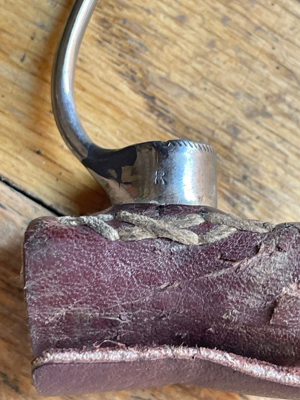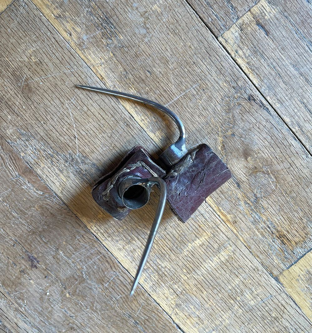 Two cockfighting spurs - long metal hooks attached to leather band to be wrapped around the cockerels leg. The metal spur has a small circular metal tube attached to a metal plate which enables it to be attached to the leather band. It is hand sewn in place. The cocks' own spur would be passed through the tube. There is some decoration on the top of the tube and an R and L to mark which leg the spur should be put on.Context