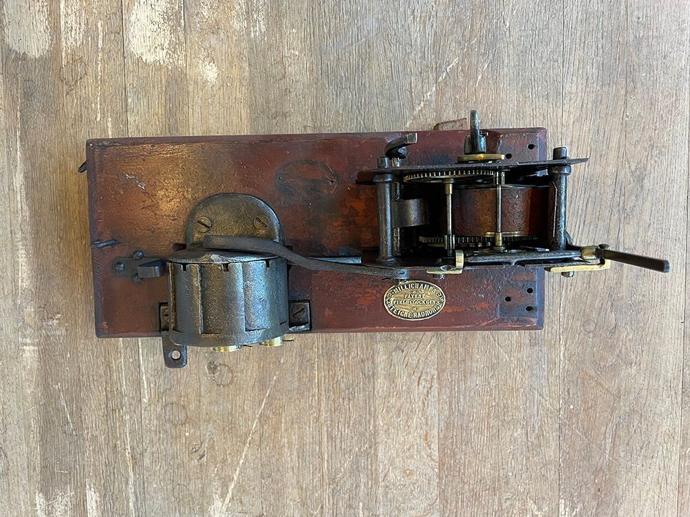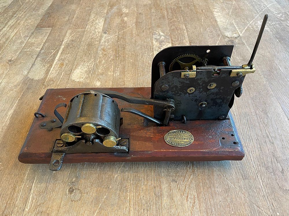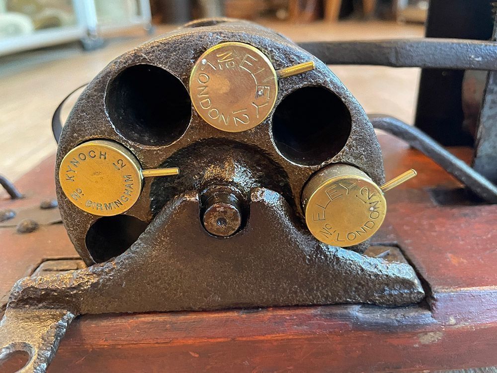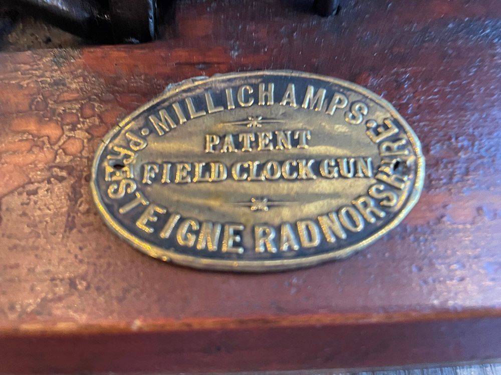 Set with 5 cartridges which were fired one every half hour. Made in 1888 by Millichamps at Presteigne Radnorshire, Wales and described as a Field Clock Gun. Charles Millichamp was a watchmaker who owned a fishing tackle shop. In 1888 Millichamp worked with William Maund who was a landowner that lived nearby in Shobdon, Herefordshire, England, to invent a new mechanical scarecrow in the form of a self-acting field clock gun. They patented this new invention on May 3, 1888. One model was made to be suspended from a tree and another had a man in silhouette in front of the mechanism. I believe this example may have lost its cover.Cataloged By