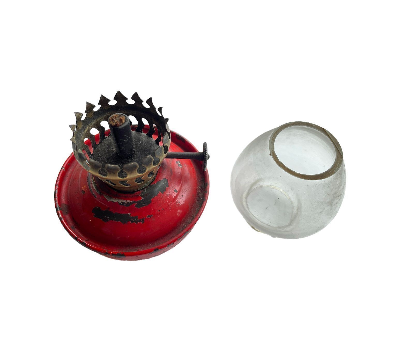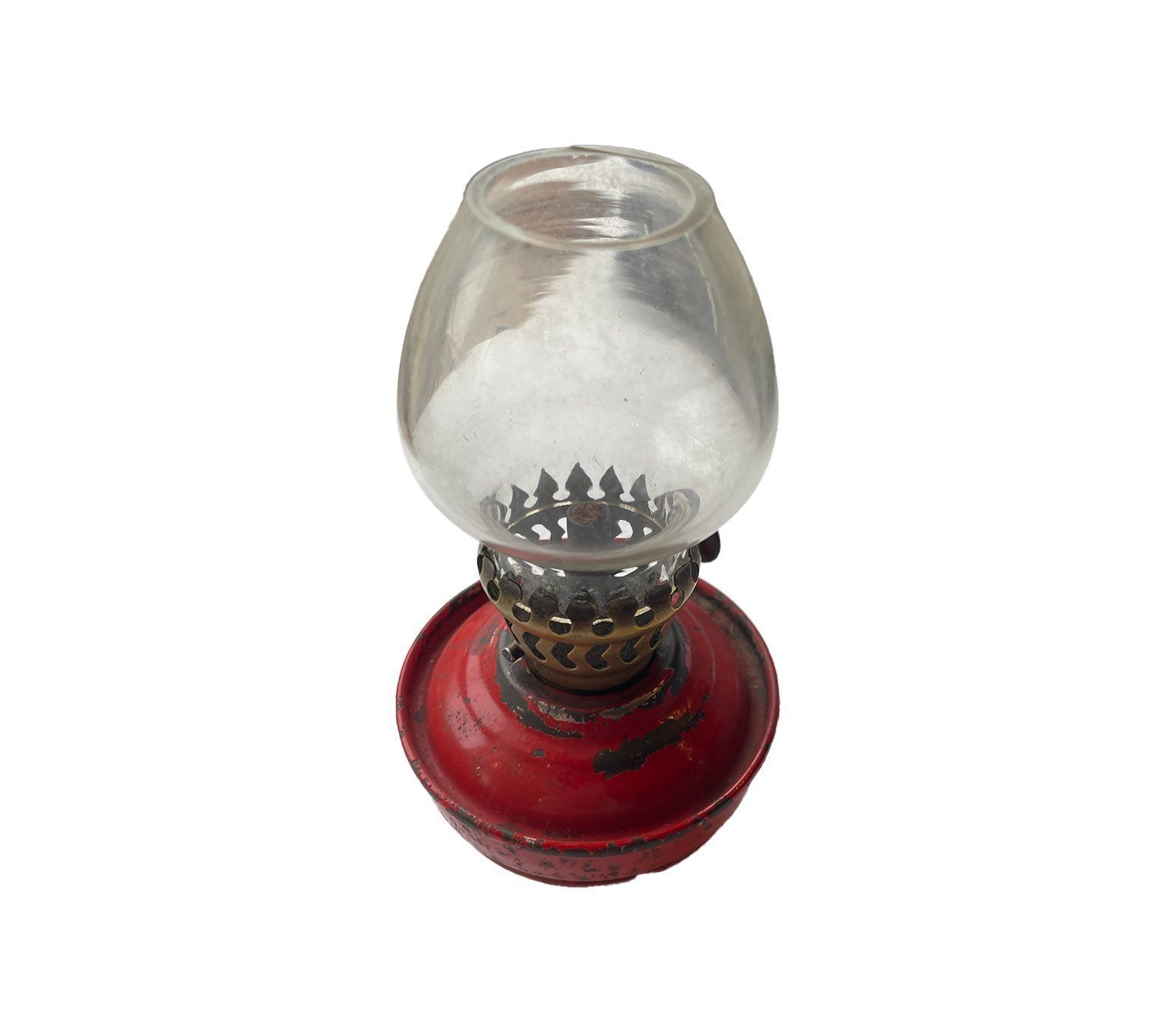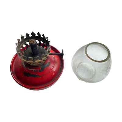 A small paraffin/kerosene weighted lamp which has an enclosed "cup" body which contains the fuel. The top wick holder, made from brass, has an extended enclosed spout which raises the wick approximately 20mm from the bottom of the holder. The wick holder screws into the top of the paraffin/kerosene reservoir bowl and has a wick adjustment screw (light control) at the side. The small clear glass light reflector bulb nestles securely onto the wick holder and is kept snug by snap designed extending "fingers". The section between the bottom of the refractive glass "light" bowl and the top of the kerosene bowl has perforations to allow air passage to feed directly to the wick.The light refracting bulb is open at the top to allow heat and smoke from the burning wick to escape upwards. The weighted base of the lamp was to ensure it would not topple over.Cataloged By