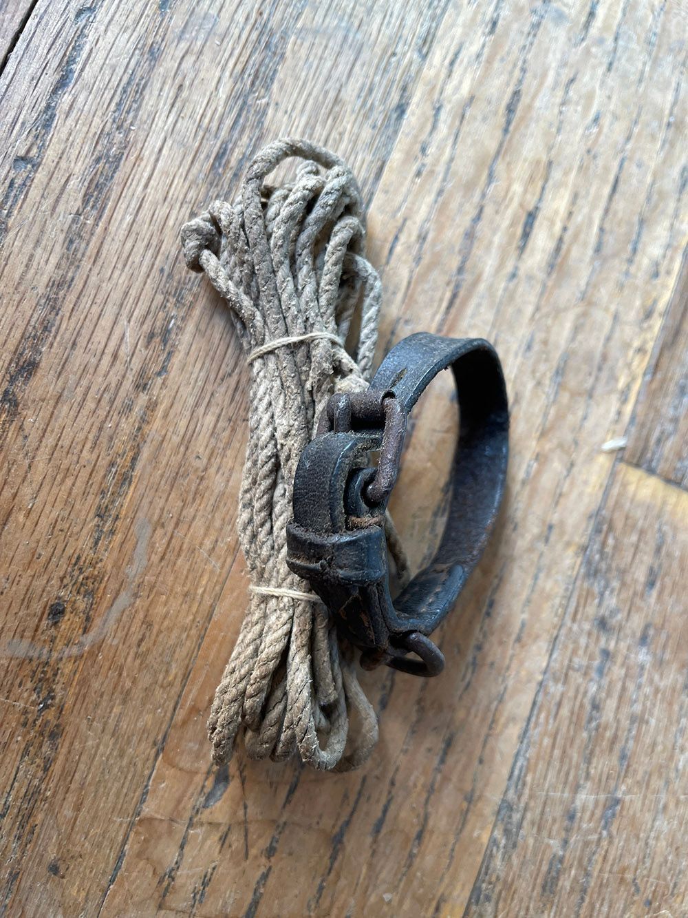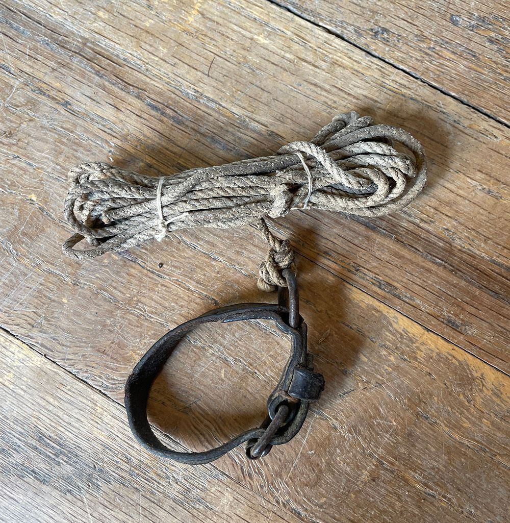 Leather collar, with metal buckle, attached to a length of thin rope.Context